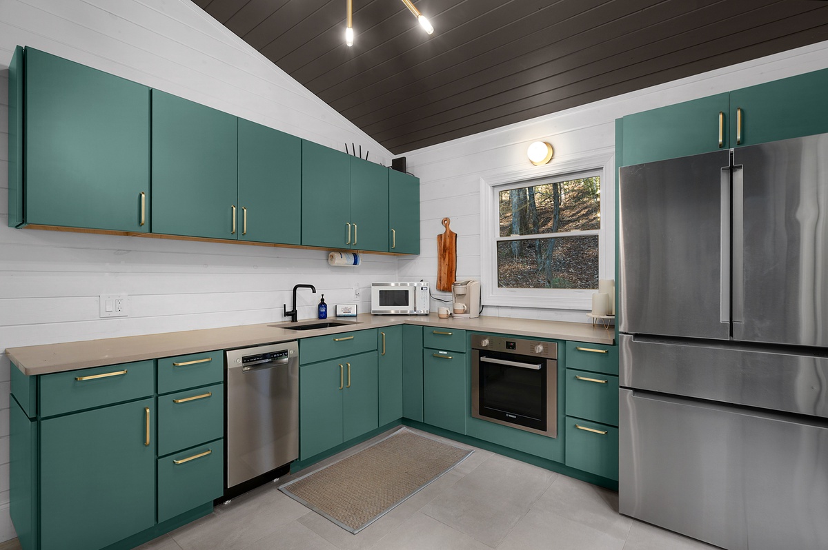 The kitchen is equipped with a refrigerator, dishwasher, oven, and microwave. Please note that this property does not have a stovetop.
