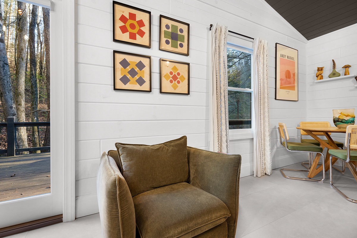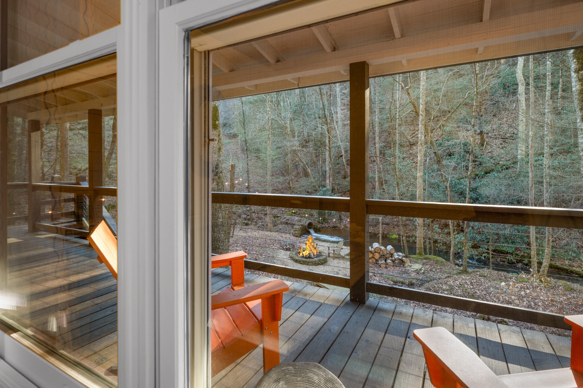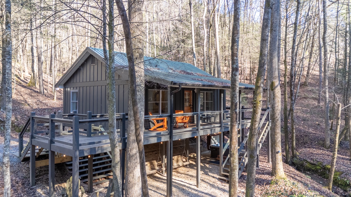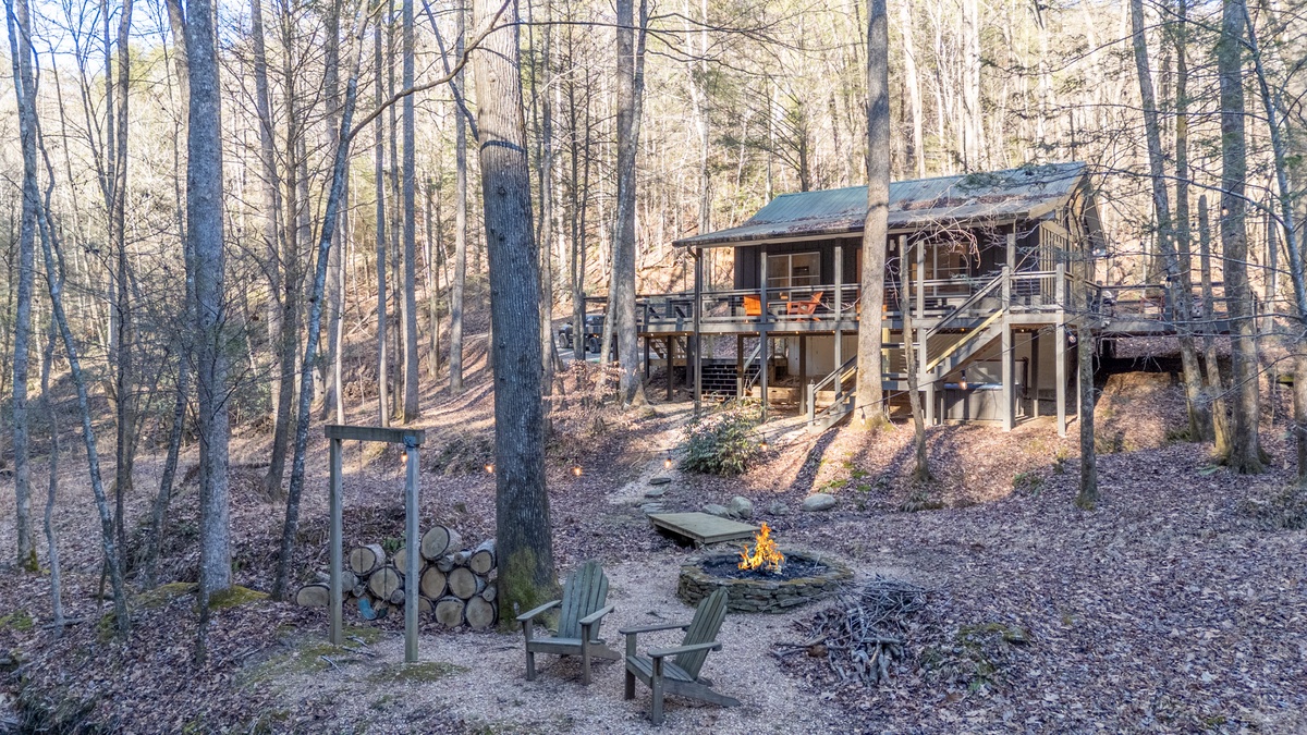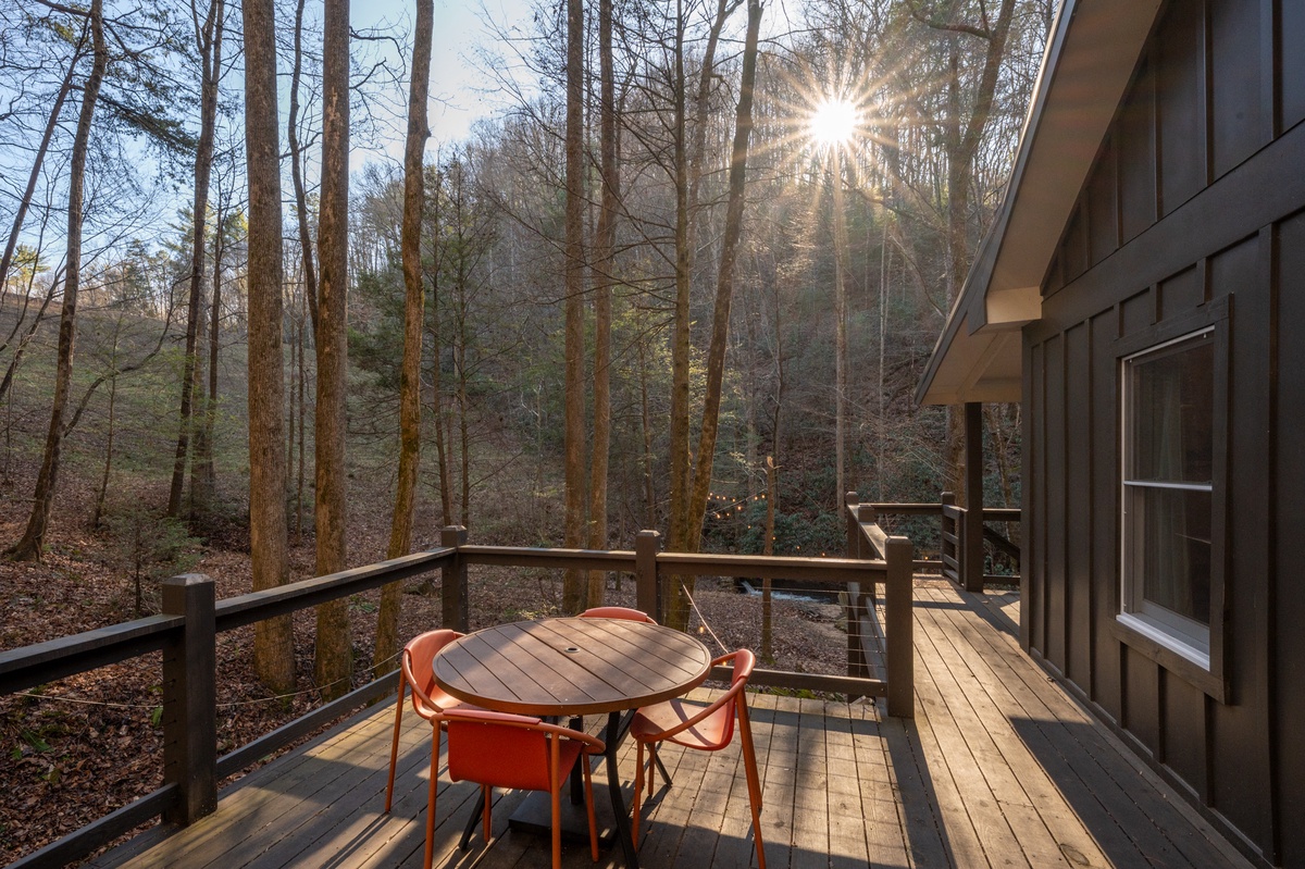 706 On The Creek is a distinctive creekfront cabin set on a private 3-acre lot, offering a bold and creative space with a high-end 1950s, Mid-century modern-inspired vibe. This thoughtfully designed cabin blends modern comforts with artistic style, creating a stay that feels truly unique.