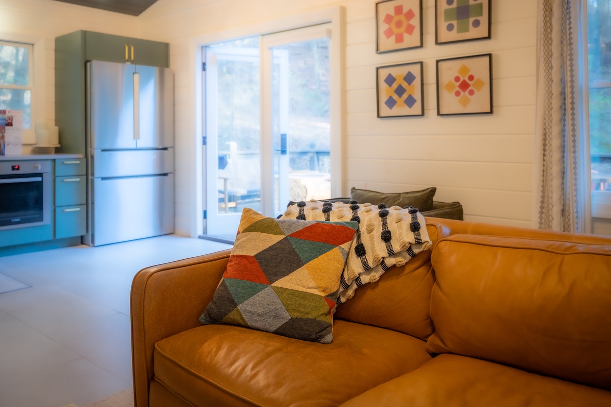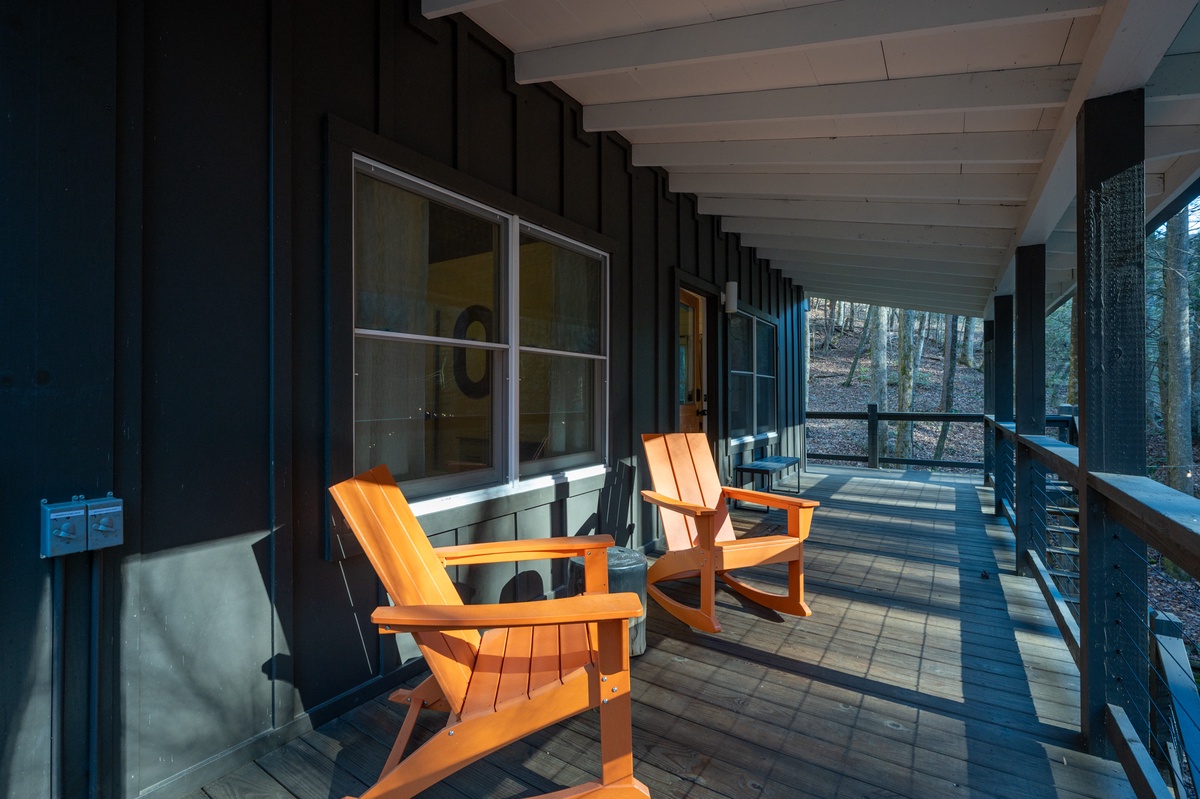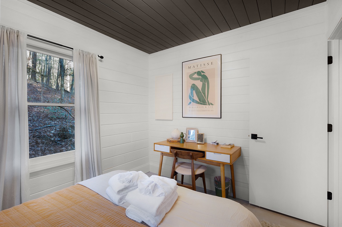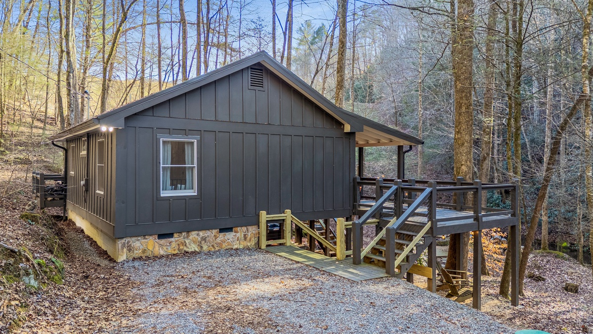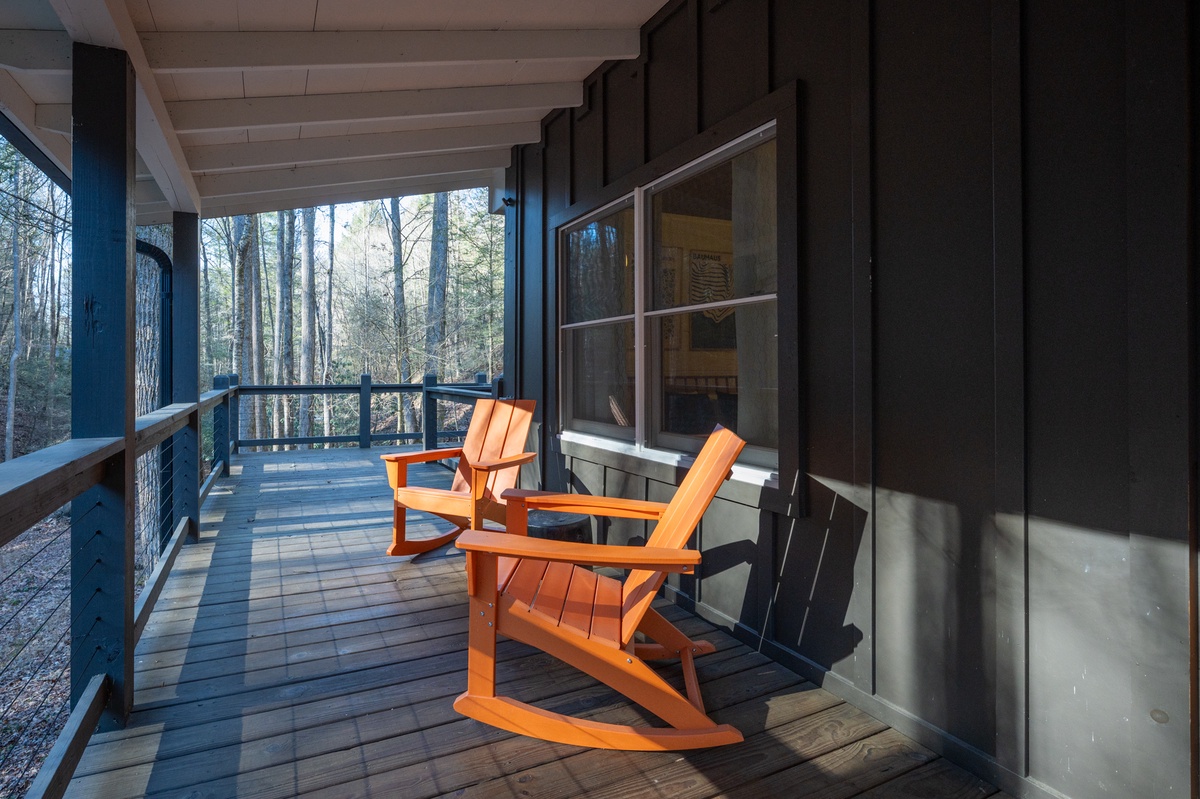 706 On The Creek is a distinctive creekfront cabin set on a private 3-acre lot, offering a bold and creative space with a high-end 1950s, Mid-century modern-inspired vibe. This thoughtfully designed cabin blends modern comforts with artistic style, creating a stay that feels truly unique.