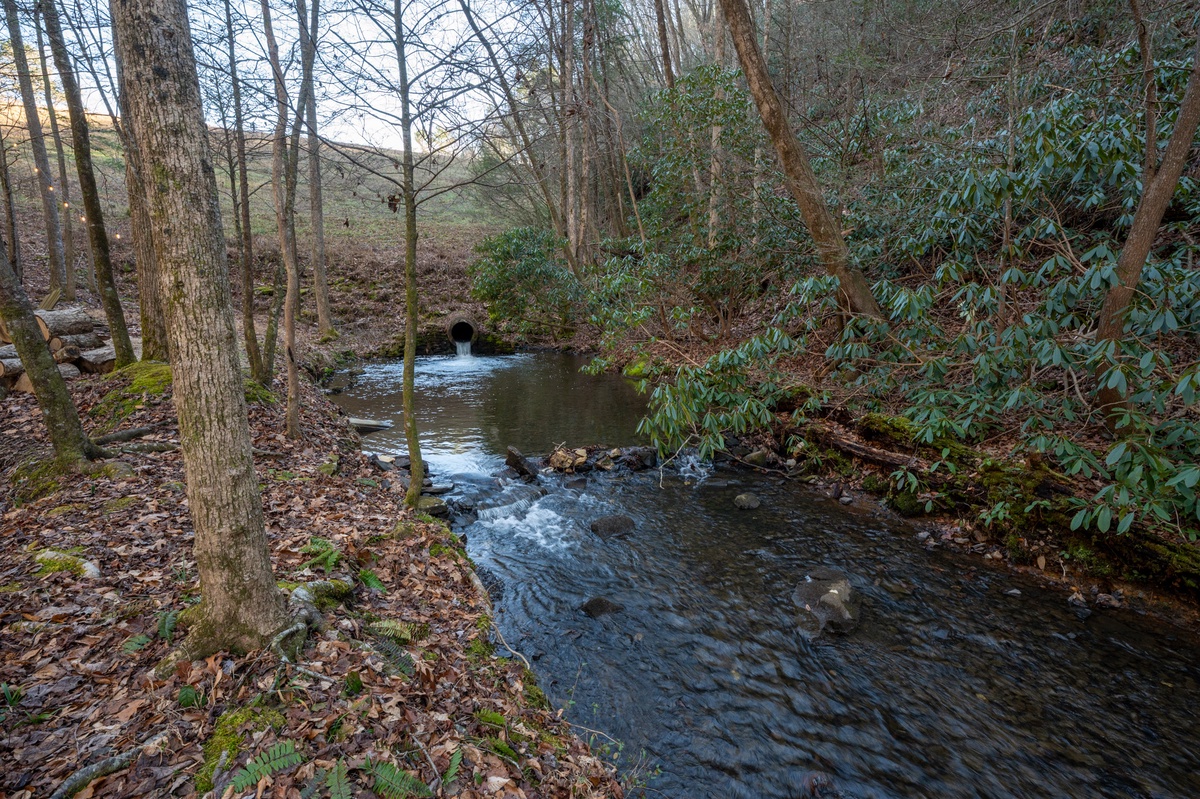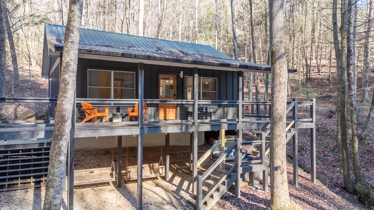 The grounds extend down to the water and include a creekside fire pit, a playground swing, four wooden Adirondack chairs, and direct access to the creek, all set within the peaceful 3-acre creekfront property.