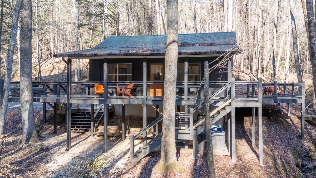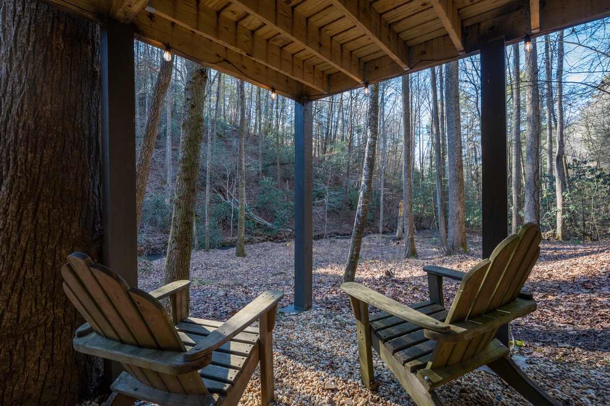 Outdoor spaces are designed to fully enjoy the creekside setting. The entry-level deck features a gas grill, outdoor couch seating, a custom log gas firepit table, an outdoor dining table for four, and two rocker chairs. The lower-level deck includes a hot tub for four and two swing benches overlooking the creek.