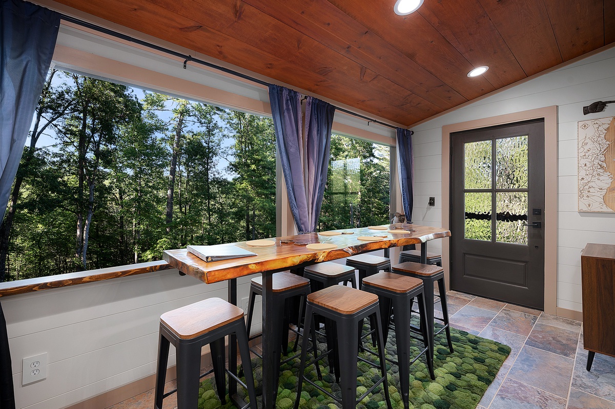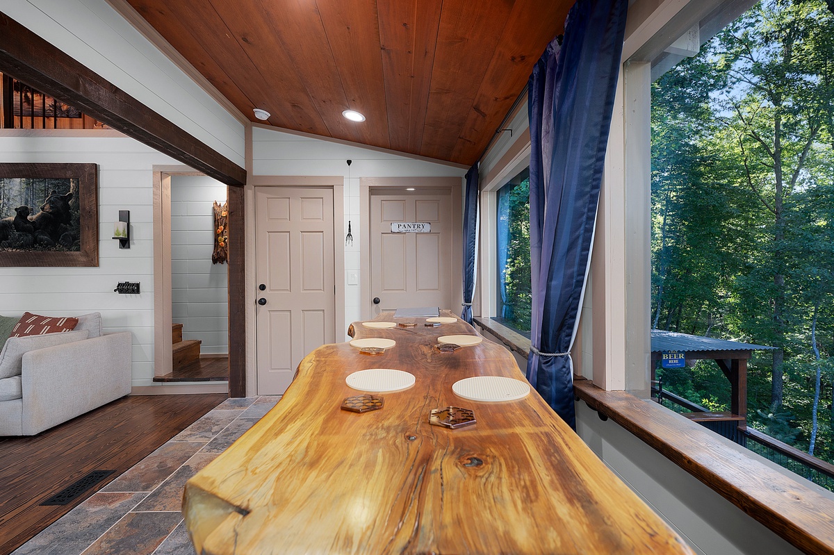 Nearby, a spacious dining table for eight overlooks the trees and mountain ridges outside and doubles as your hub for family meals, card games, and good conversation. There’s even a dedicated cocktail station nearby to shake up your favorite mountain sips.