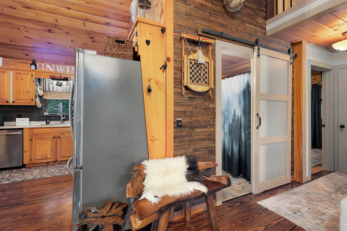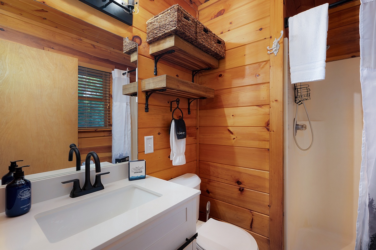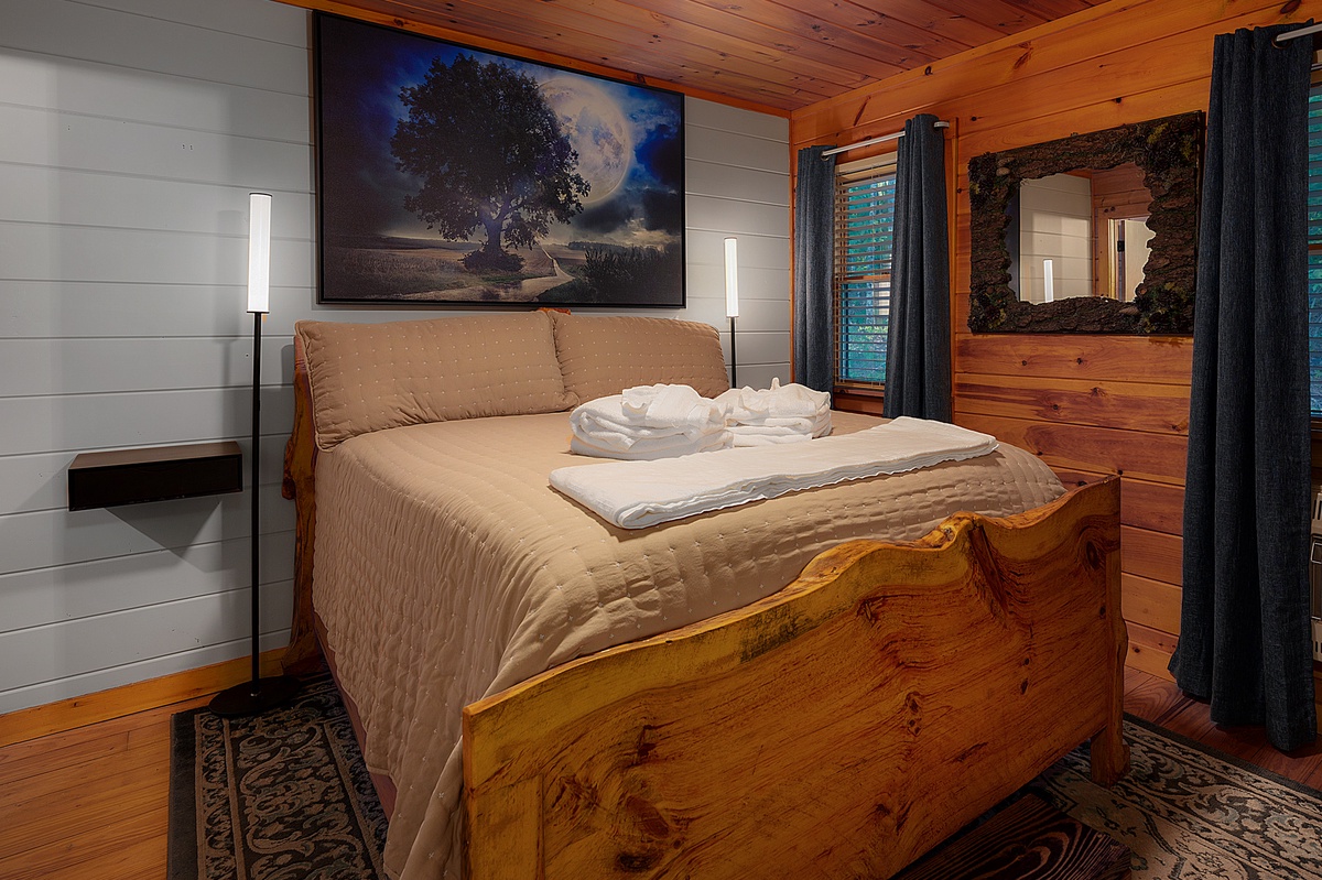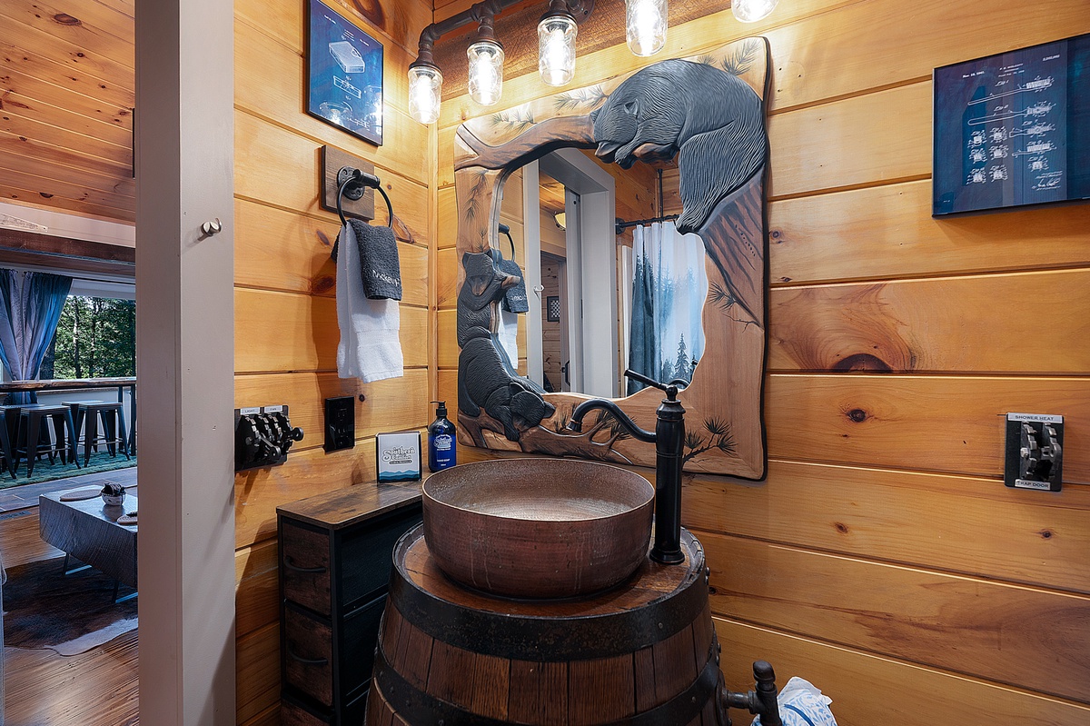 The primary queen suite offers privacy and comfort with a Roku TV, walk-in closet, and ensuite bath, while a second queen bedroom and cozy upstairs loft with another queen bed give your group plenty of space to spread out. A second full bathroom features a one-of-a-kind barrel vanity and rustic lodge décor, including a carved bear mirror that adds a playful, handcrafted vibe