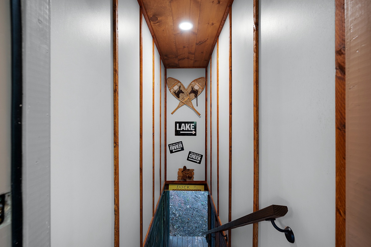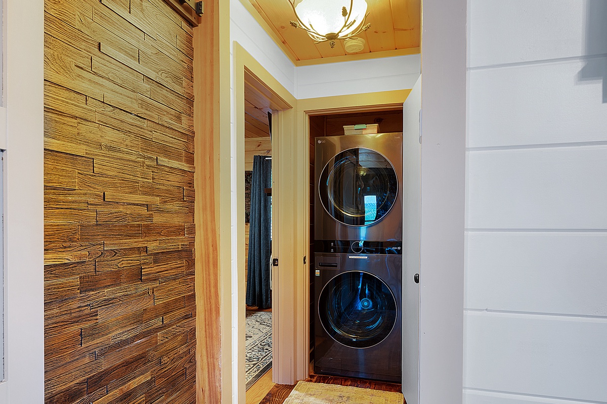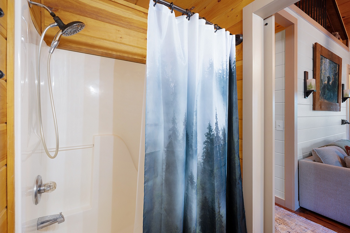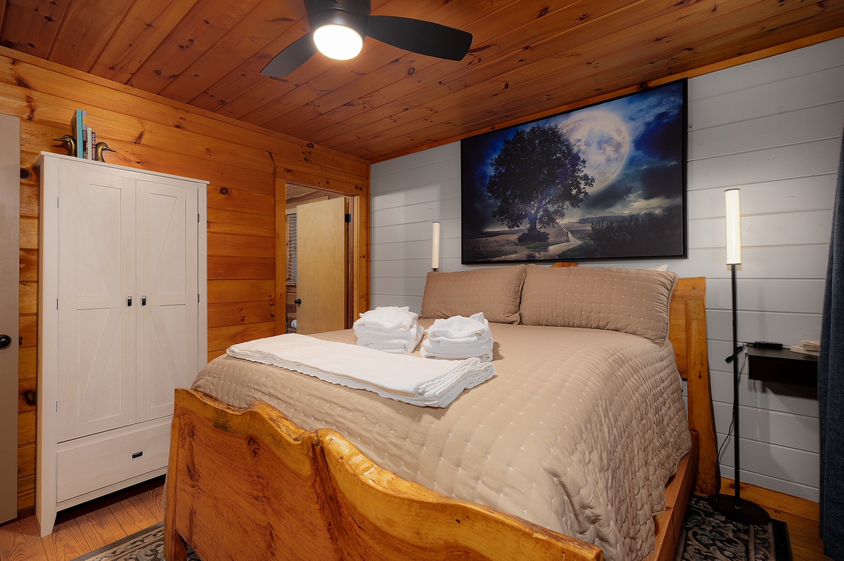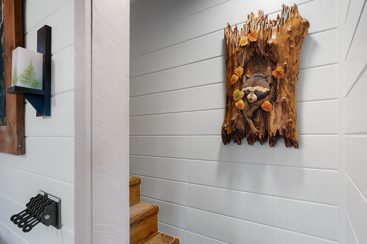 The primary queen suite offers privacy and comfort with a Roku TV, walk-in closet, and ensuite bath, while a second queen bedroom and cozy upstairs loft with another queen bed give your group plenty of space to spread out. A second full bathroom features a one-of-a-kind barrel vanity and rustic lodge décor, including a carved bear mirror that adds a playful, handcrafted vibe