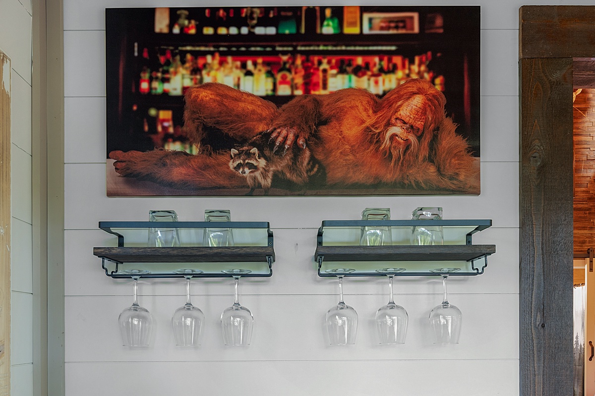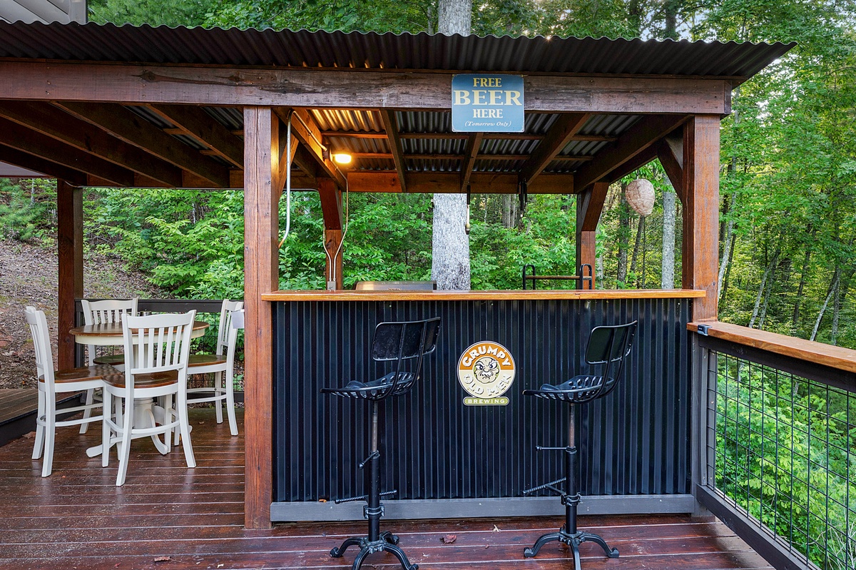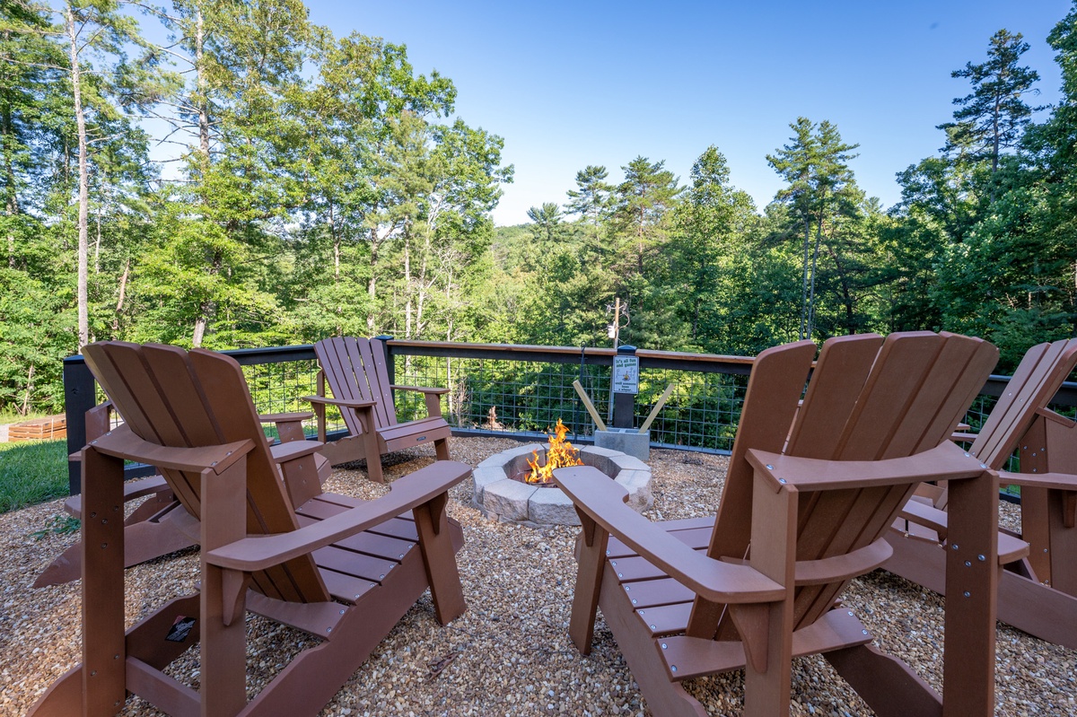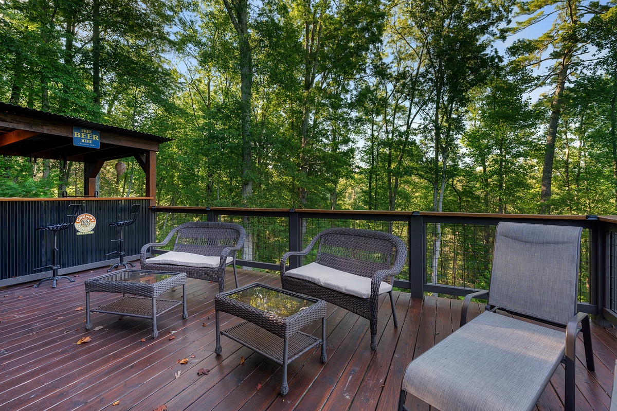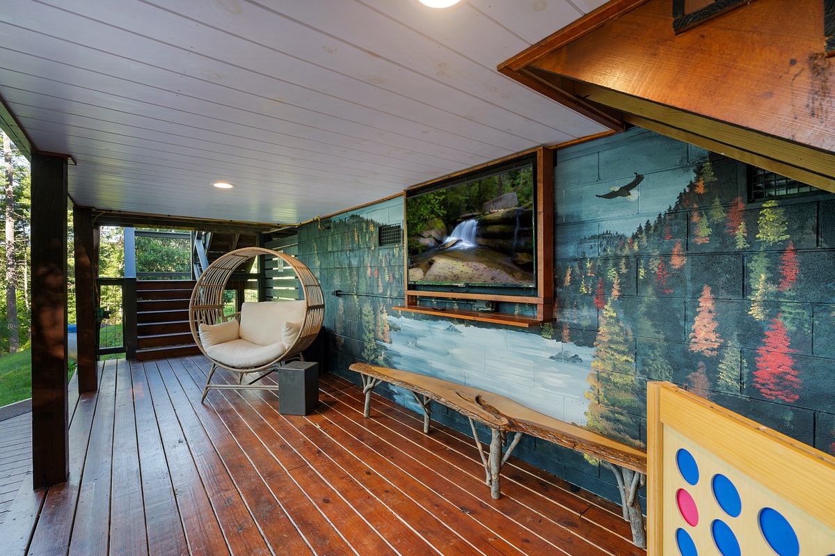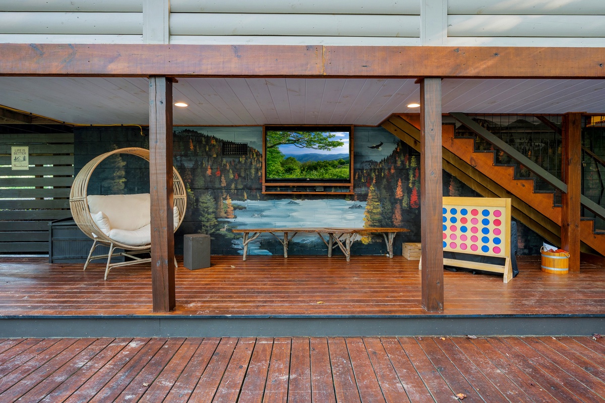 Head down to the lower level and you’ll find an outdoor living room, complete with comfy seating, a 52-inch Roku TV framed by a custom mountain mural, a dry bar with rotating stools, and a grill for cookouts. Enjoy meals al fresco at the second dining table or wind down by the firepit under the stars, surrounded by six Adirondack chairs and the soothing sounds of the woods.