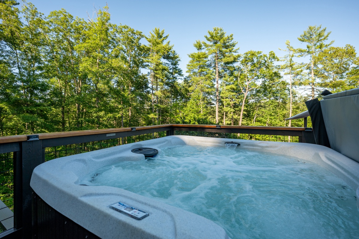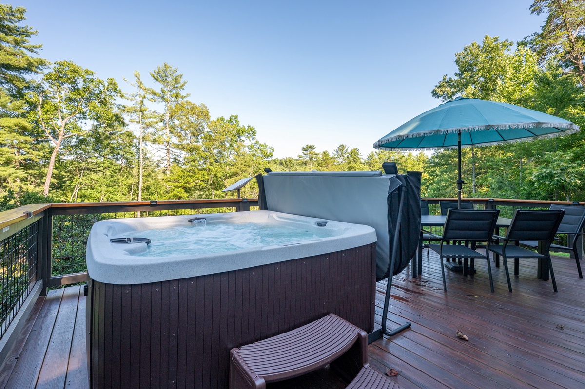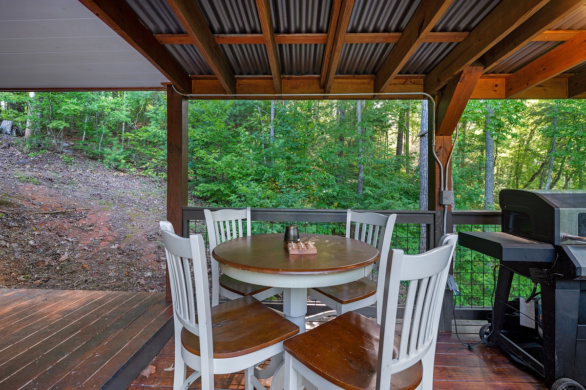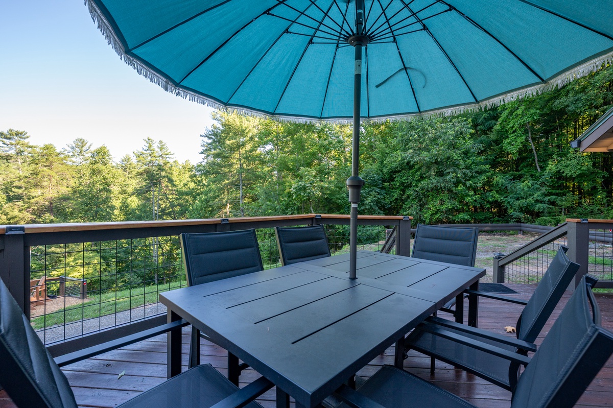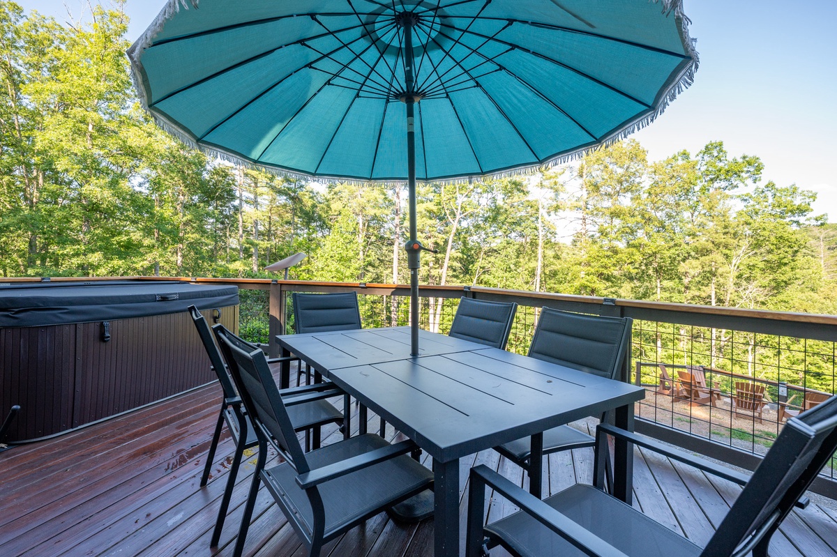 Outside, the fun continues with not one, but two spacious decks. The upper deck features a dining table for six, a bubbling hot tub, and beautiful views that go beyond the woods. You can spot three different mountain peaks on the horizon. At night, the peaceful sounds of the Toccoa River rise up from below, creating the perfect mountain soundtrack.