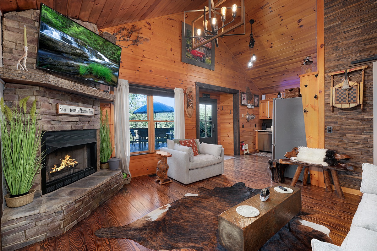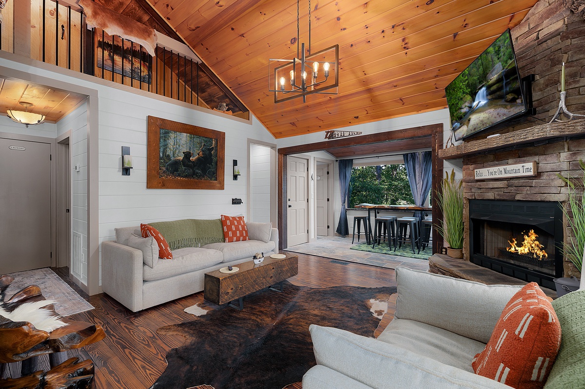 Step inside and feel right at home in the open-concept living room with angled ceilings, natural wood accents, and a statement wood-burning fireplace that sets the mood for your stay. Curl up on the plush couch then settle in for movie night on the 52-inch Roku Smart TV, ready for all your favorite streaming services. Don’t miss the details. The custom industrial steampunk light switches add a bold, one-of-a-kind touch to the space.