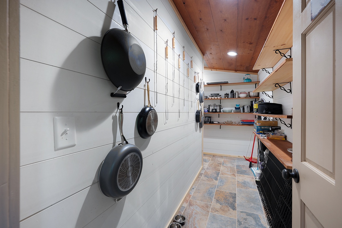 The adjacent kitchen is fully equipped for anything from a quick breakfast to a hearty homemade dinner, with stainless steel appliances, a Keurig, and a charming retro-style microwave that gives the space an extra pop of personality.