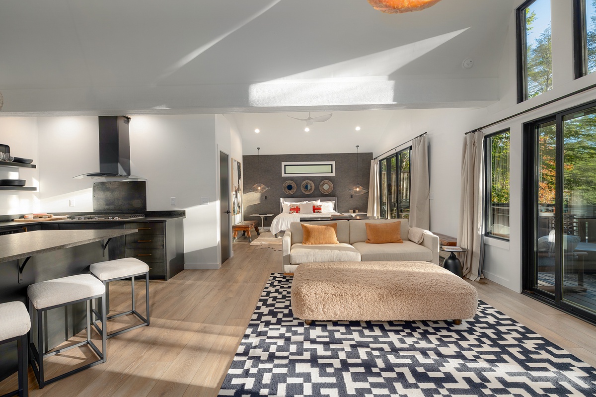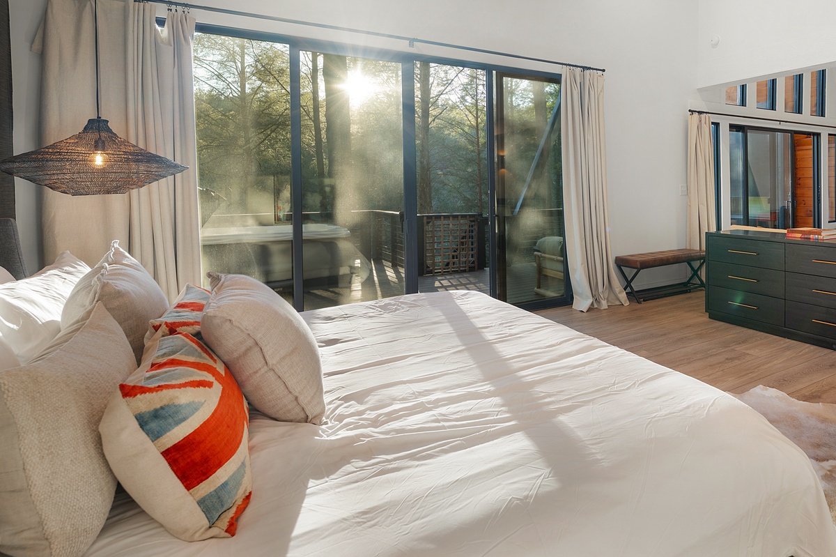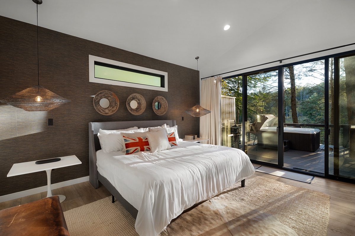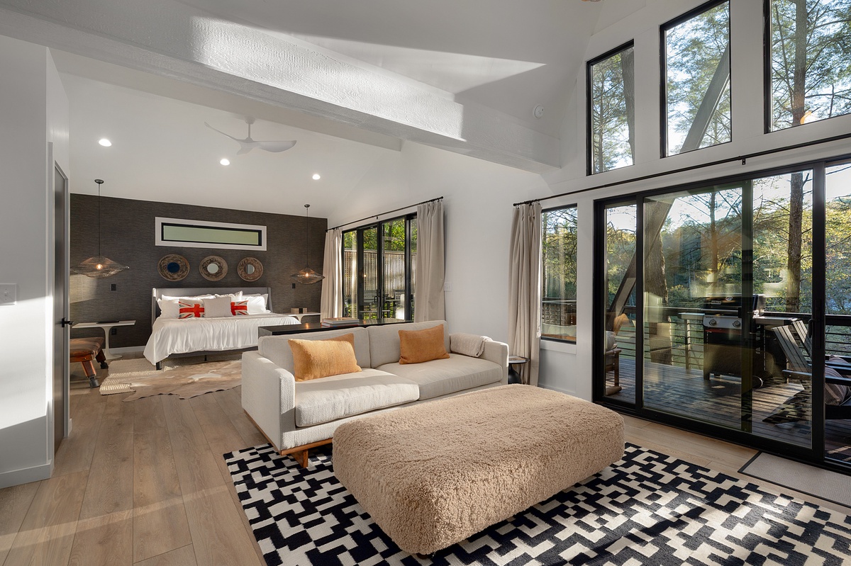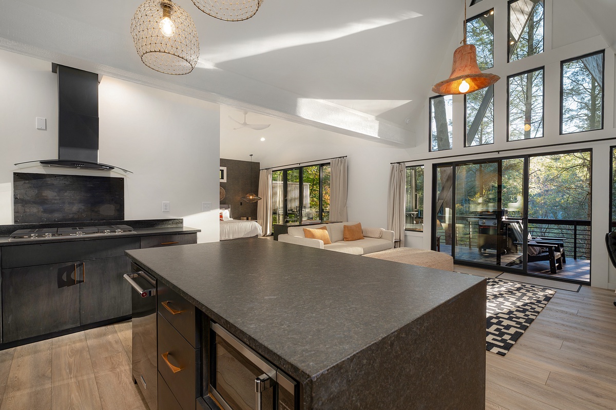 Step inside and you’ll be greeted by soaring ceilings, dramatic windows, and a flood of natural light showcasing the beauty of the surrounding forest. The layout flows effortlessly, from the fully equipped kitchen and cozy sitting area to the plush king bed that takes center stage beneath the soft glow of custom hanging lamps. The living space features a leather seating area, Smart TV, and a small workspace that lets you stay connected while surrounded by nature.