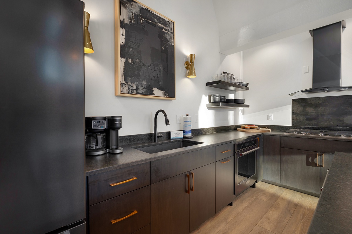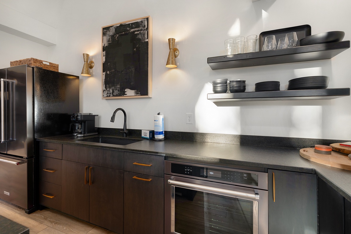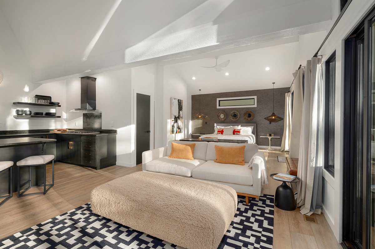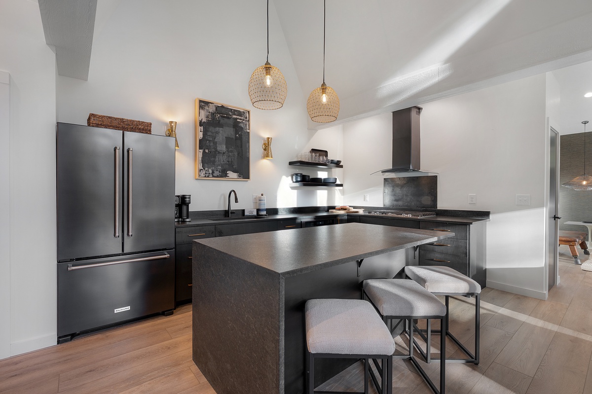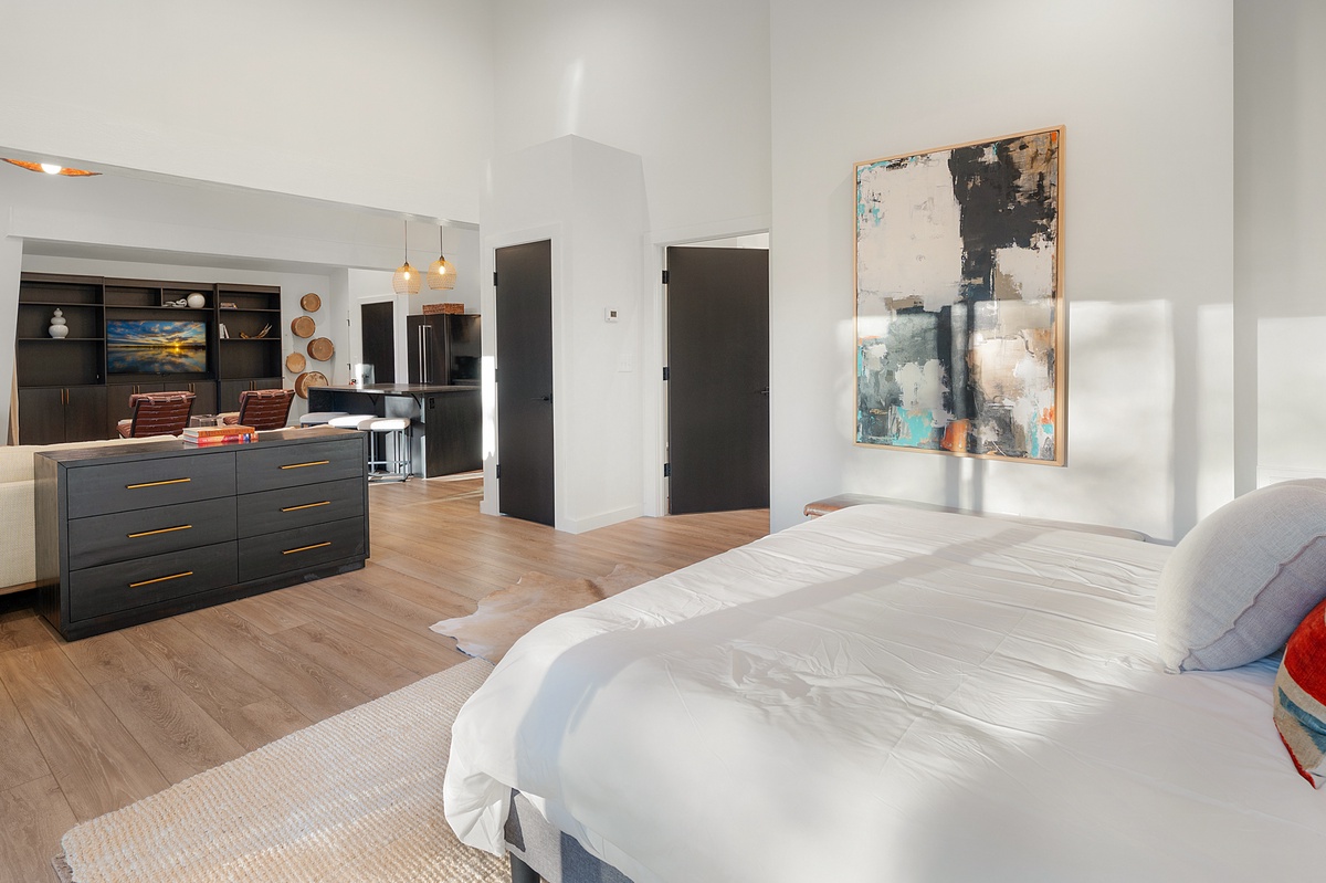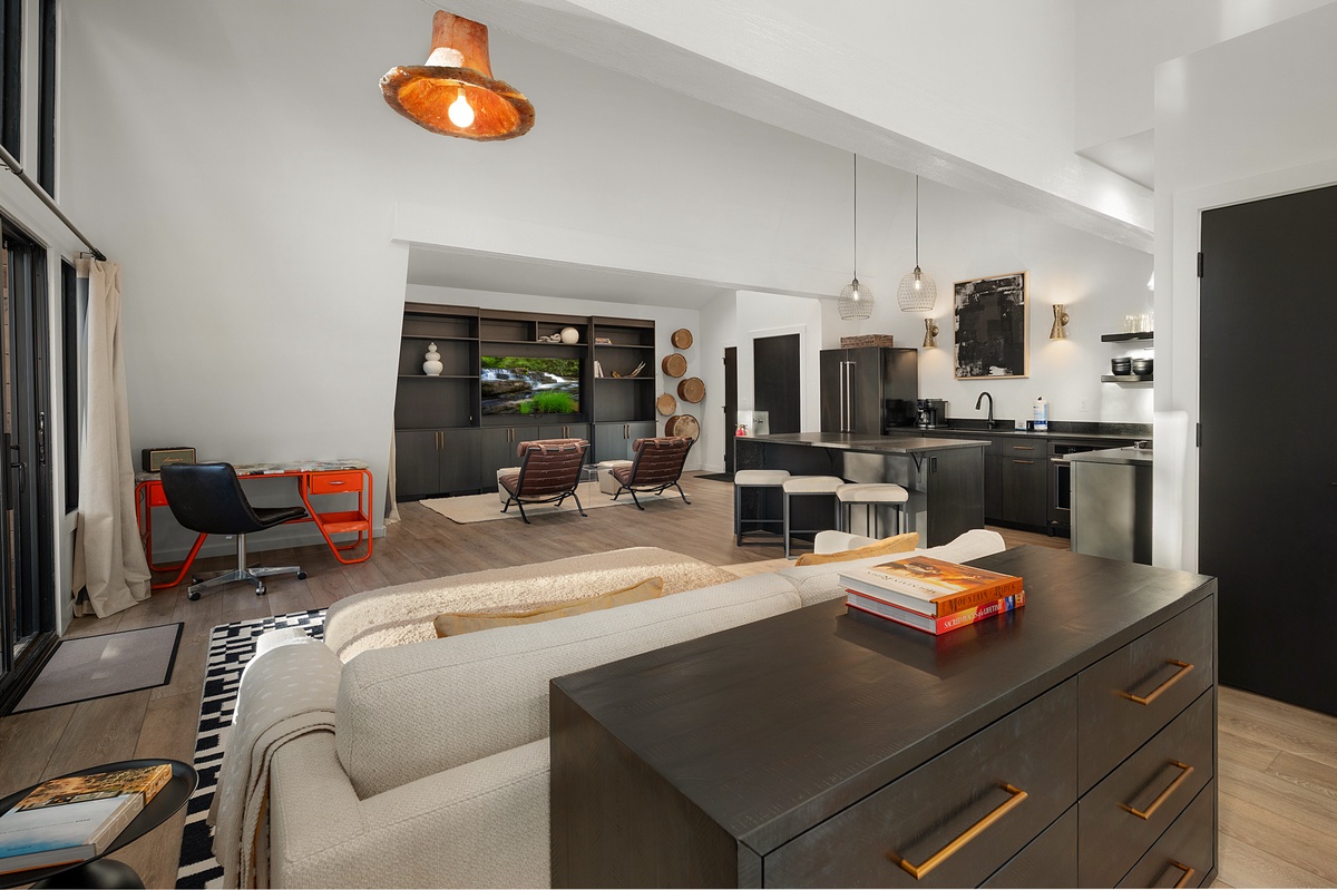 Step inside and you’ll be greeted by soaring ceilings, dramatic windows, and a flood of natural light showcasing the beauty of the surrounding forest. The layout flows effortlessly, from the fully equipped kitchen and cozy sitting area to the plush king bed that takes center stage beneath the soft glow of custom hanging lamps. The living space features a leather seating area, Smart TV, and a small workspace that lets you stay connected while surrounded by nature.