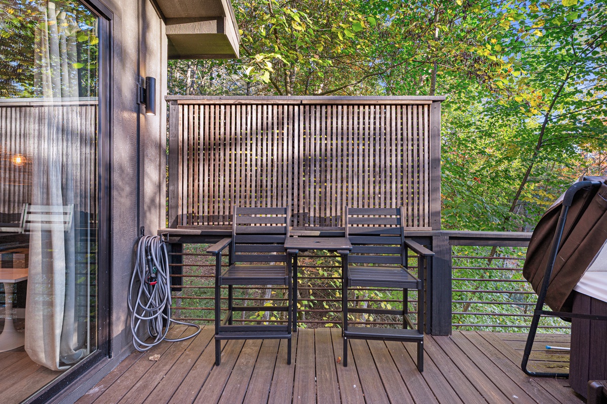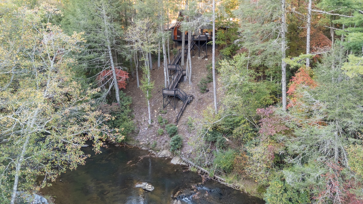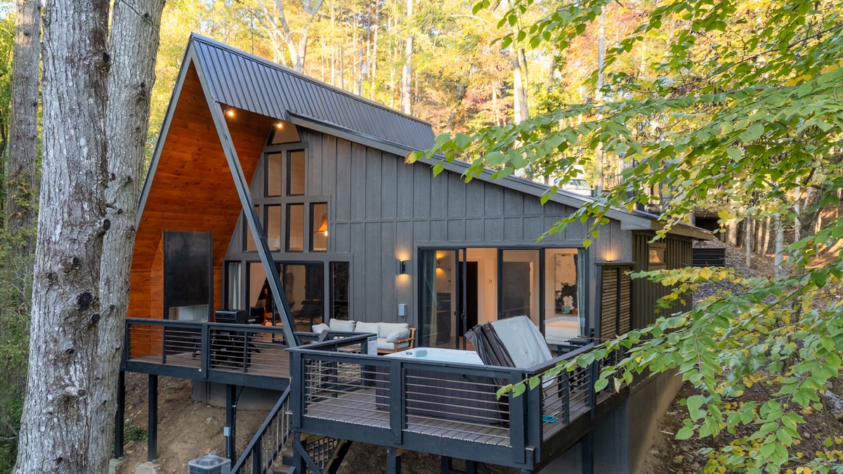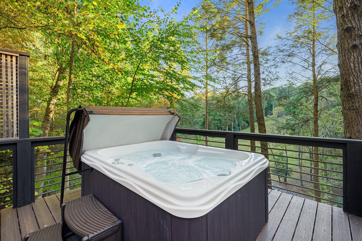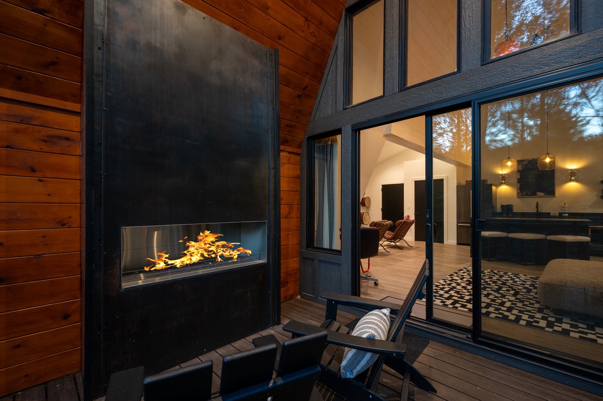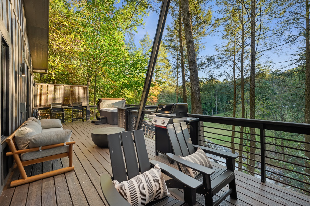Outside, the deck is designed for relaxation and connection. Enjoy a soak in the bubbling hot tub, grill your favorite meal, or gather around the stone gas fireplace as the evening settles in. Plush outdoor seating and a peaceful view of the trees create the perfect backdrop for morning coffee or a nightcap under the stars. Follow the stairs down to a small dock overlooking the creek, where you can pause and let time slow down, just as this cabin’s name promises.