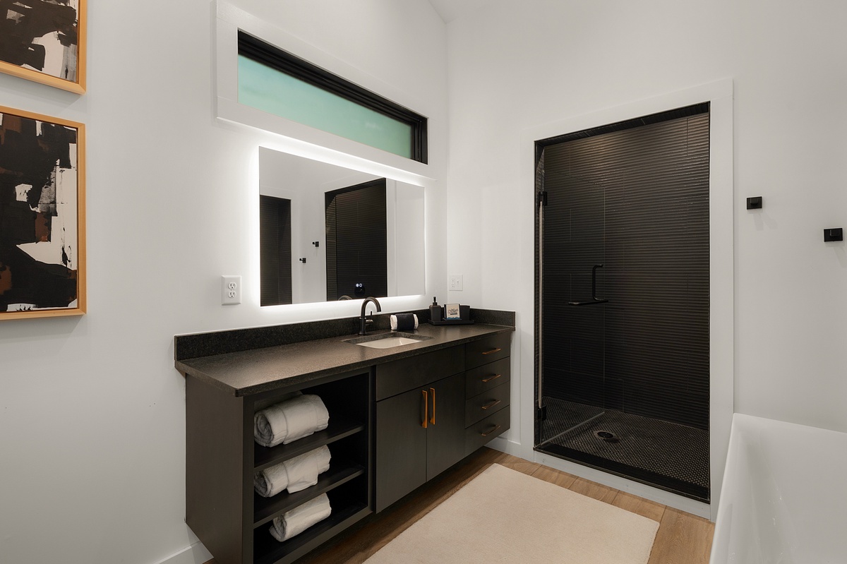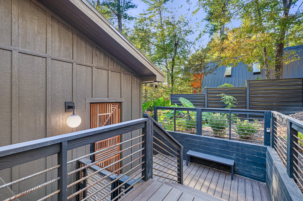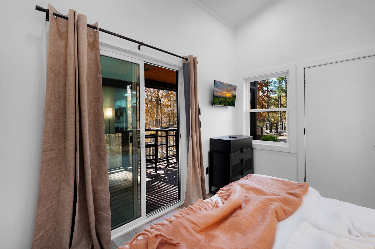 The modern bathroom is beautifully finished with a single vanity, smart mirror, walk-in shower, and separate soaking tub, the perfect place to unwind after a day of exploring Blue Ridge. A laundry closet adds a touch of convenience for longer stays, while deck access from both the living area and bedroom space invites the mountain air inside.