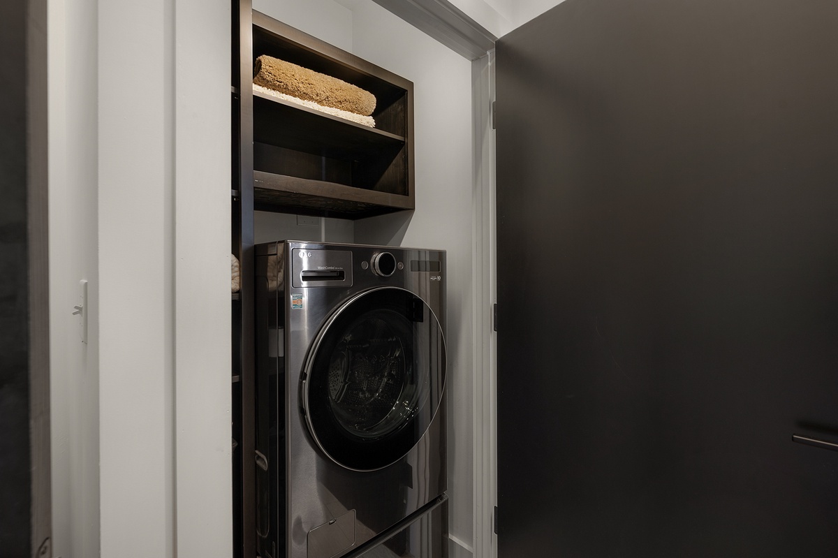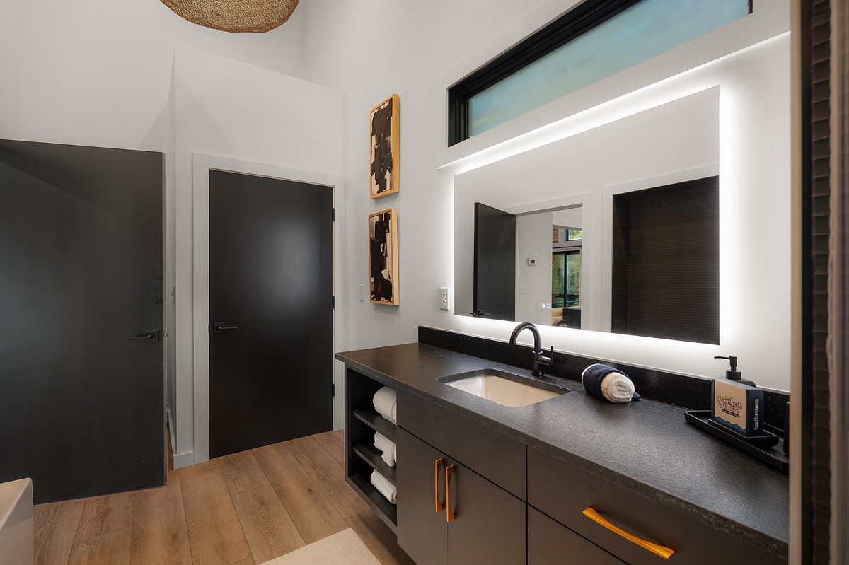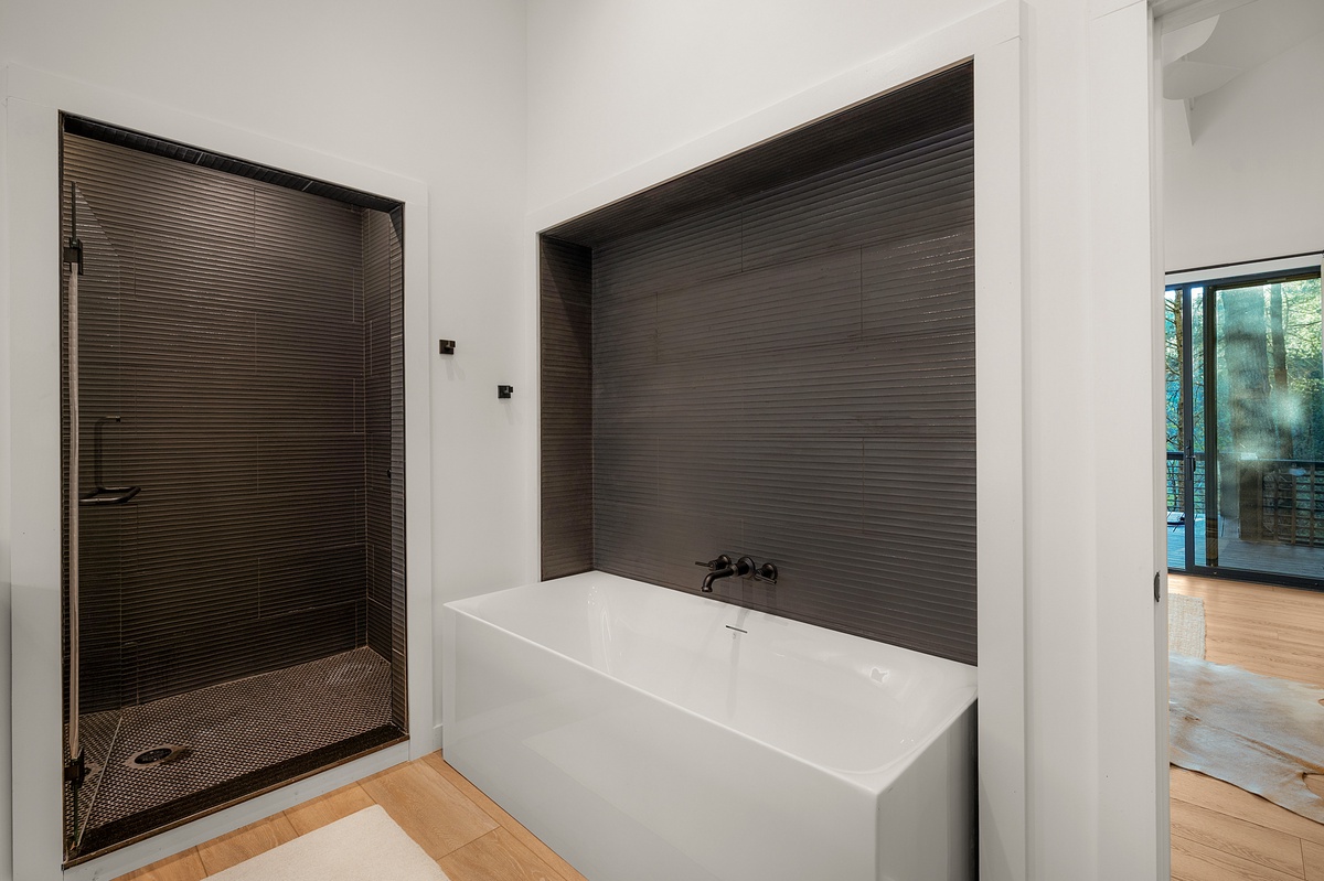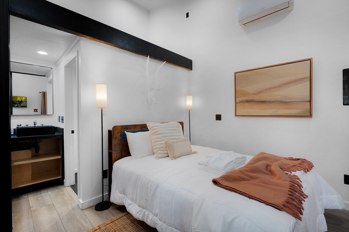 The modern bathroom is beautifully finished with a single vanity, smart mirror, walk-in shower, and separate soaking tub, the perfect place to unwind after a day of exploring Blue Ridge. A laundry closet adds a touch of convenience for longer stays, while deck access from both the living area and bedroom space invites the mountain air inside.