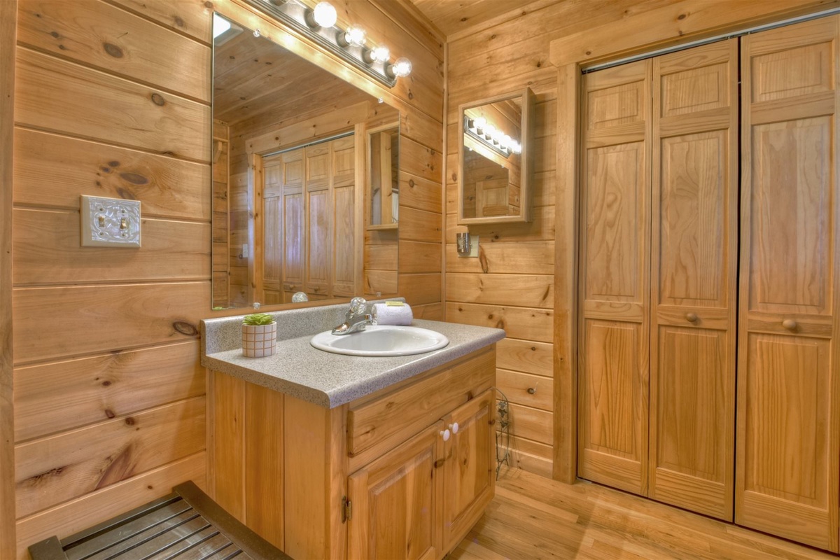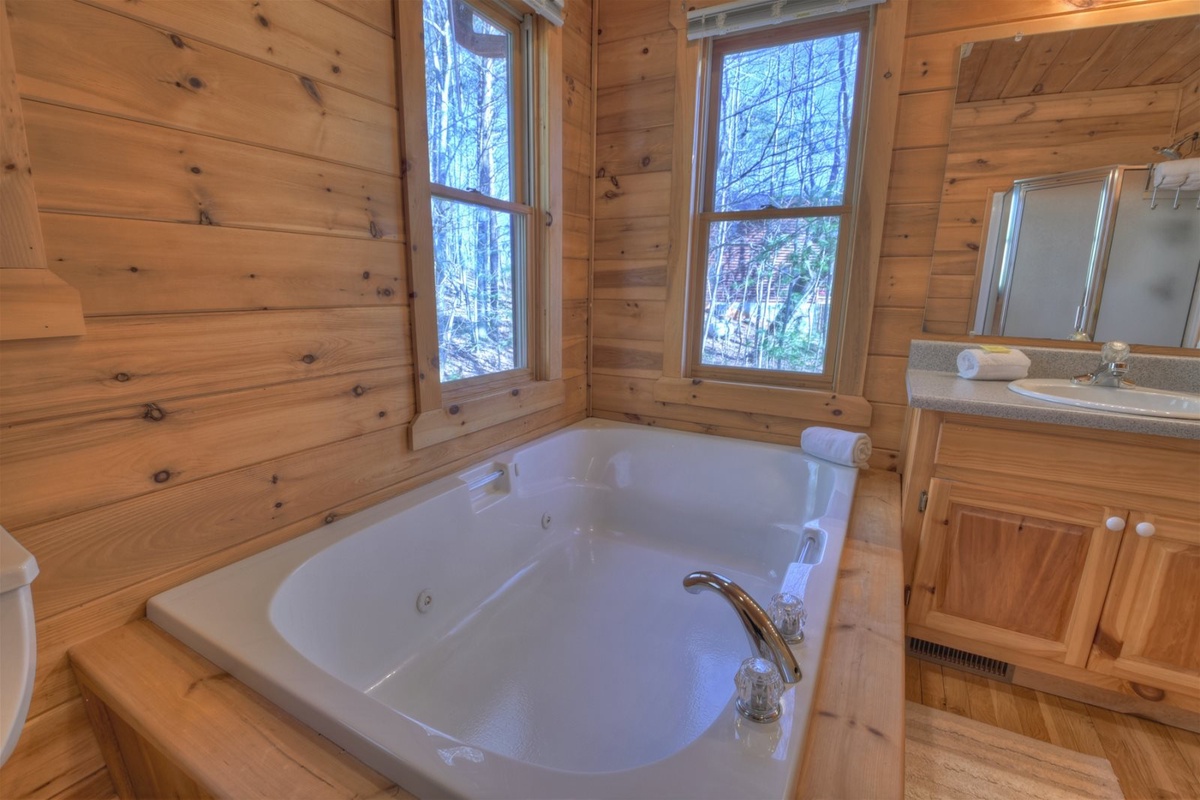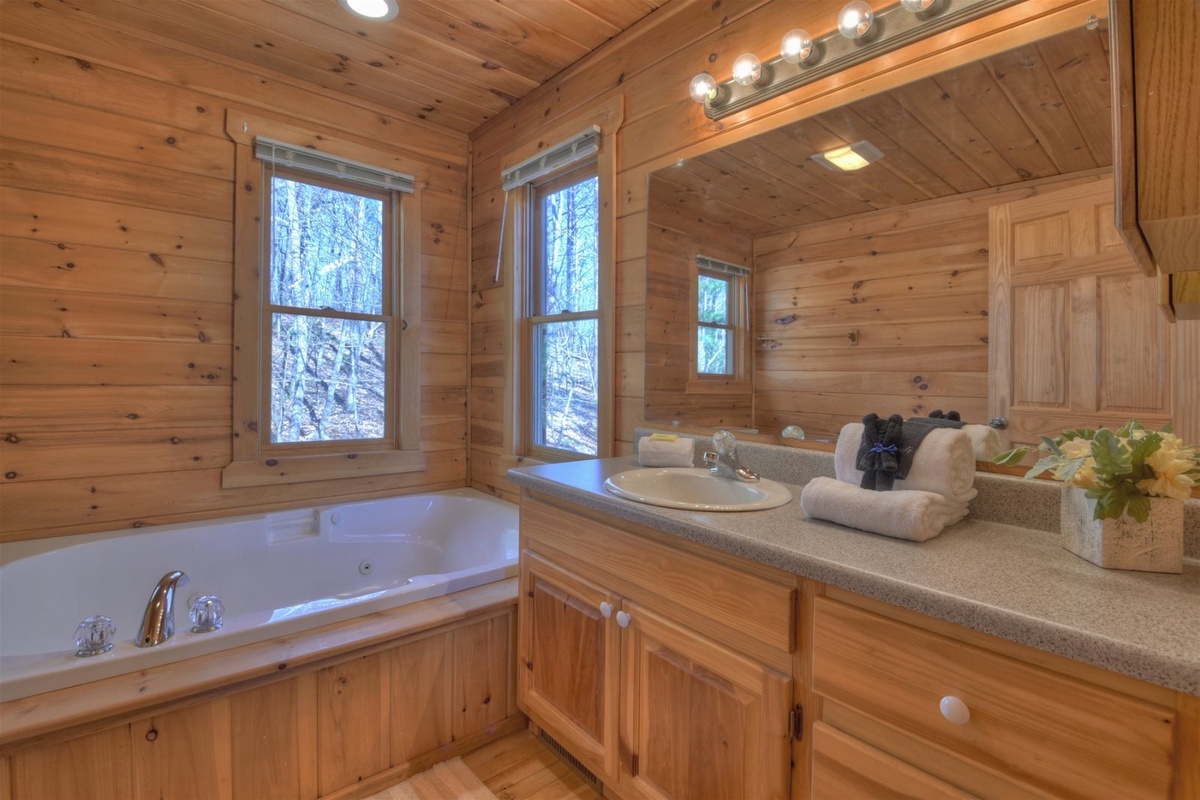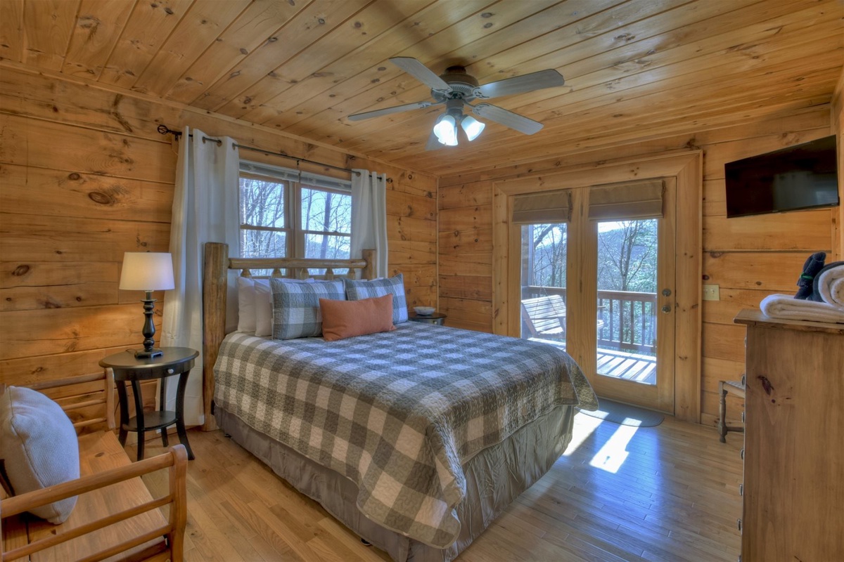 Sleeping accommodations at A Walk In The Clouds are fantastic and feature a queen on the main level, queen on the basement level, and a master king bedroom on the upper level. The master comes complete with a gorgeous custom bed frame private balcony access, where you can sip your coffee as the sun rises over the mountains. Don’t forget to unwind in the jetted tub located in the master bathroom!