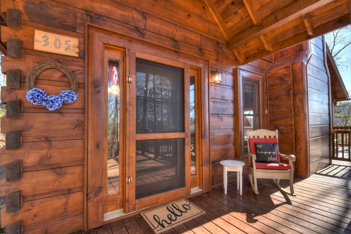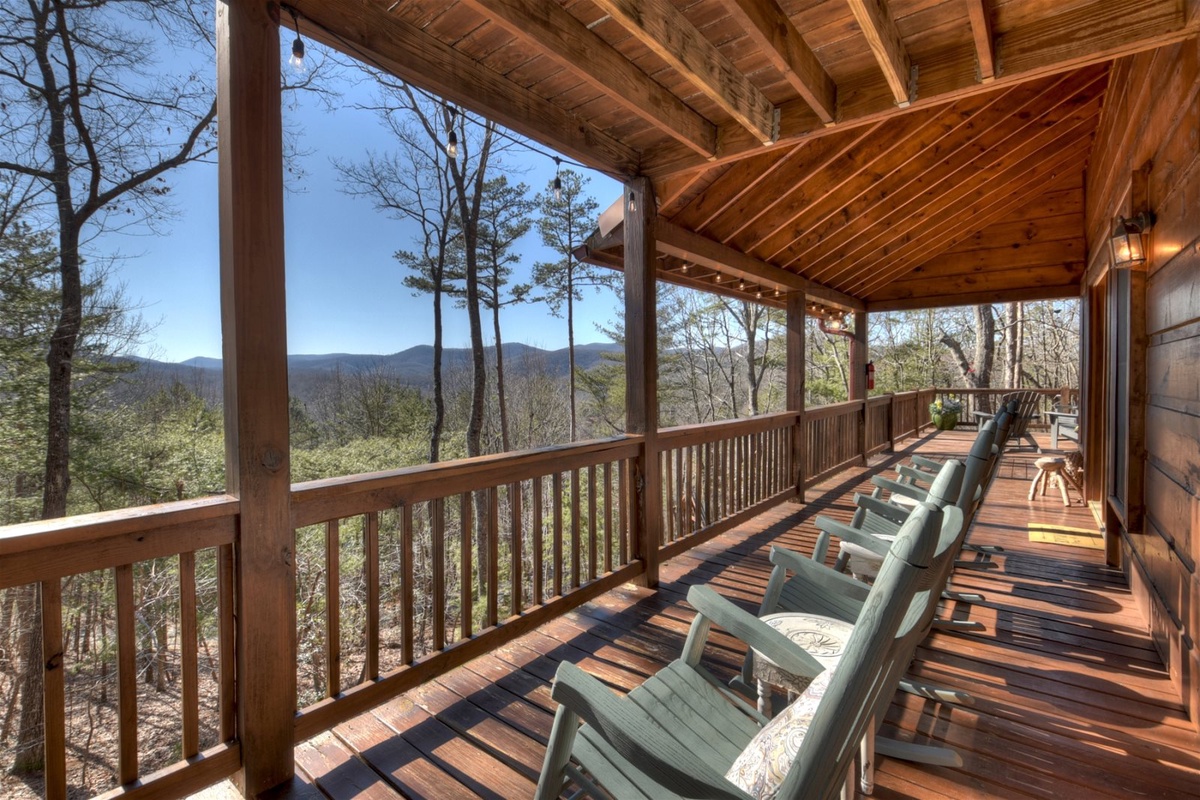 - Four rocking chairs under covered deck