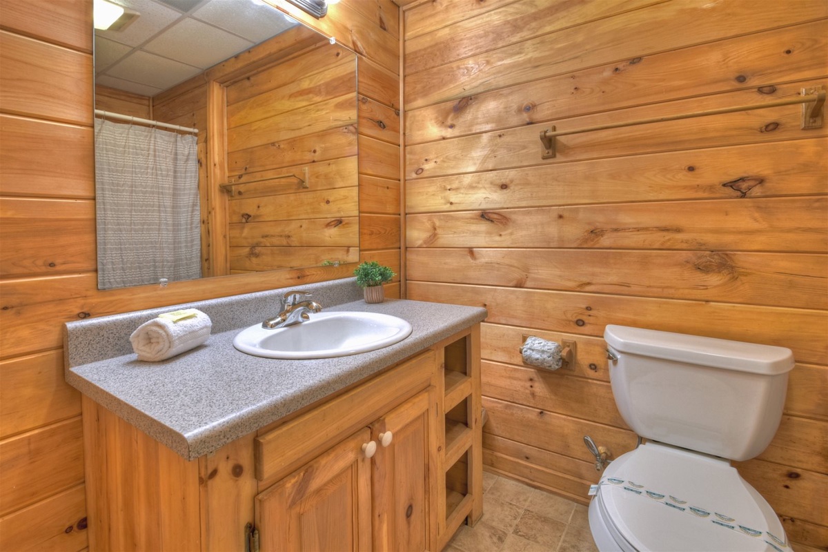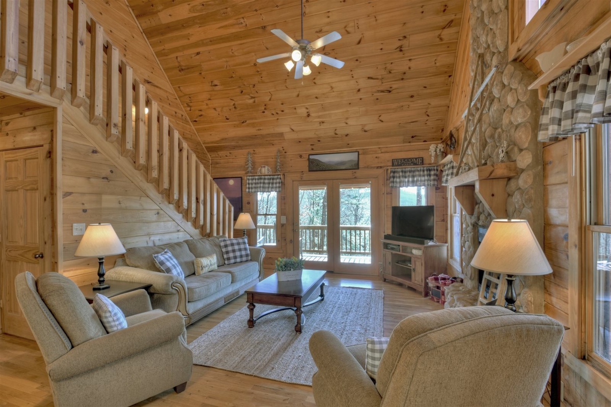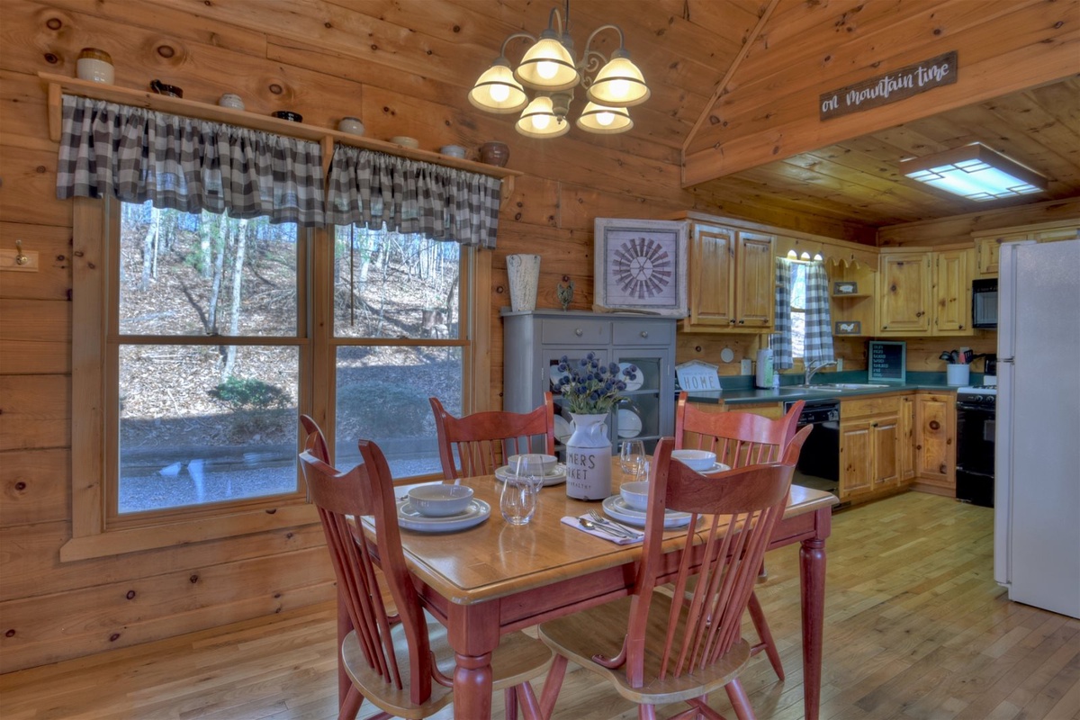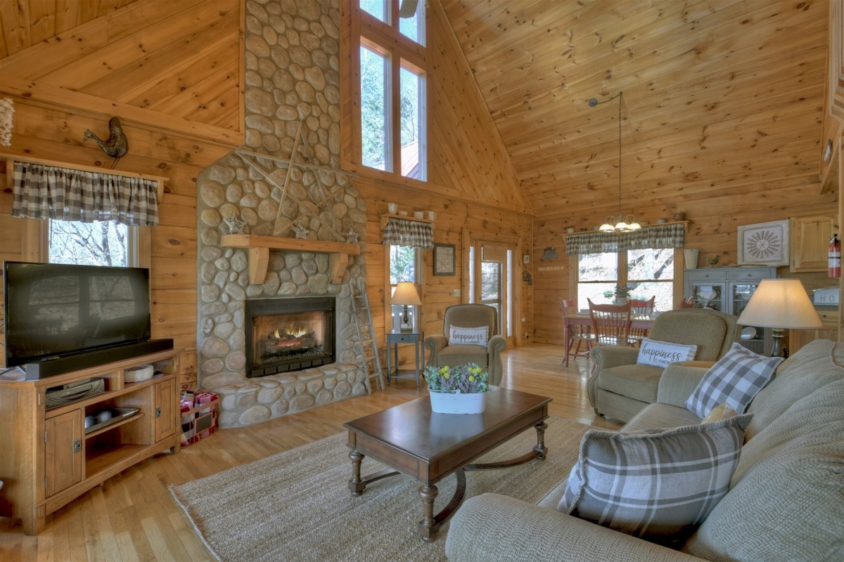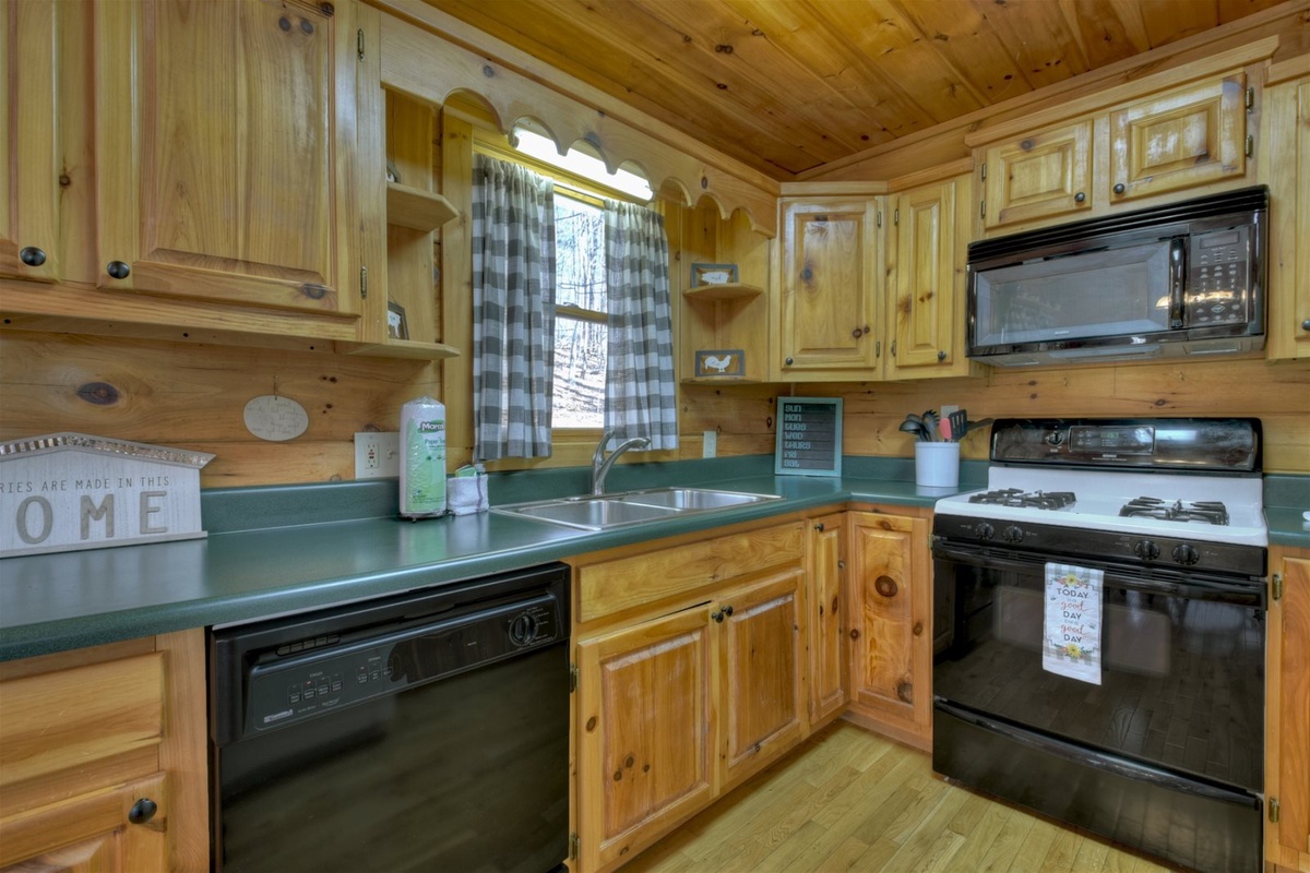 Your ride to the cabin will set the mood for your whole trip, with serene mountain vistas, charming wildlife, and the welcoming sounds of nature all around you. Head through the front door to discover a lovely living room with flat-screen TV, floor-to-ceiling gas fireplace, comfy couches, and access to the main level deck. Meal prep is fun and easy in this cabin’s large kitchen area. Enjoying your meal is even better, whether you choose to break bread around the dining table or chow down outside on the deck.