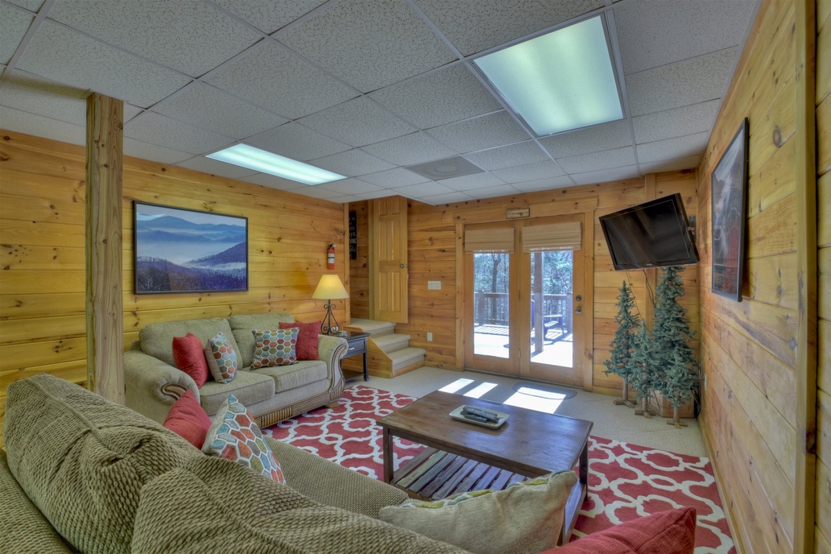 Downstairs you will find a finished basement complete with flat-screen TV, foosball table, plush couches, and easy deck access.