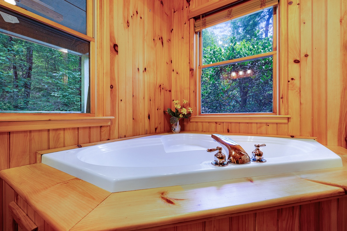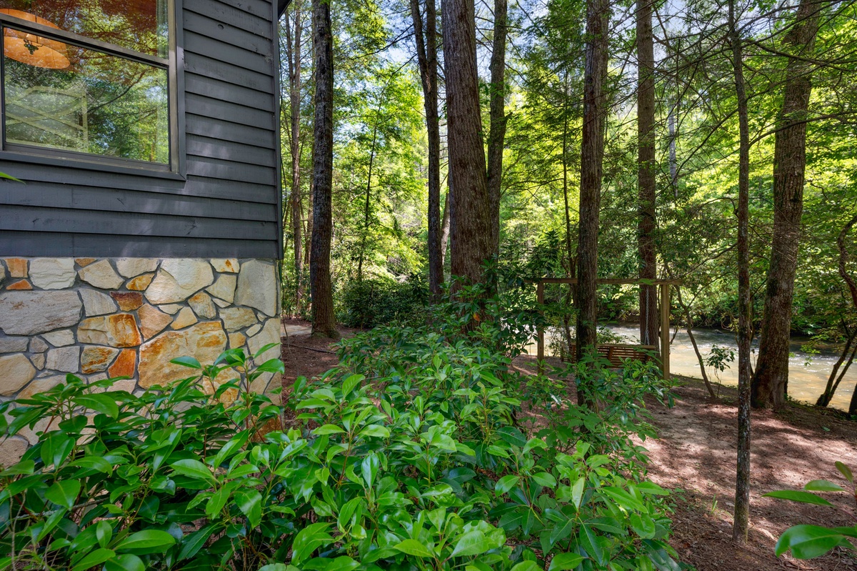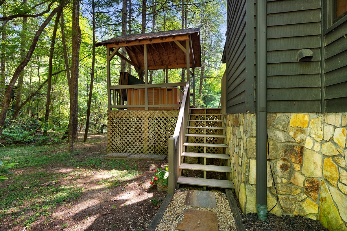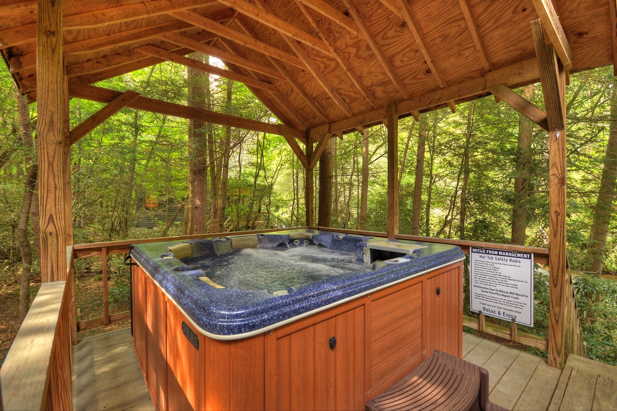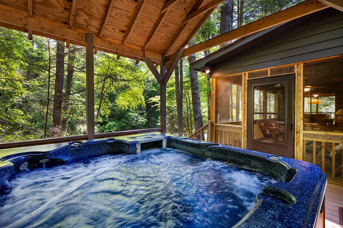 When you return to your retreat, let the hot tub on the covered deck embrace you with its warm, soothing waters. Soak away any tired muscles while admiring the panoramic view of Fightingtown Creek, flowing right before your eyes. Immerse yourself in the lush greenery, vibrant flowers, and the captivating presence of Mountain Laurel and Rhododendron that surround you.