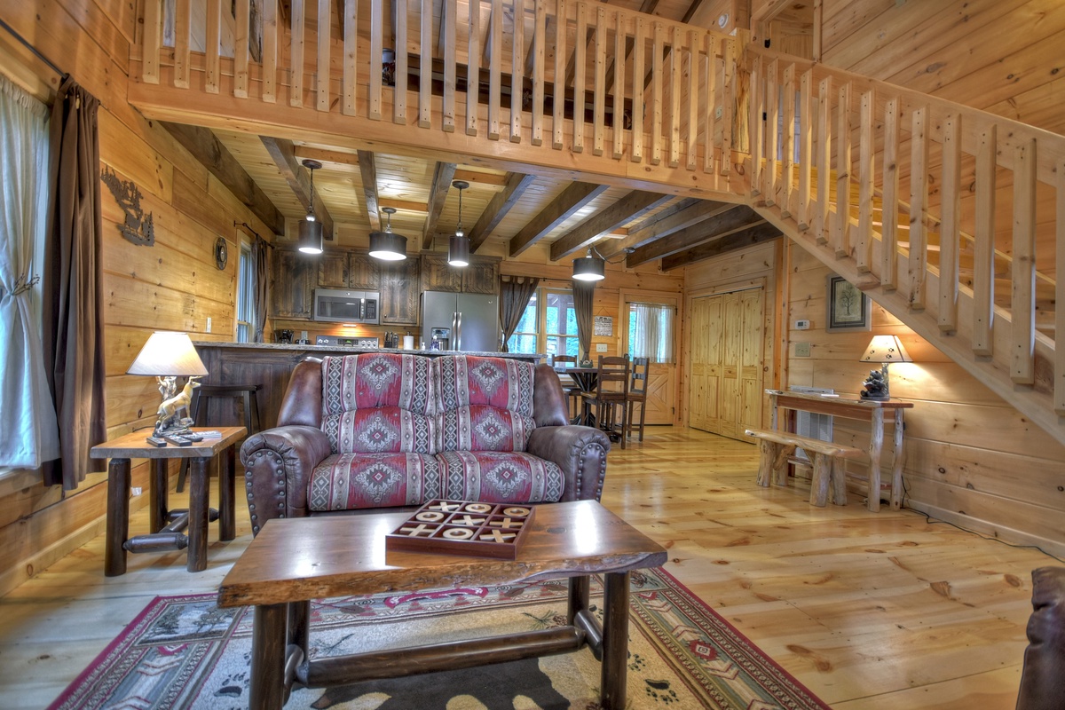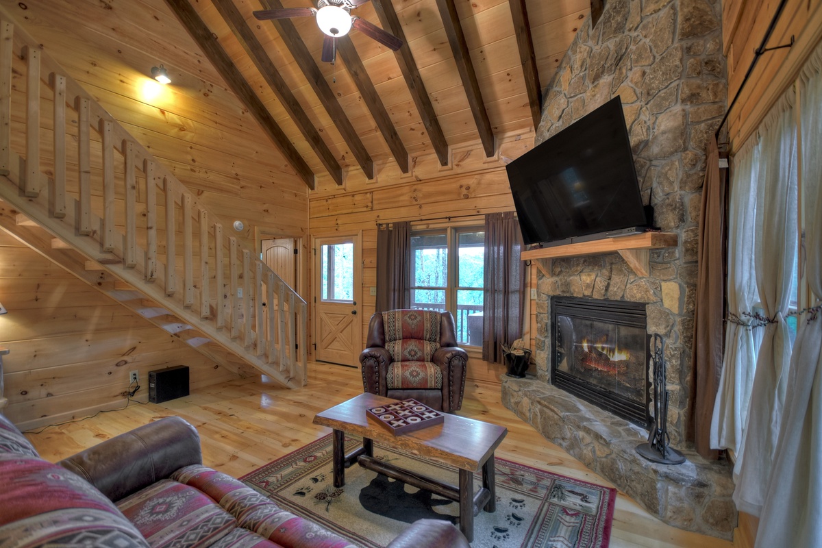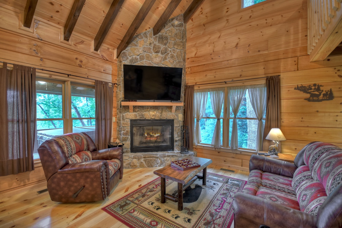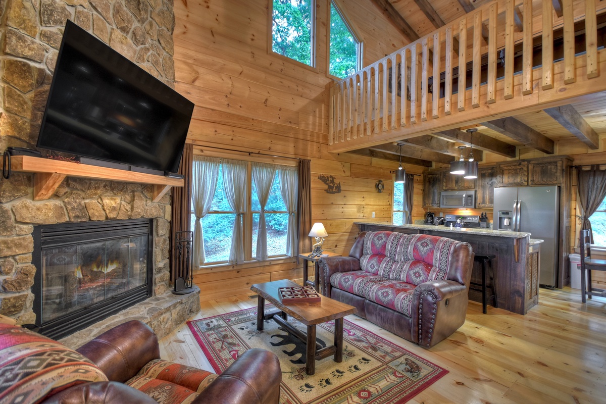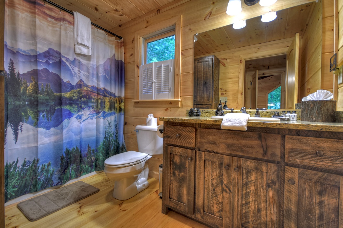 Walking into the cabin, expect to be rushed by the woodsy scents and the rich ambiance of the Appalachian Mountains. Put your groceries away in the fully stocked kitchen and take your bags to the king suites on both levels! The entry-level living area boasts a giant 70" cable TV with a soundbar over a wood burning fireplace in the living area offering the ultimate entertainment experience. You'll also find the first of 2 king suites on this level with the shared tub/shower combo bathroom. This bedroom has direct private access to the bathroom but also shares with the common area. This bedroom also has deck access. If you're enjoying an extended stay, the cabin has a washer & dryer on this level near the front door, tucked away in the closet for your laundering needs.