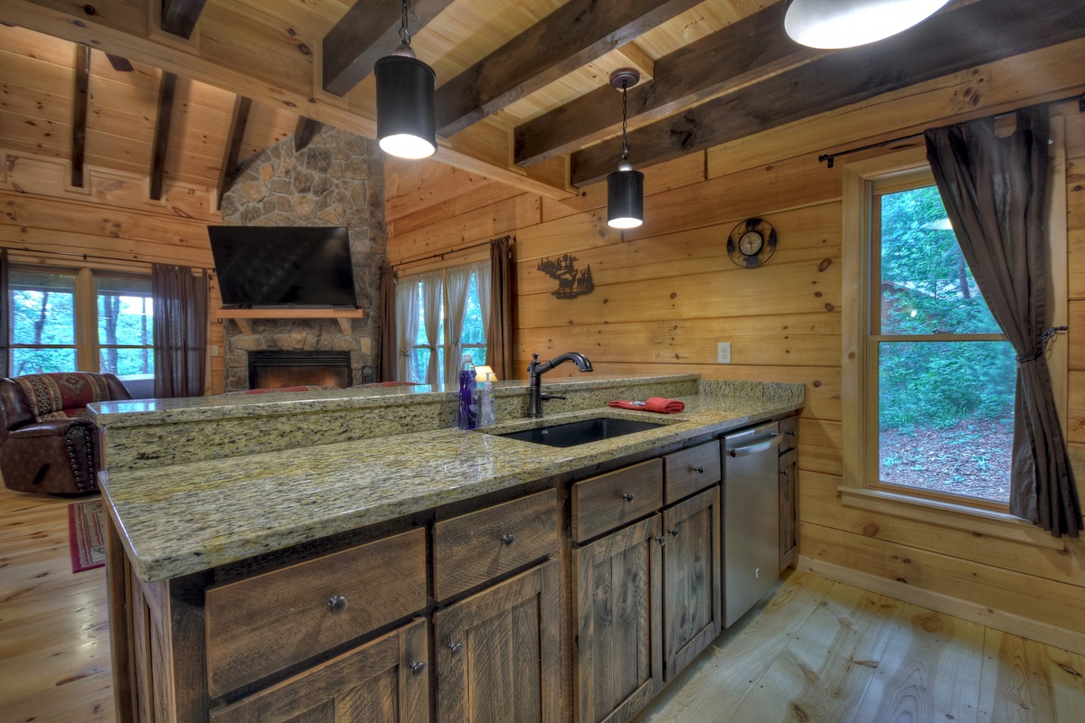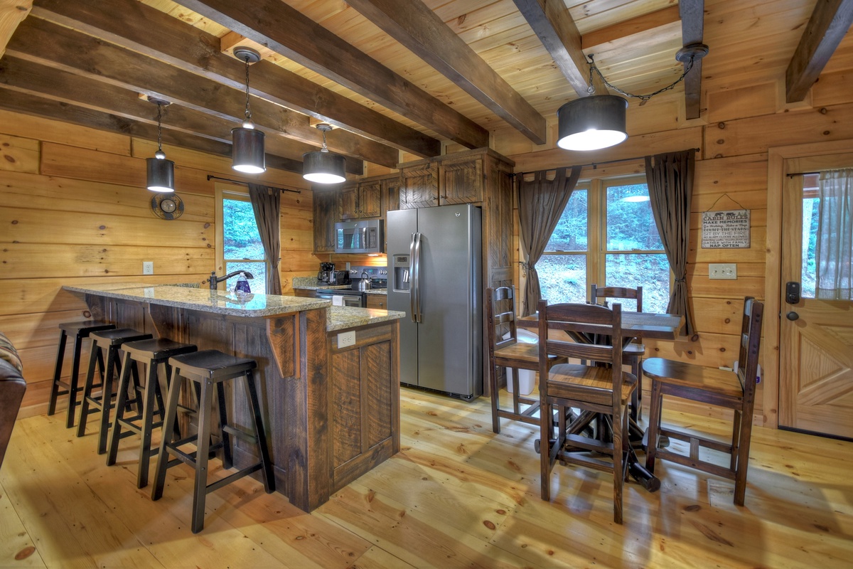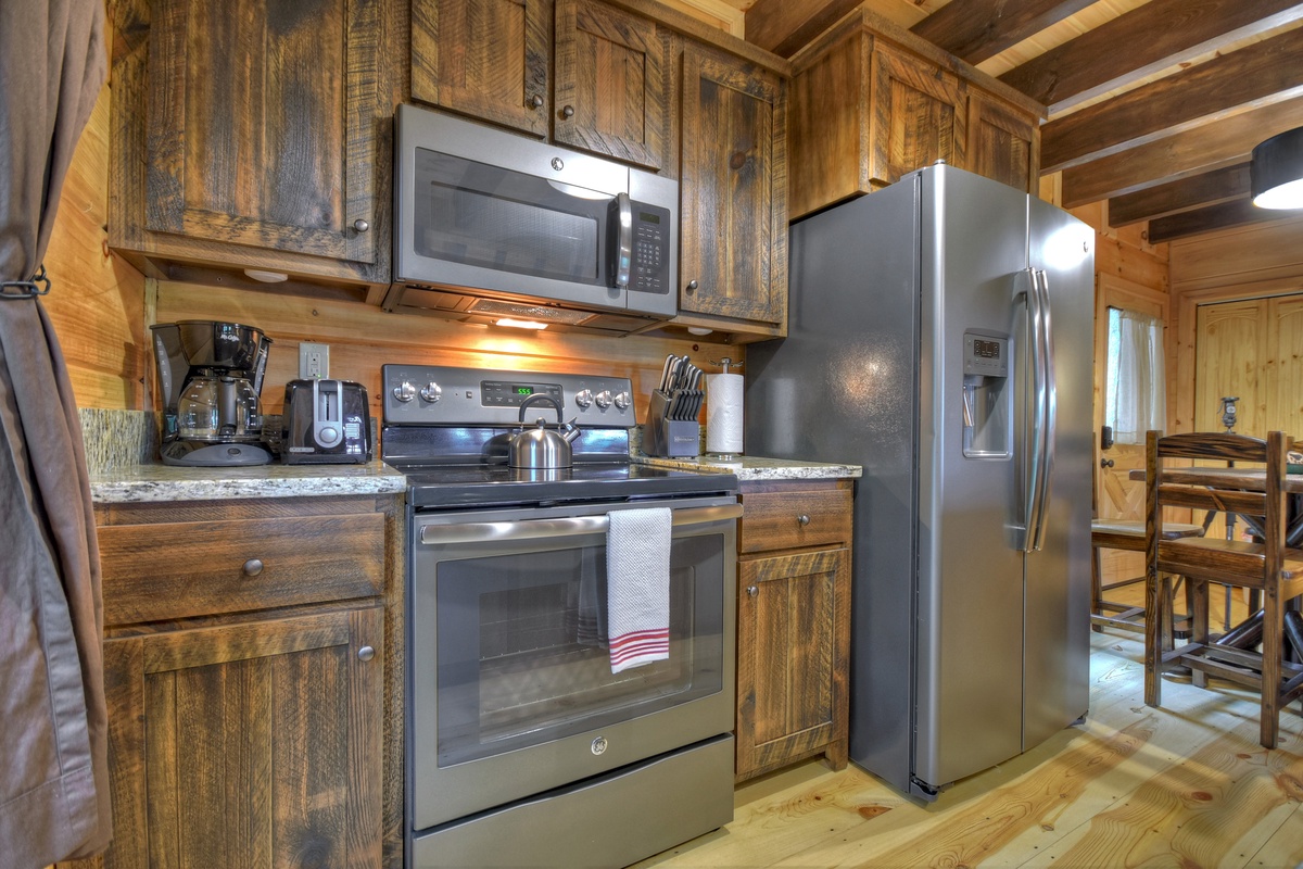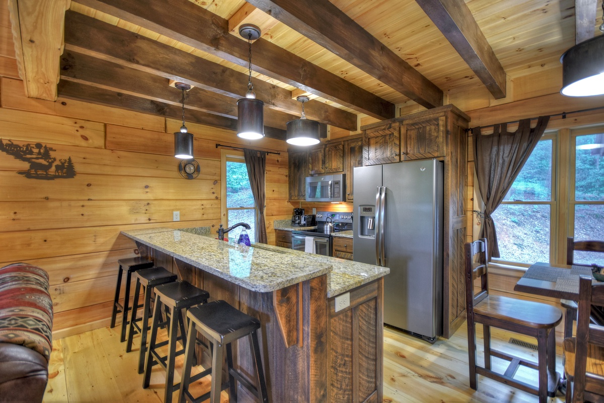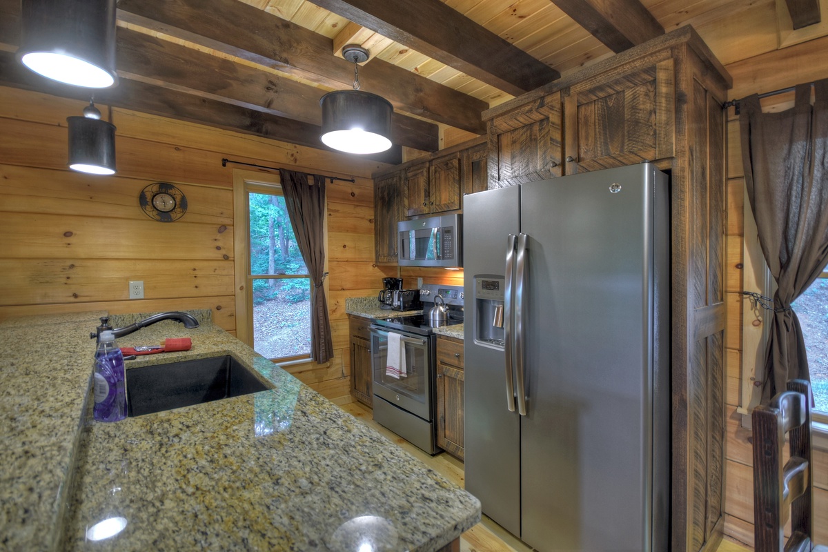 Walking into the cabin, expect to be rushed by the woodsy scents and the rich ambiance of the Appalachian Mountains. Put your groceries away in the fully stocked kitchen and take your bags to the king suites on both levels! The entry-level living area boasts a giant 70" cable TV with a soundbar over a wood burning fireplace in the living area offering the ultimate entertainment experience. You'll also find the first of 2 king suites on this level with the shared tub/shower combo bathroom. This bedroom has direct private access to the bathroom but also shares with the common area. This bedroom also has deck access. If you're enjoying an extended stay, the cabin has a washer & dryer on this level near the front door, tucked away in the closet for your laundering needs.