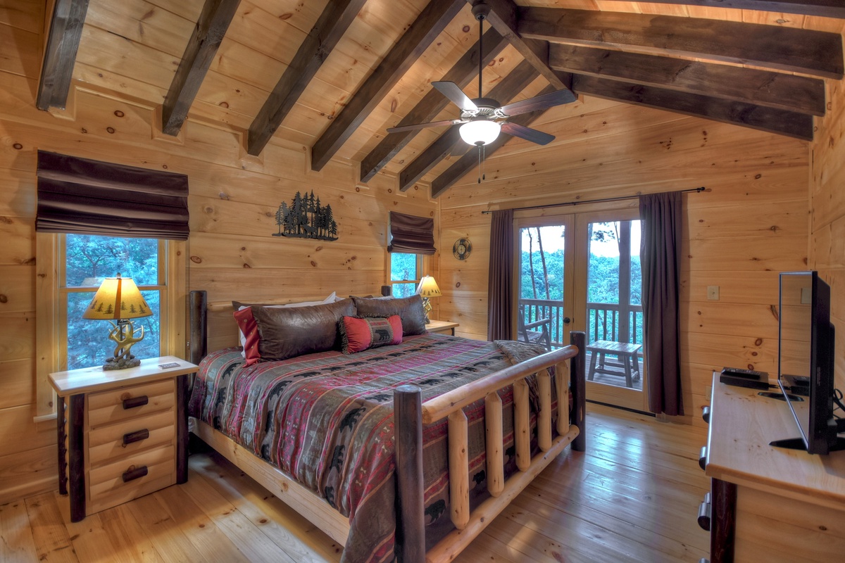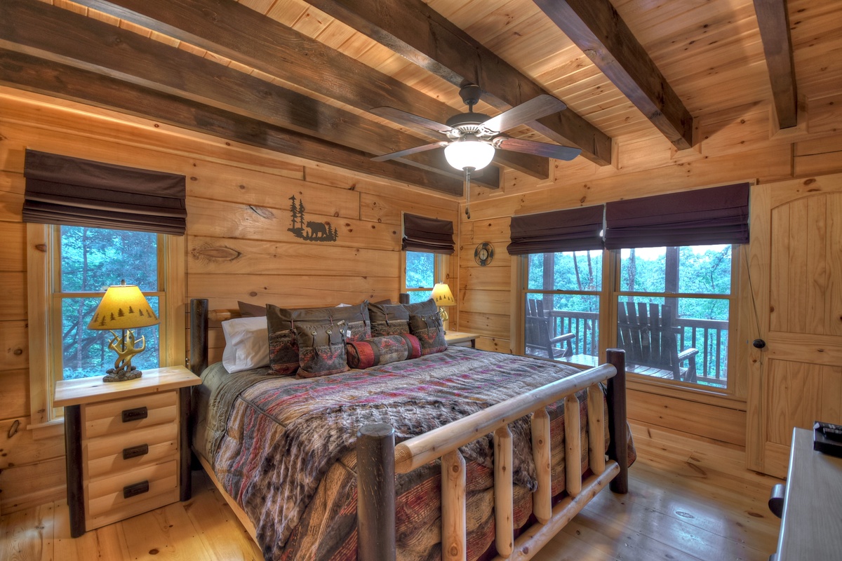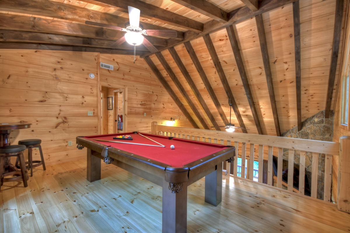 Head up the stairs to the upper-level where you will find a unique amenity - at least considering its location - a brand new, full-size pool table awaits in the upper-level loft with bar stools and table! Enjoy a game of billiards with friends while overlooking the den area and forest view windows. The second king suite is on this level with the shared tub/shower combo bathroom. This king suite also has its own private balcony with 2 wooden rocking chairs.