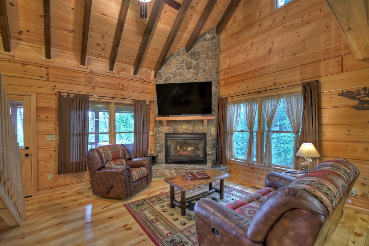 - Wood burning fireplace and 70" TV with soundbar