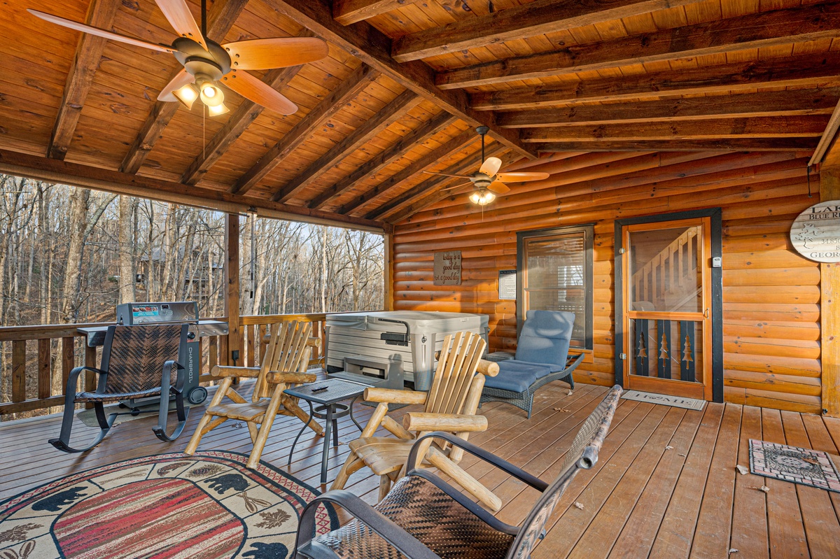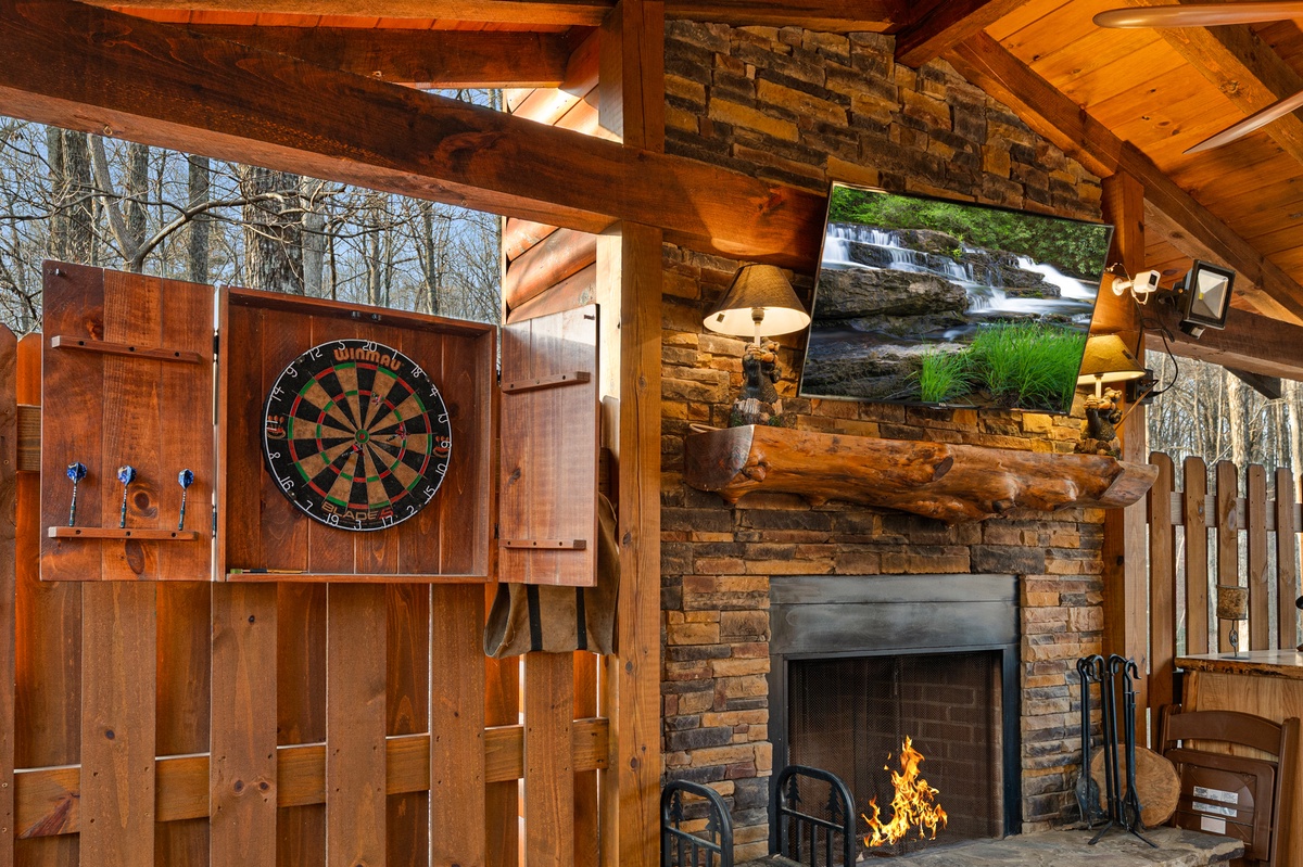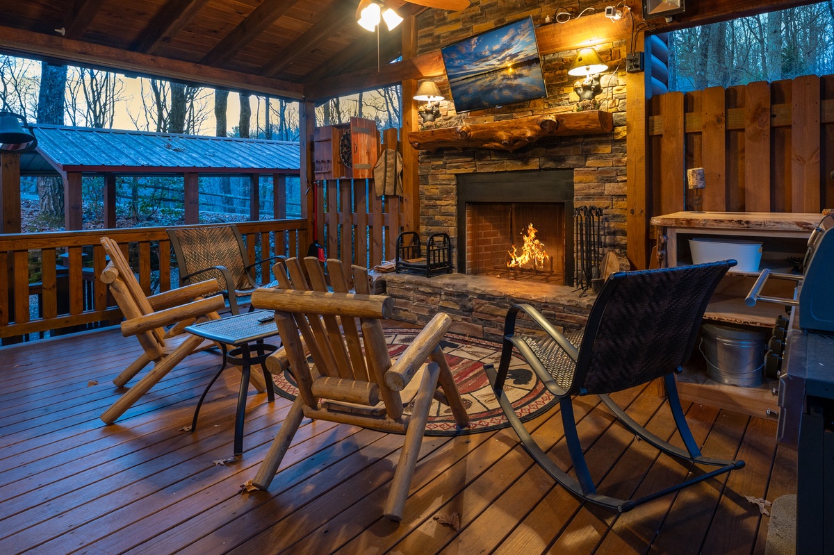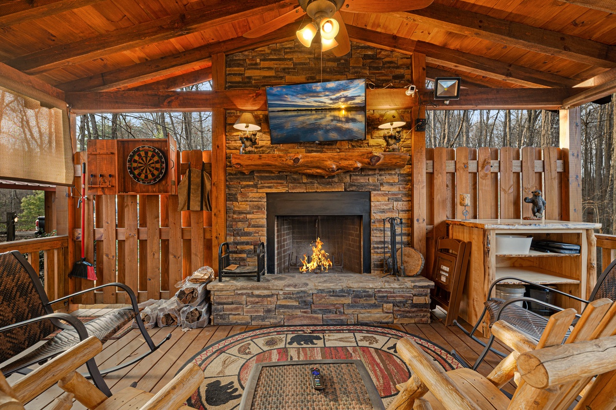 Outside, unwind on the spacious entry deck featuring a wood-burning fireplace, dart board, streaming TV, and a hot tub for six. Fire up the charcoal grill for dinner and relax in one of the rocker chairs or lounge seats. The back porch offers even more space to unwind with woven chairs, footrests, and another streaming TV.
