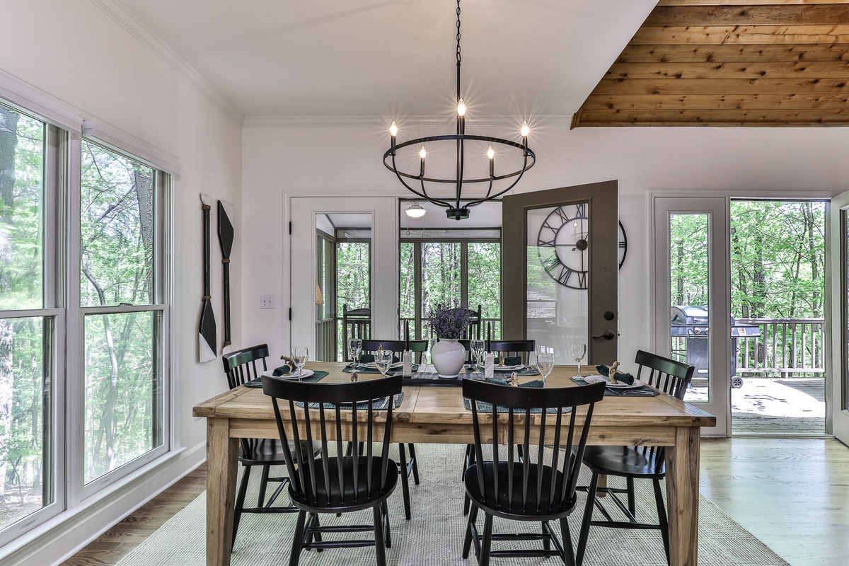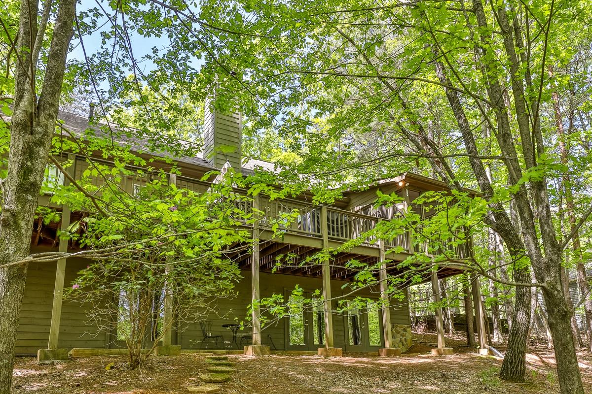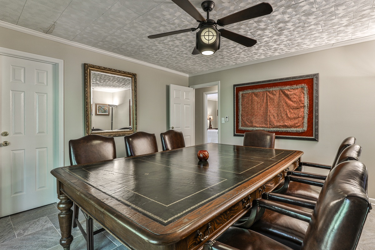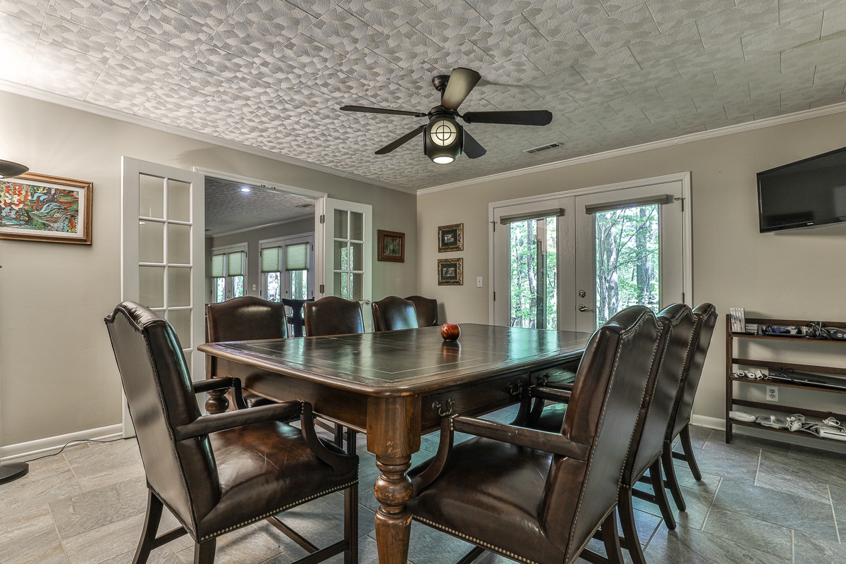 The conference room seats 8-10 at an antique table. The home's new landscaping enhances the mountain escape feel. Adjacent to hiking trails and a 10-minute walk to the Wildcat Pool area, this home is ideal for large families, groups, or business retreats. Enjoy a peaceful getaway at Big Canoe!