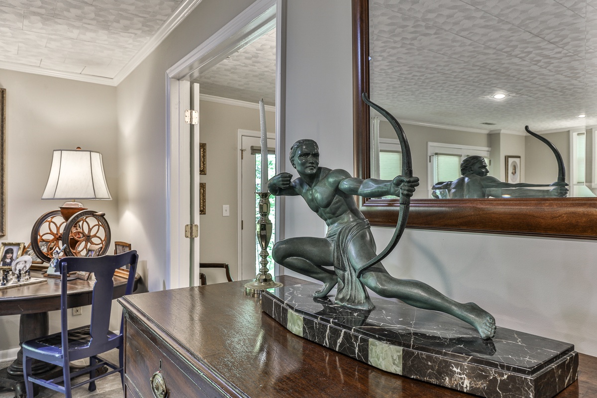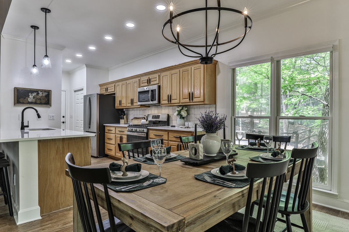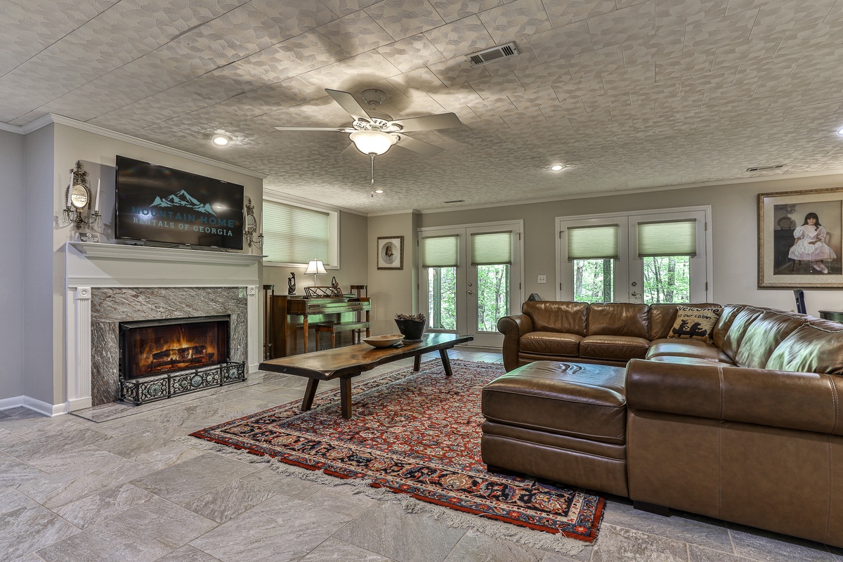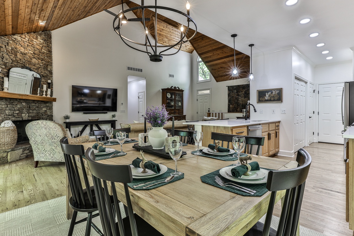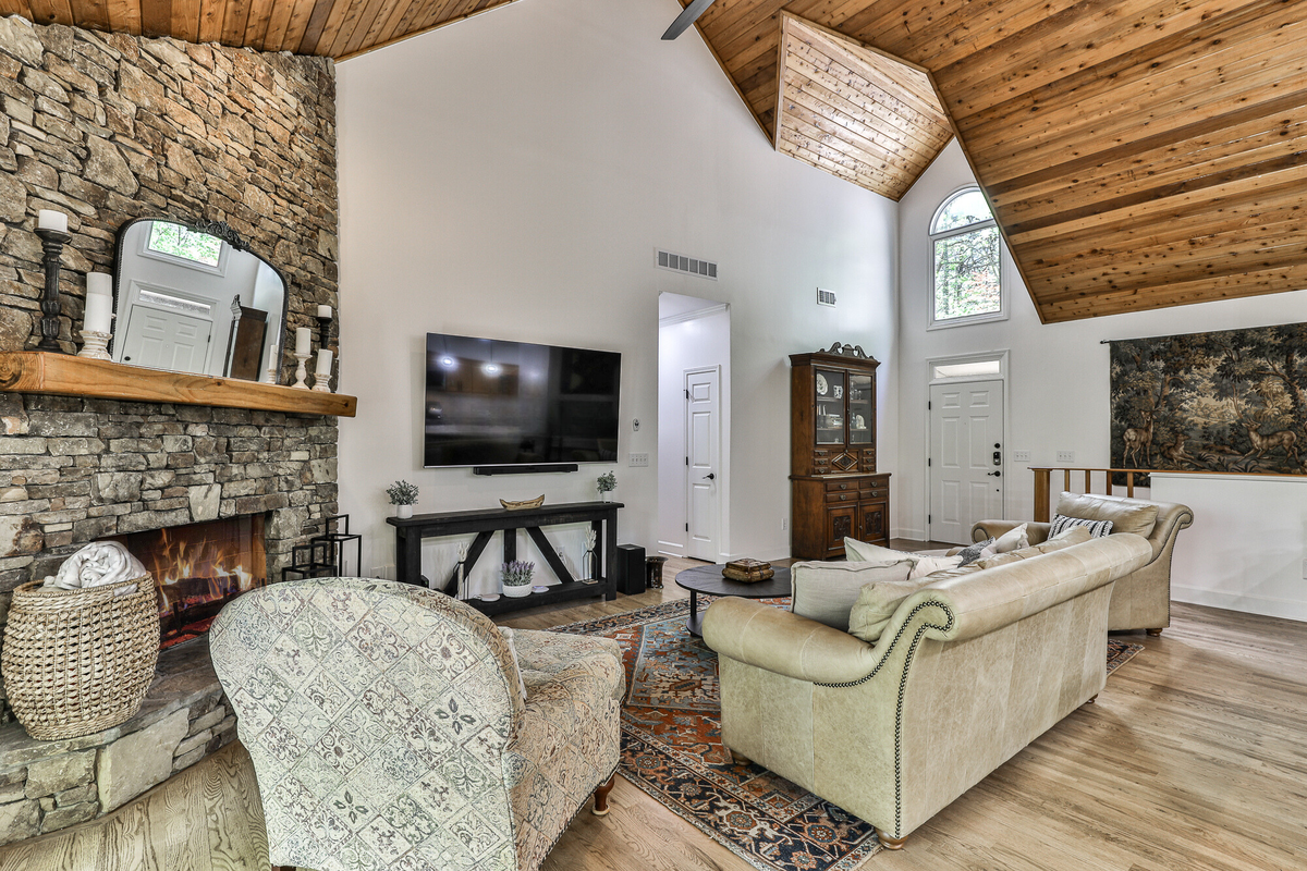The conference room seats 8-10 at an antique table. The home's new landscaping enhances the mountain escape feel. Adjacent to hiking trails and a 10-minute walk to the Wildcat Pool area, this home is ideal for large families, groups, or business retreats. Enjoy a peaceful getaway at Big Canoe!