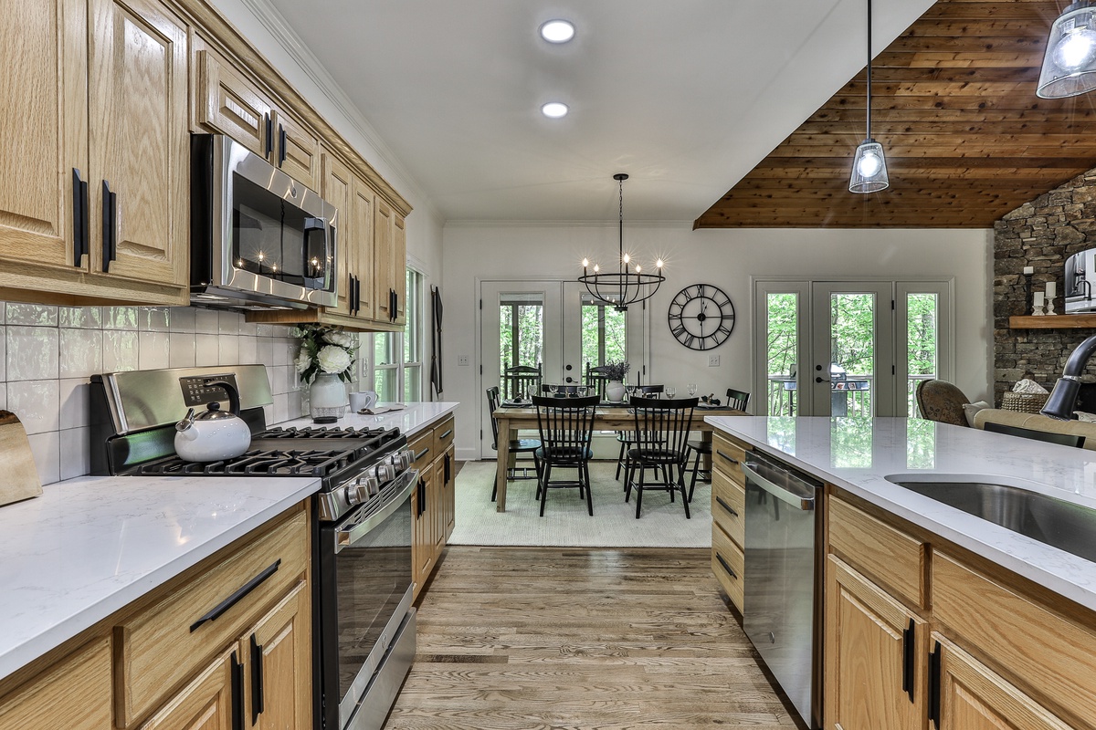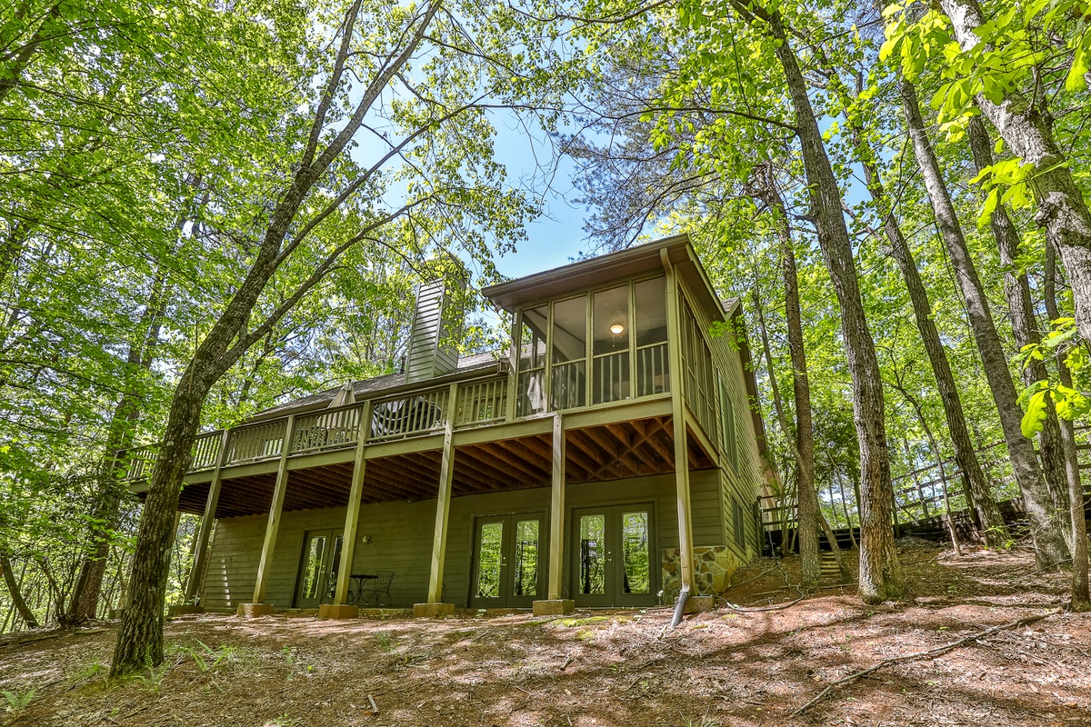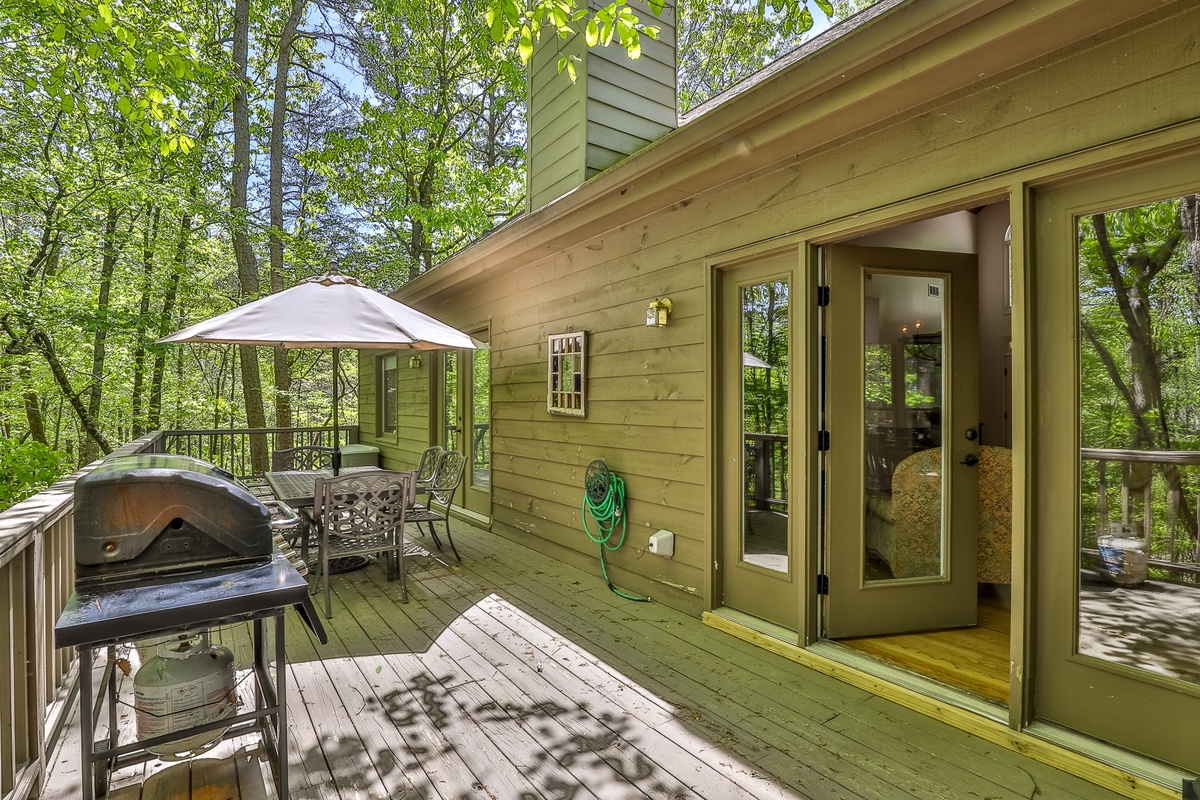 The front entrance opens to a great room with a flat-screen TV, gas fireplace, fully furnished kitchen, and a dining room seating 6-8. The main floor includes three bedrooms: a master with a queen bed, walk-in shower, and tub; and two guest bedrooms with queen beds sharing a bath with a tub/shower. A partially screened-in porch with new furniture and a large deck with patio dining furniture and a propane gas grill are off the great room. Downstairs, find den with a flat-screen Smart TV, gas fireplace, and two additional bedrooms (one queen, one with two twin beds) sharing a remodeled bath with a walk-in shower. Each bedroom has a TV.