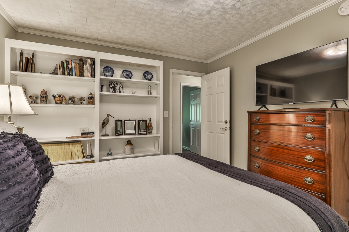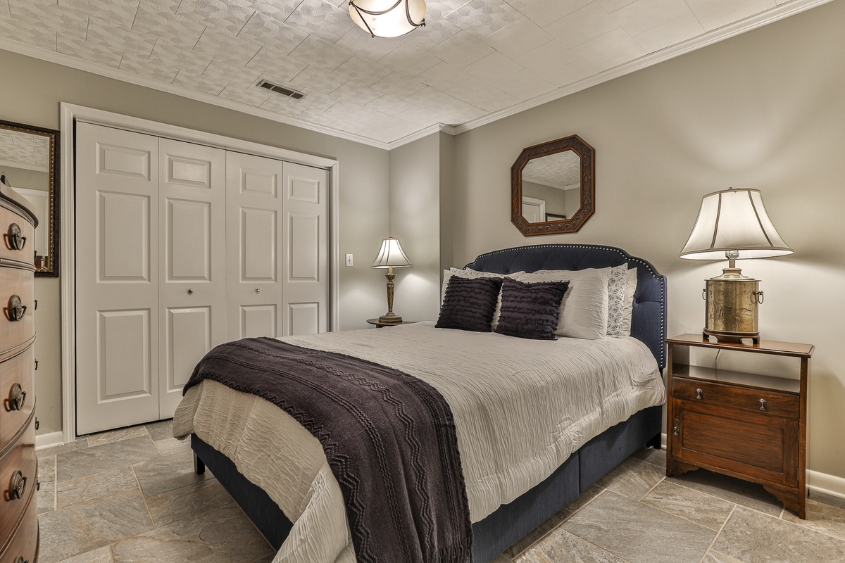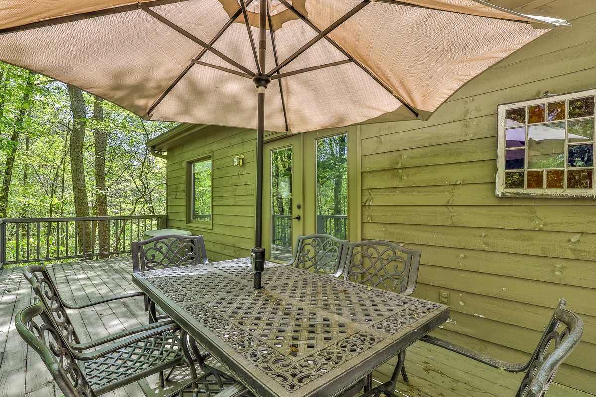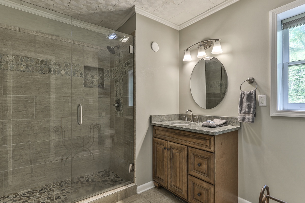 The front entrance opens to a great room with a flat-screen TV, gas fireplace, fully furnished kitchen, and a dining room seating 6-8. The main floor includes three bedrooms: a master with a queen bed, walk-in shower, and tub; and two guest bedrooms with queen beds sharing a bath with a tub/shower. A partially screened-in porch with new furniture and a large deck with patio dining furniture and a propane gas grill are off the great room. Downstairs, find den with a flat-screen Smart TV, gas fireplace, and two additional bedrooms (one queen, one with two twin beds) sharing a remodeled bath with a walk-in shower. Each bedroom has a TV.