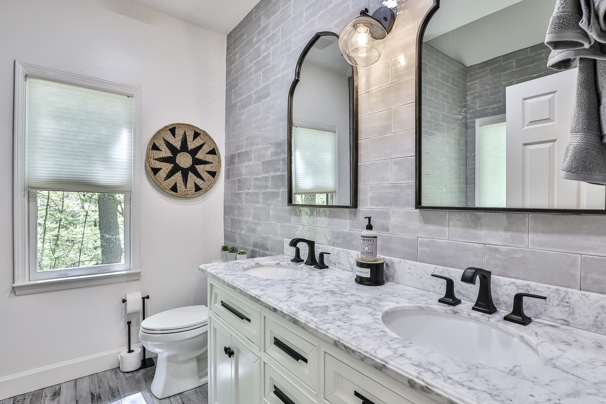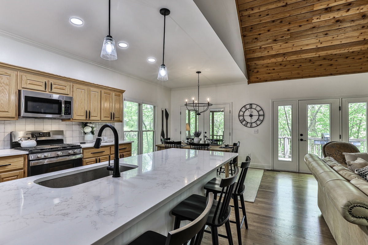Adventures at Big Canoe, located near the north gate, is a short walk or drive to the Wildcat pool and trail. This secluded five-bedroom, three-bath home at the end of Yanoo Trace cul-de-sac offers ample parking. Spread out in the upstairs great room or the expansive downstairs den. The newly renovated kitchen features a gas stove and beautiful counter seating. Downstairs, a conference room with an antique table seats 8-10, perfect for business meetings or gaming.