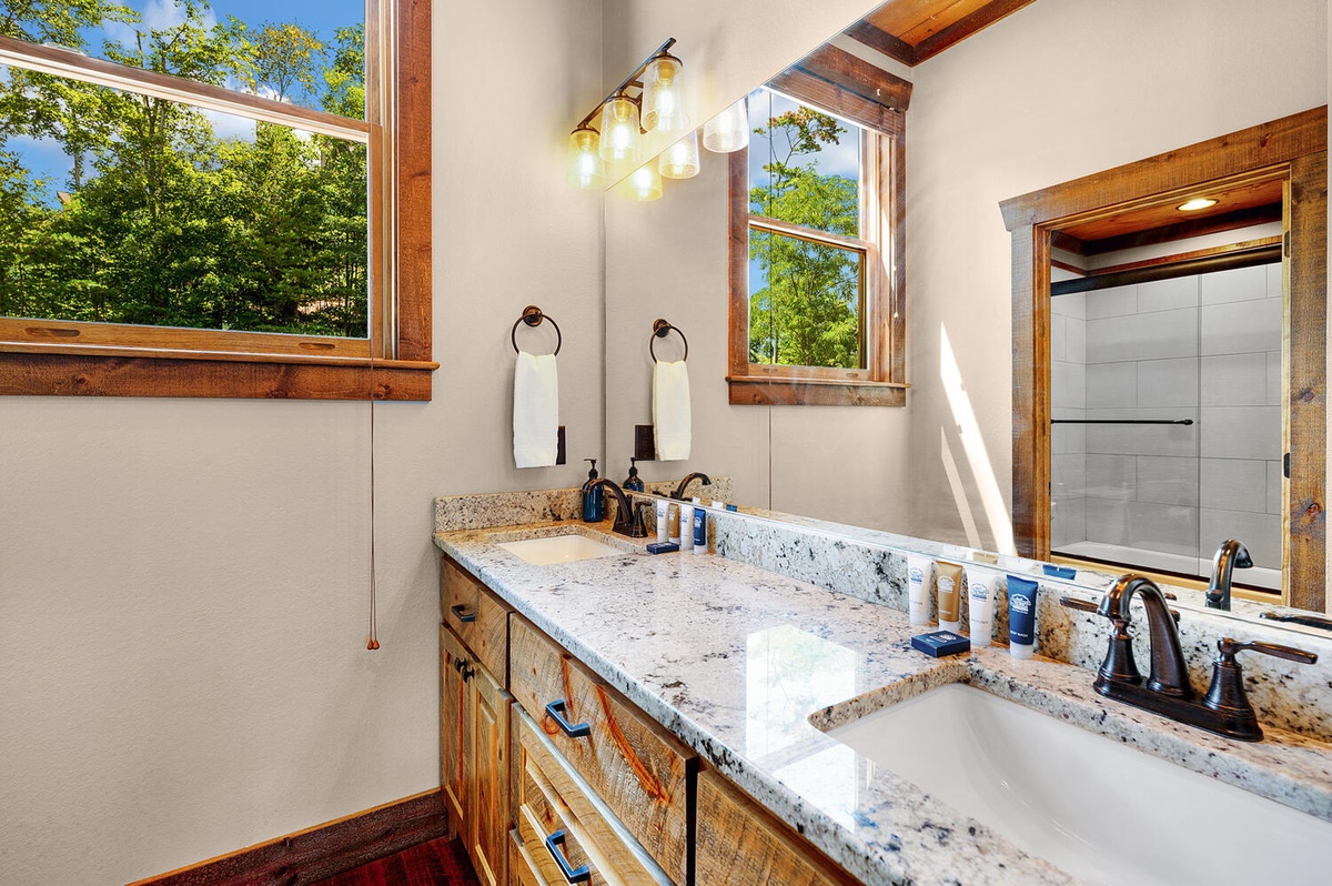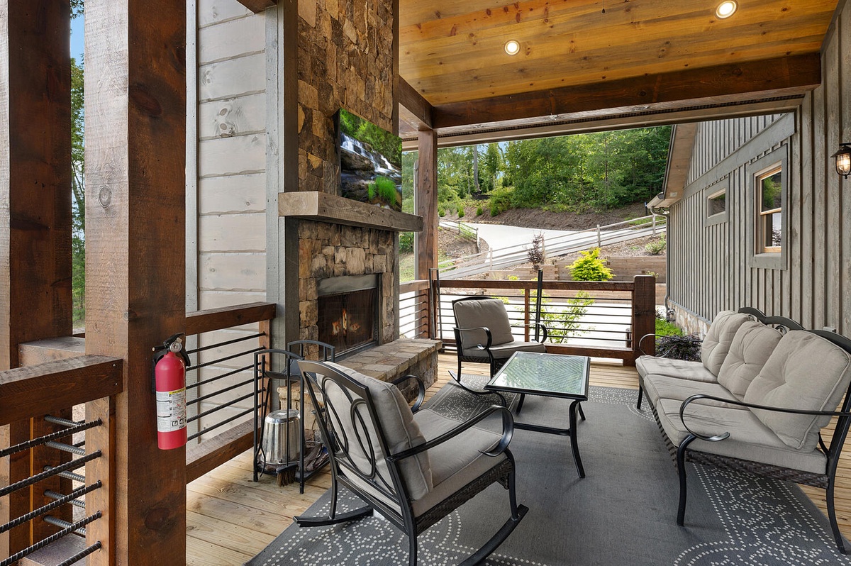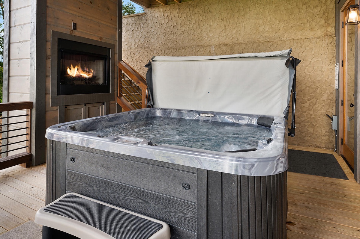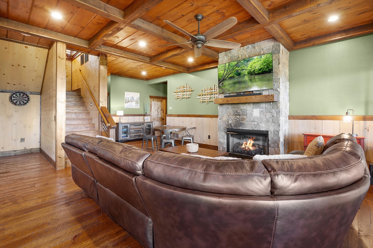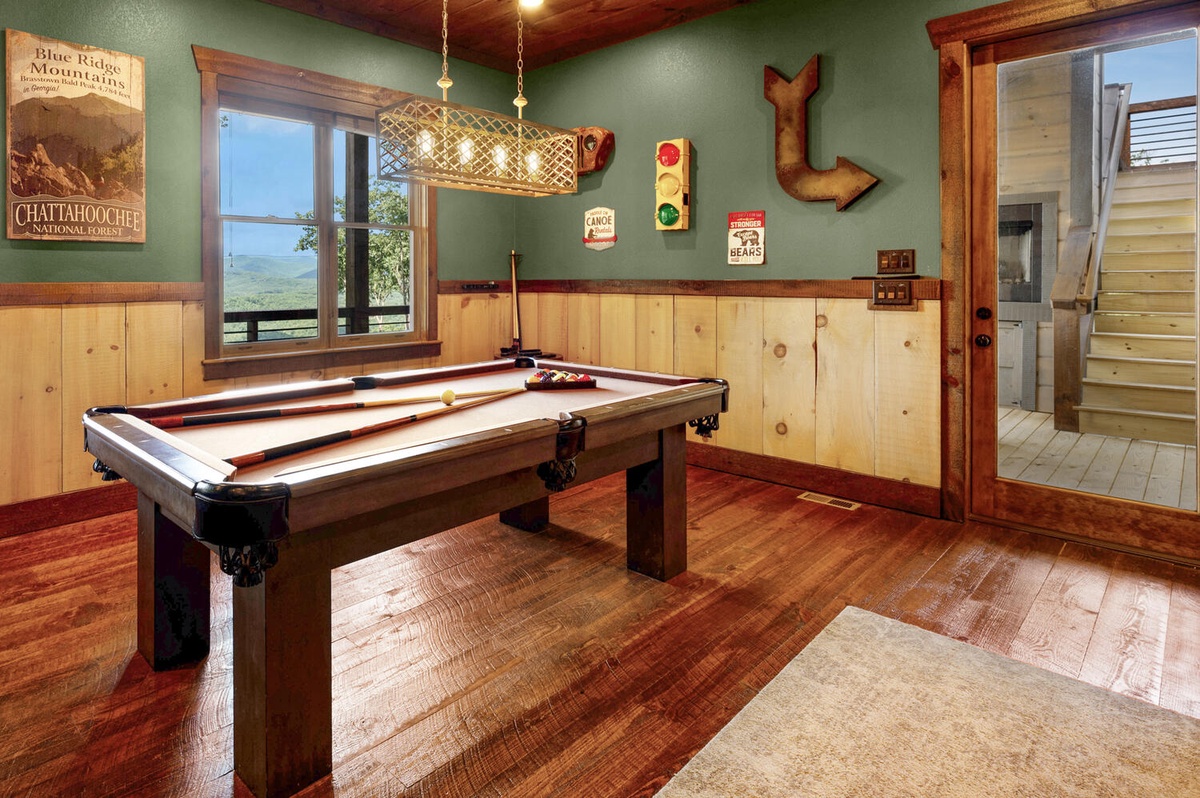 The lower level of this home is where the real fun begins! As you walk down, you will enter the open den with large leather sectional centered perfectly with a gas log fireplace and a 65" TV above. To the right is a pool table and a bar area with a full-sized fridge and a golden tee arcade game as well as card table with seating for 4. If you would like to take a rest from all the fun to be had in this level, it offers two bedrooms. The first offers a king-sized bed with an attached full bathroom boasting a walk-in shower and double vanities. Continue down the hall to the second bedroom that has not one, but two bunk beds with full sized mattresses. The kids will truly love this room! This level also has a full laundry room and second full bathroom with walk-in shower. As you make you way outdoors be ready for some mountain relaxation. The lower level deck has a 6-person hot tub as well as a gas log fireplace that has been raised so you can soak your troubles away all while enjoying the warm cozy fire. There is also a 42" TV above the gas fireplace so you can enjoy a movie or the big game!