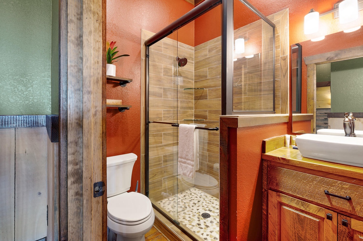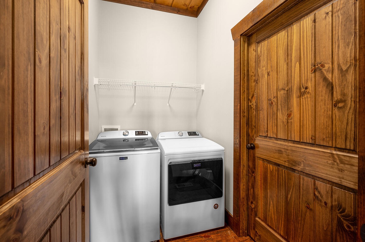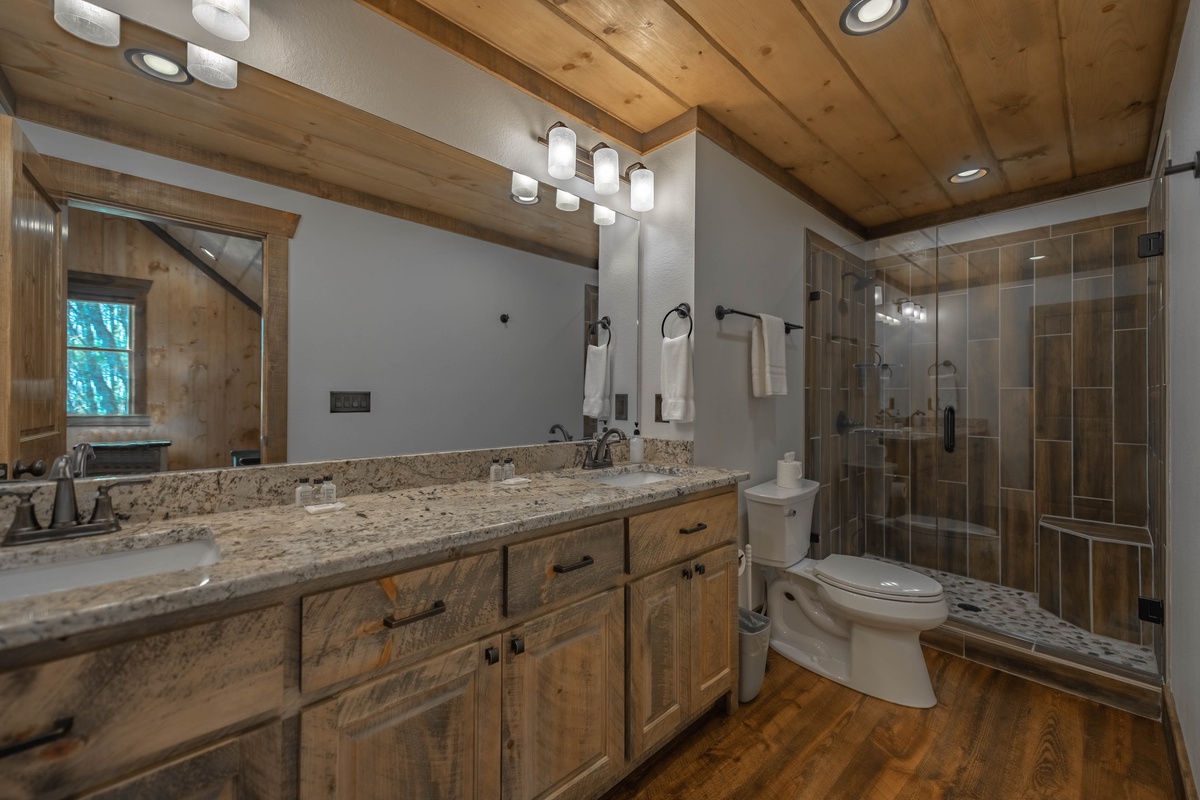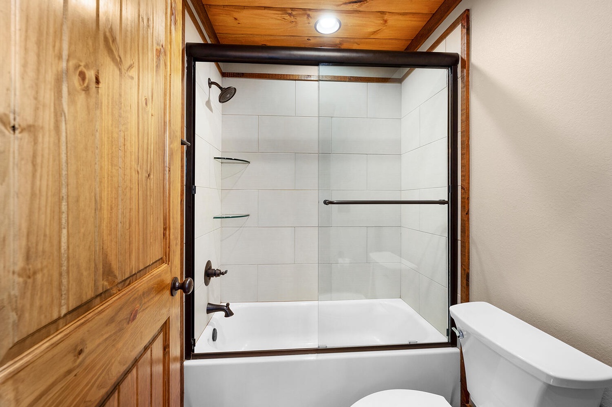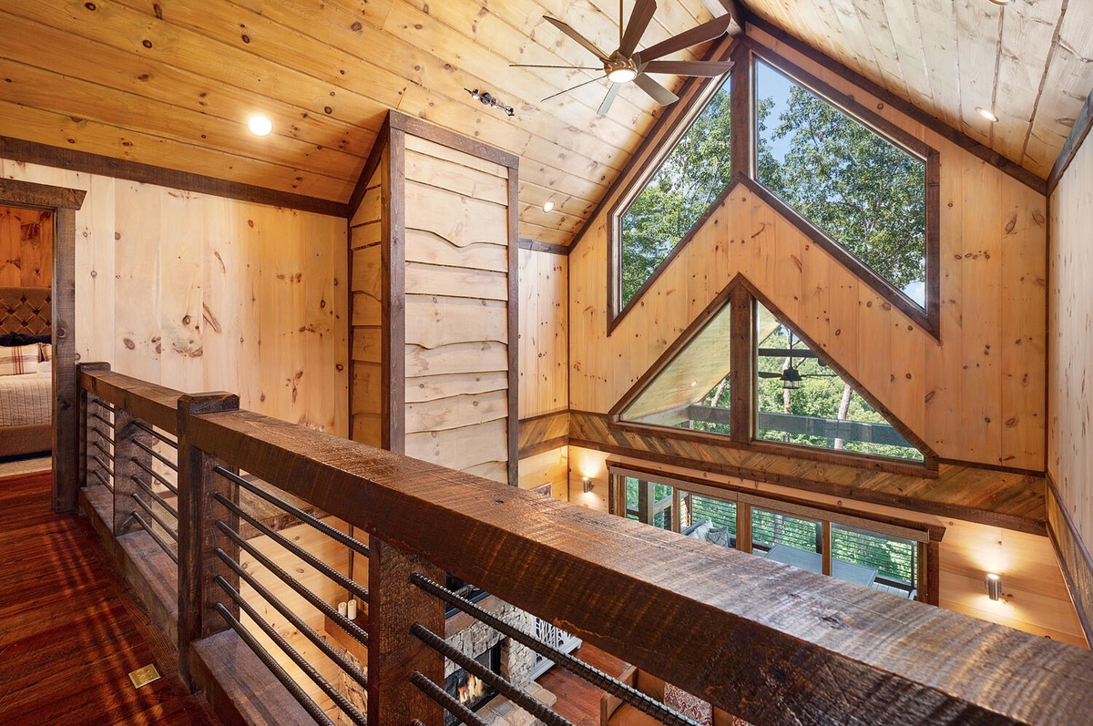 The lower level of this home is where the real fun begins! As you walk down, you will enter the open den with large leather sectional centered perfectly with a gas log fireplace and a 65" TV above. To the right is a pool table and a bar area with a full-sized fridge and a golden tee arcade game as well as card table with seating for 4. If you would like to take a rest from all the fun to be had in this level, it offers two bedrooms. The first offers a king-sized bed with an attached full bathroom boasting a walk-in shower and double vanities. Continue down the hall to the second bedroom that has not one, but two bunk beds with full sized mattresses. The kids will truly love this room! This level also has a full laundry room and second full bathroom with walk-in shower. As you make you way outdoors be ready for some mountain relaxation. The lower level deck has a 6-person hot tub as well as a gas log fireplace that has been raised so you can soak your troubles away all while enjoying the warm cozy fire. There is also a 42" TV above the gas fireplace so you can enjoy a movie or the big game!