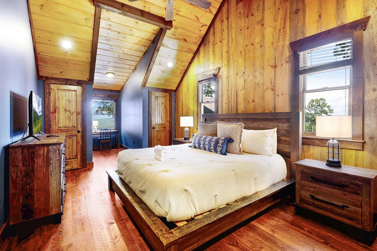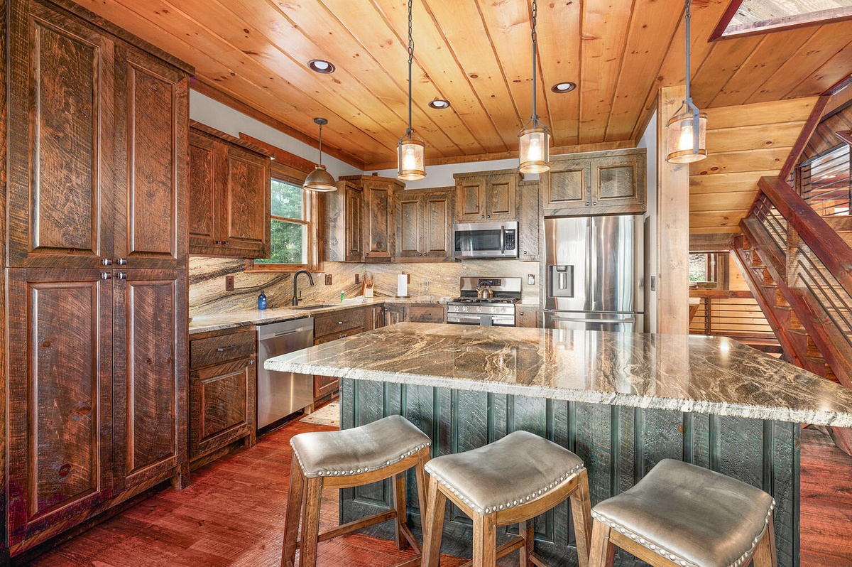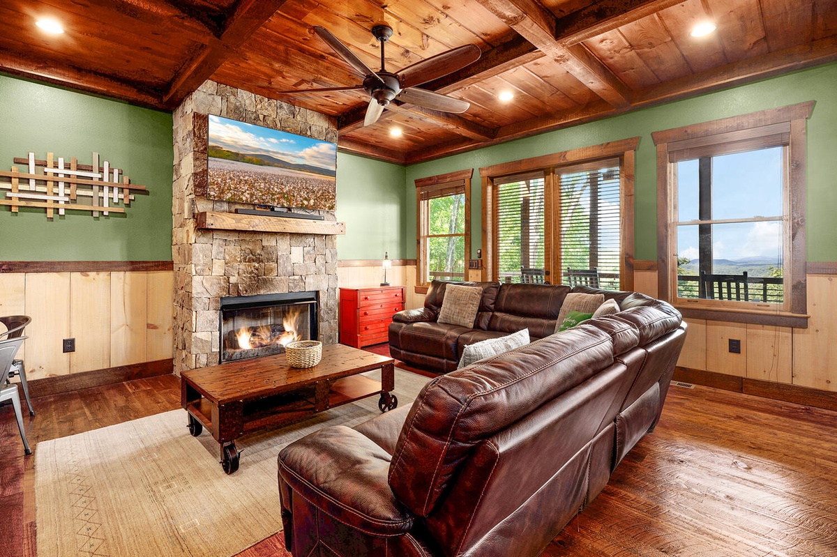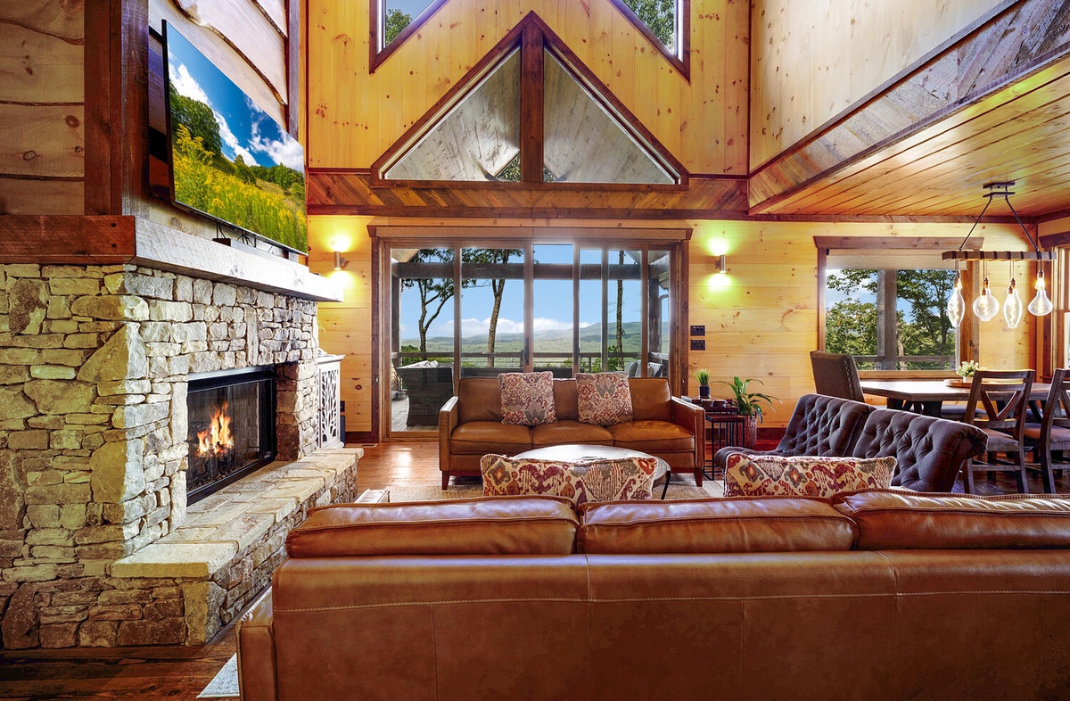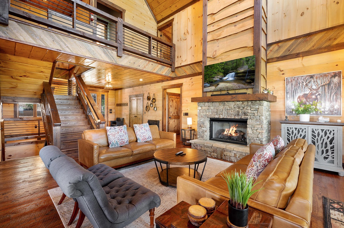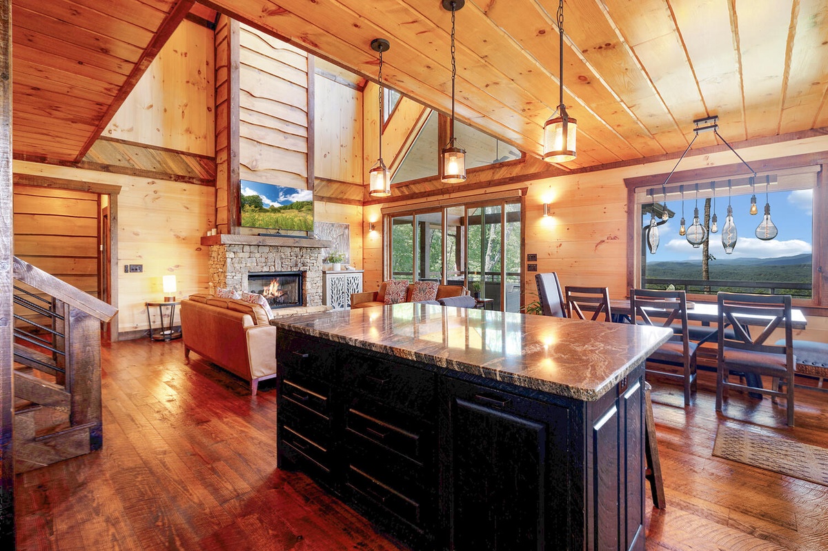 Step through the front door and immediately to your right is a queen size bedroom with TV and a private bathroom with double granite sinks and a shower/tub combo. Walking out of the bedroom you find yourself entering an open concept floor plan and find soaring cathedral ceilings, a gas log fireplace with large TV, deck access, and a beautiful living room! This living room is sure to take your breath away with the gorgeous year-round mountain views and the perfect décor and seating! You will find the primary king bedroom on this level to the left of the living room. This bedroom boasts a 42" TV, direct access to the expansive back deck, and an attached full bathroom with large walk-in shower, double granite vanities, and beautiful soaking tub. Just to the right of the living room is your dining area and fully equipped, all granite kitchen. Situated in the middle of the kitchen is a custom island with extra seating. The main level back deck offers long range mountain views, ample seating, a gas grill, and a wood burning fireplace with TV.
