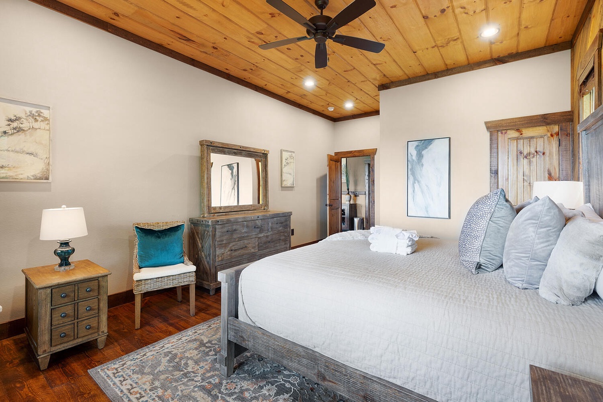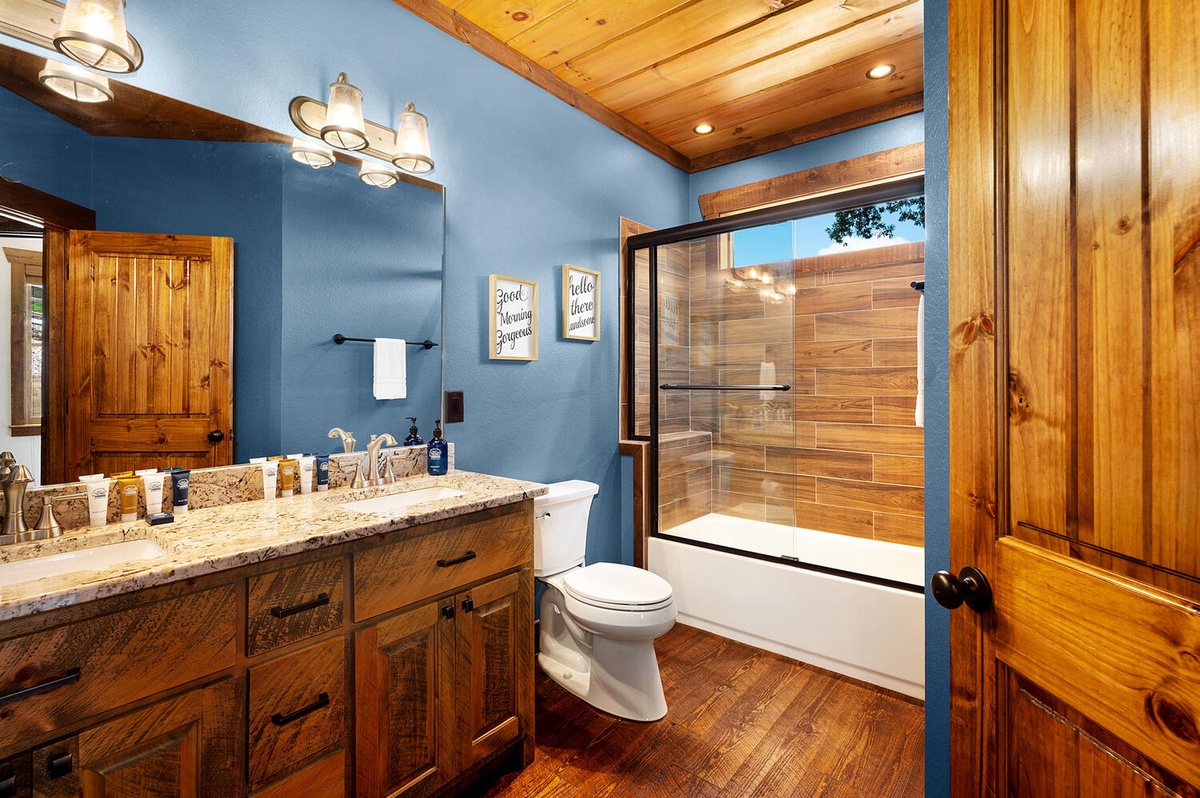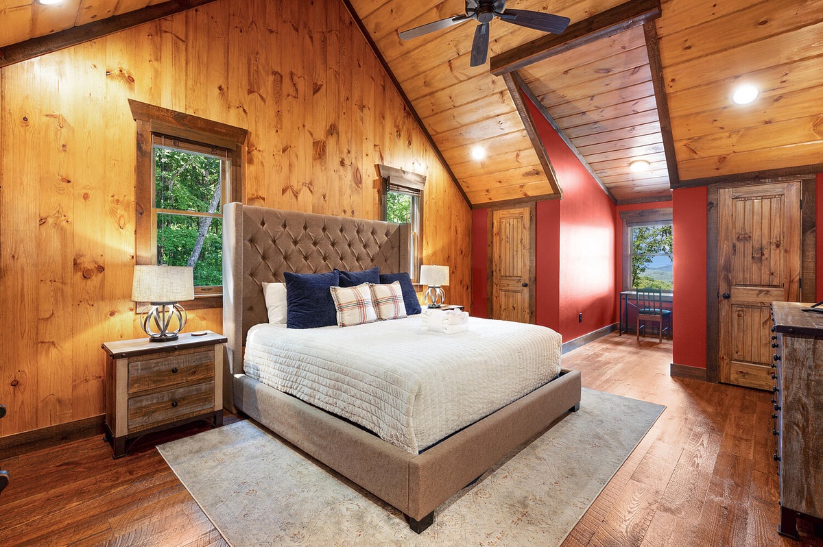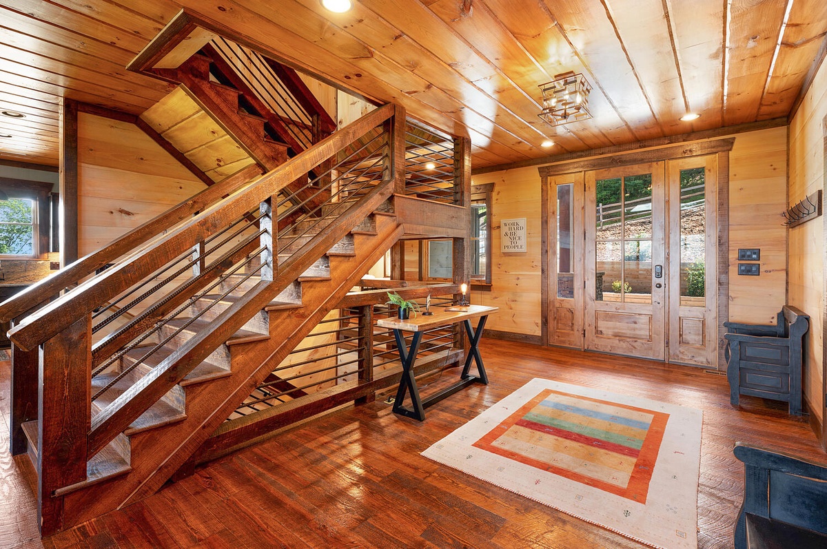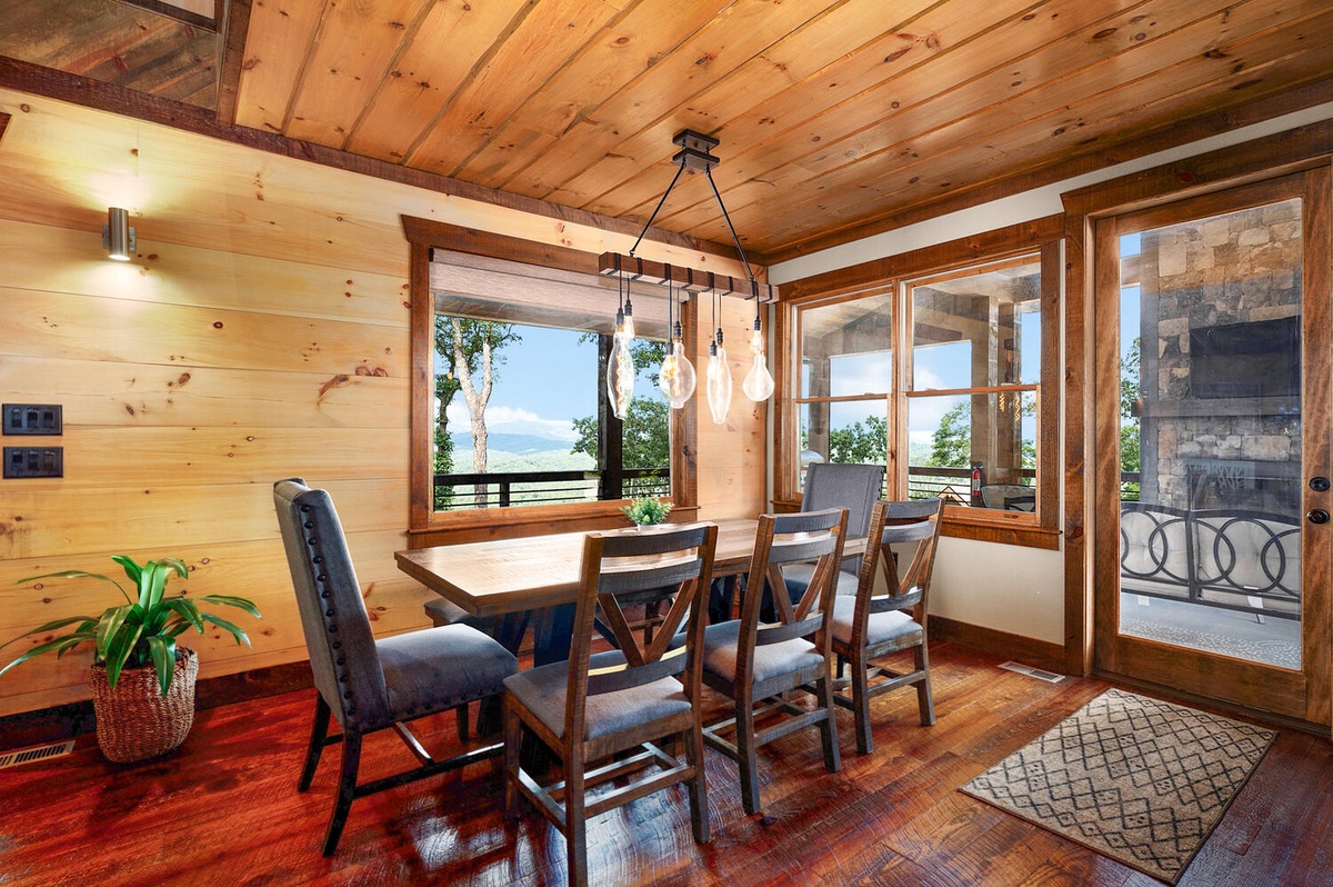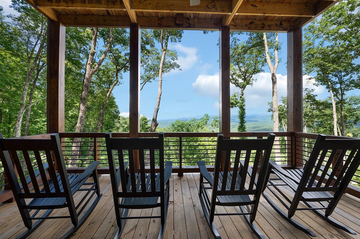 Step through the front door and immediately to your right is a queen size bedroom with TV and a private bathroom with double granite sinks and a shower/tub combo. Walking out of the bedroom you find yourself entering an open concept floor plan and find soaring cathedral ceilings, a gas log fireplace with large TV, deck access, and a beautiful living room! This living room is sure to take your breath away with the gorgeous year-round mountain views and the perfect décor and seating! You will find the primary king bedroom on this level to the left of the living room. This bedroom boasts a 42" TV, direct access to the expansive back deck, and an attached full bathroom with large walk-in shower, double granite vanities, and beautiful soaking tub. Just to the right of the living room is your dining area and fully equipped, all granite kitchen. Situated in the middle of the kitchen is a custom island with extra seating. The main level back deck offers long range mountain views, ample seating, a gas grill, and a wood burning fireplace with TV.