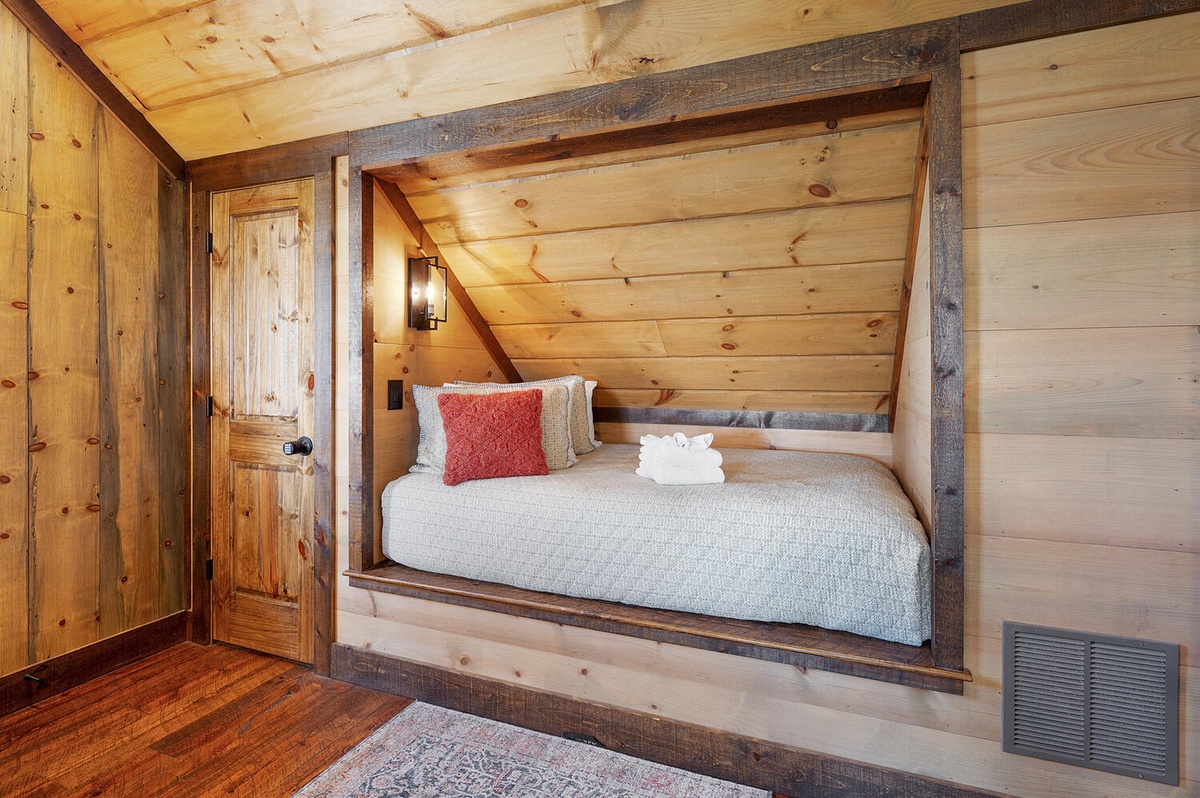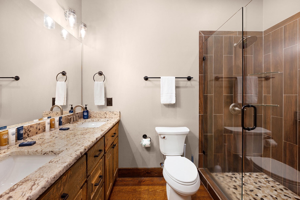 Now, let’s go see what the rest of the house has to offer as we go through the living area up to the upper level. This level has two bedrooms; on the left you have a king bedroom with TV and full-size bed built into the wall. As you walk down the open walkway you will notice a full bathroom with double granite vanity with a shower tub combo. Continuing down the walkway you enter a second bedroom that consist of a king bed, TV and an attached bathroom featuring double granite sinks and a walk-in tile shower.