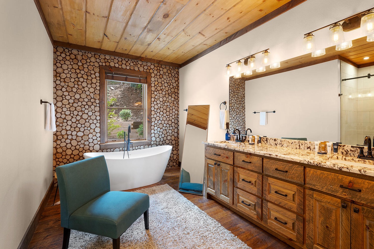 - Double vanities, rainfall shower, free standing soaking tub, accent chair