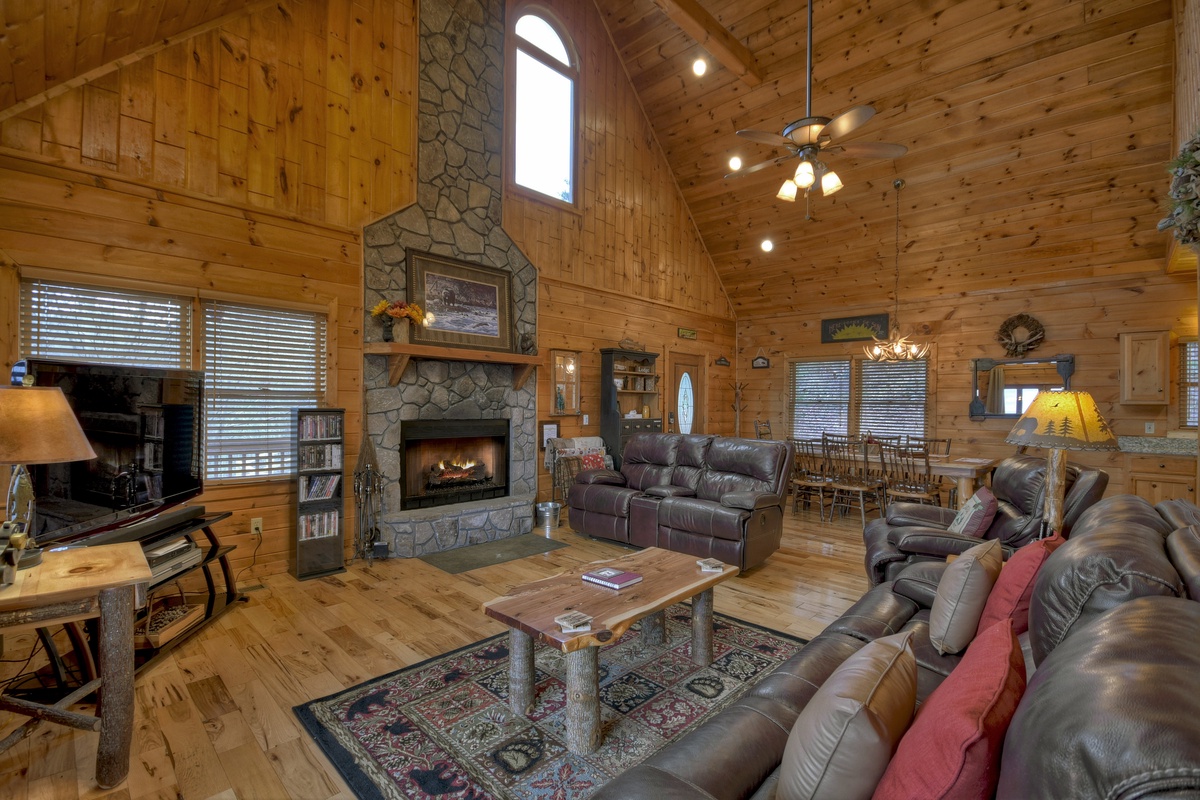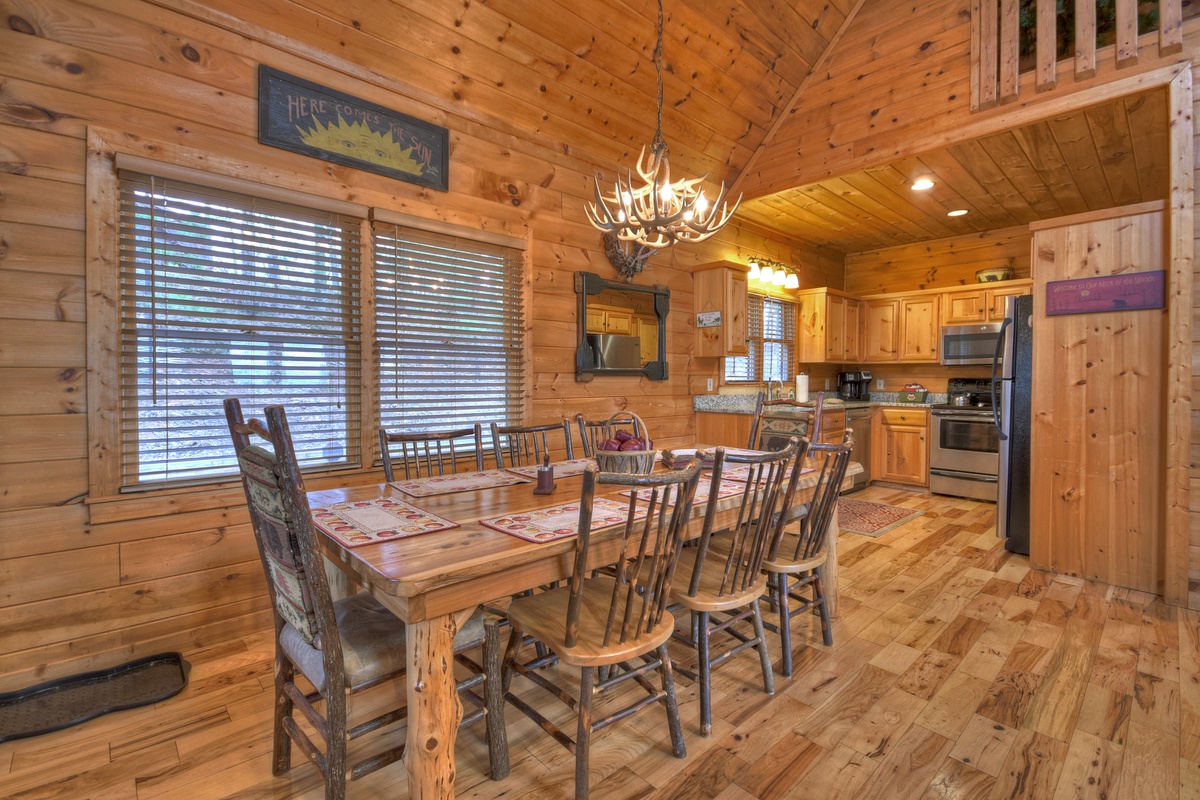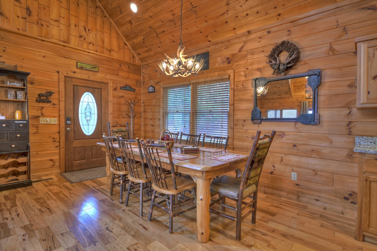 When walking into this lovely cabin, you truly get to feel what it is like to live in the mountains. High ceilings and leather furnishings certainly set this cabin apart from the rest. This home has a fully equipped kitchen with stainless steel appliances for all your cooking needs, and where else to eat your meal than a dining area seated for 8 so the whole family can feast together.