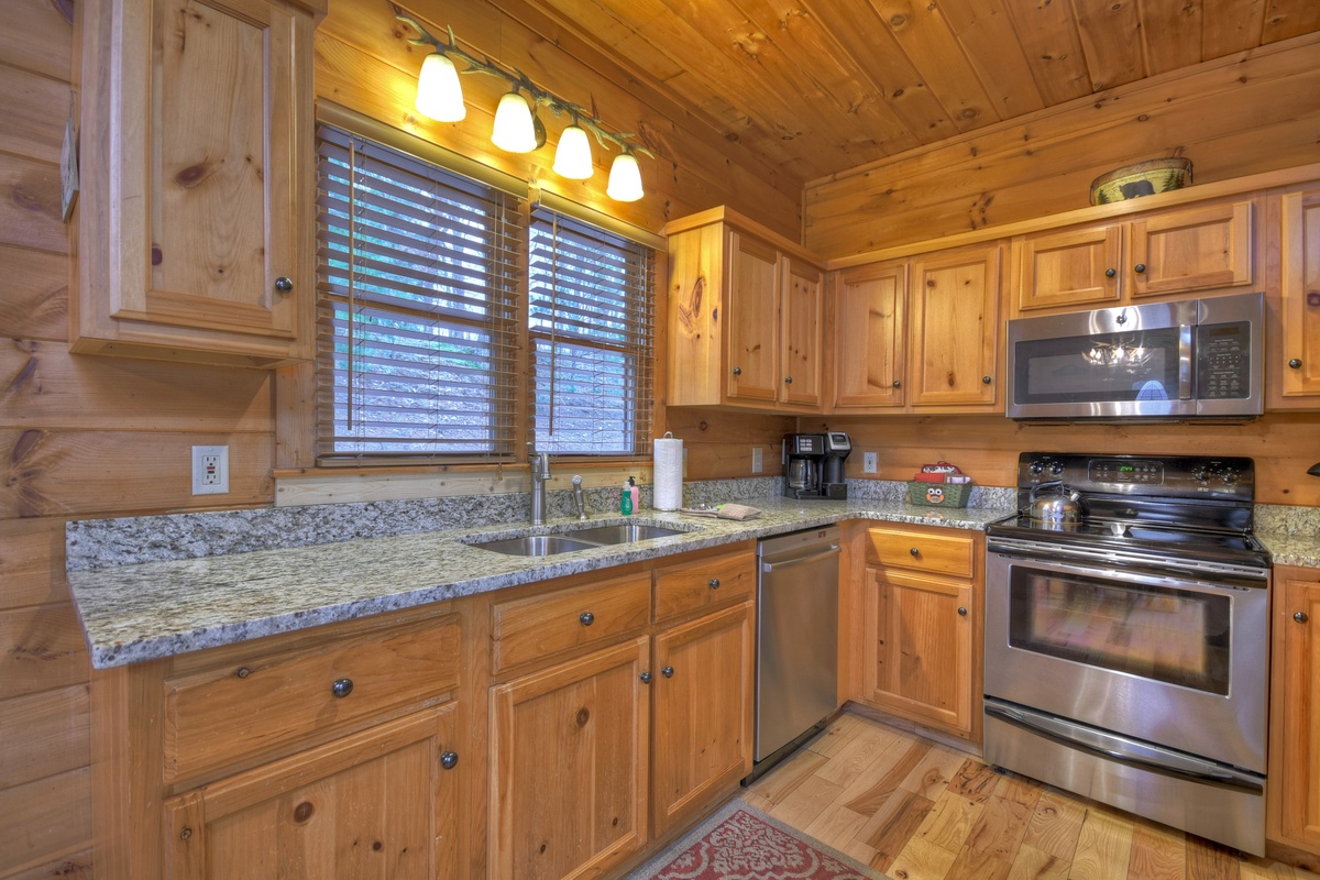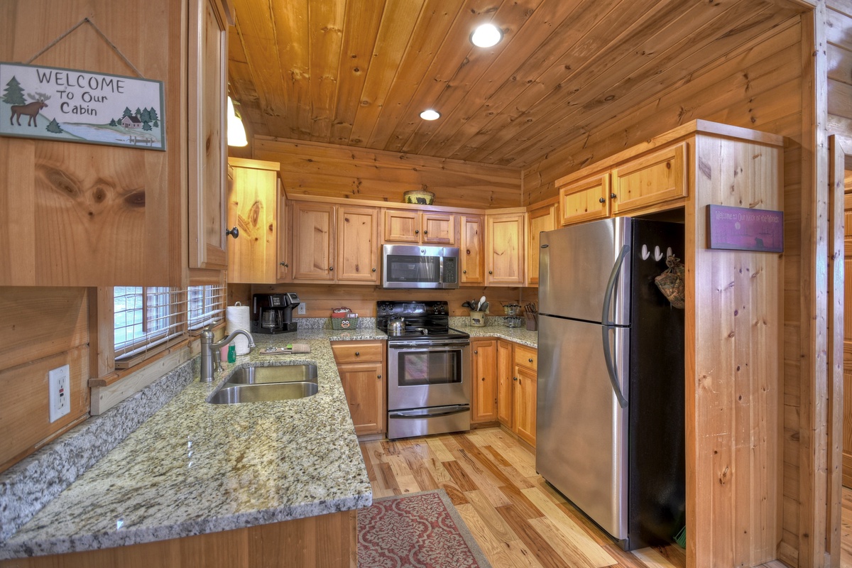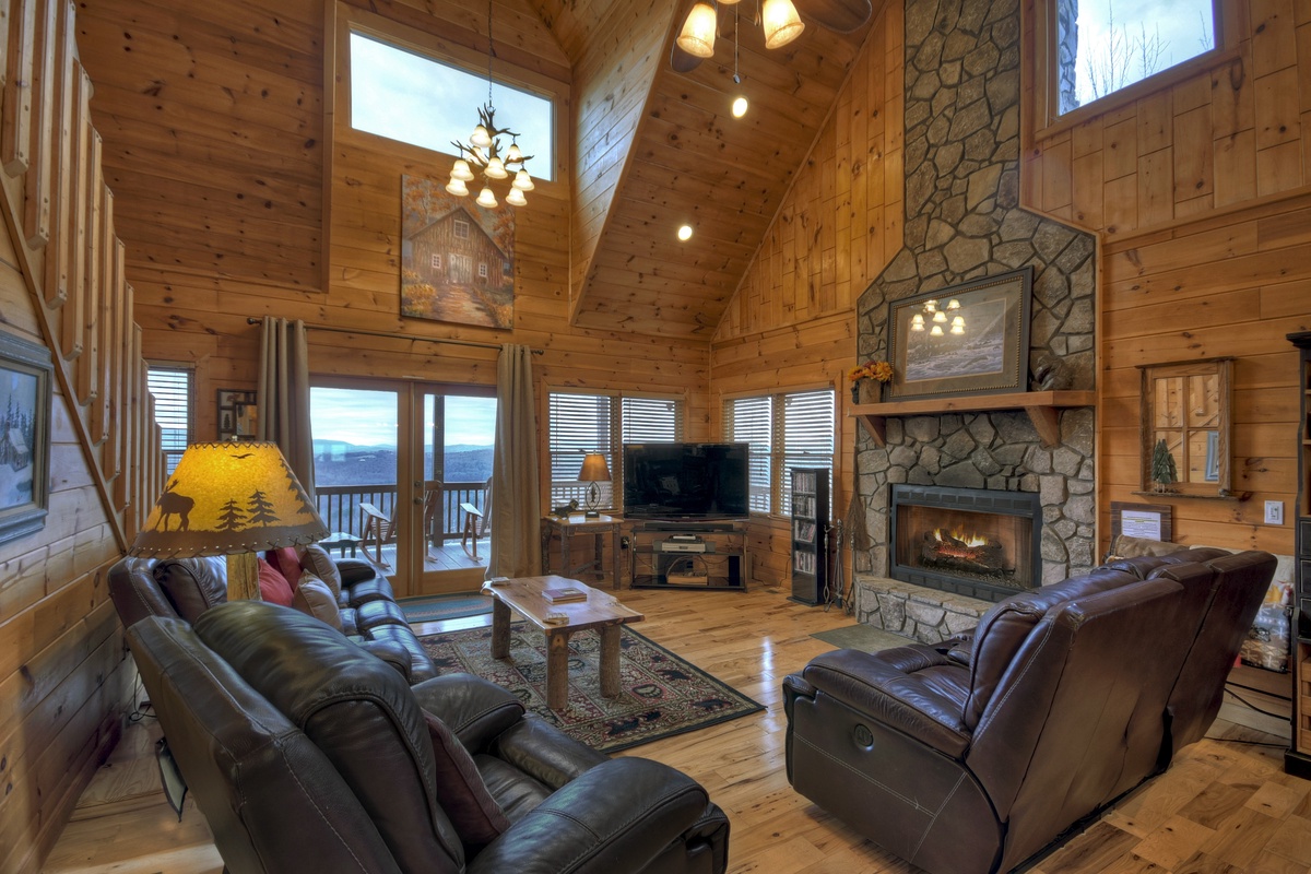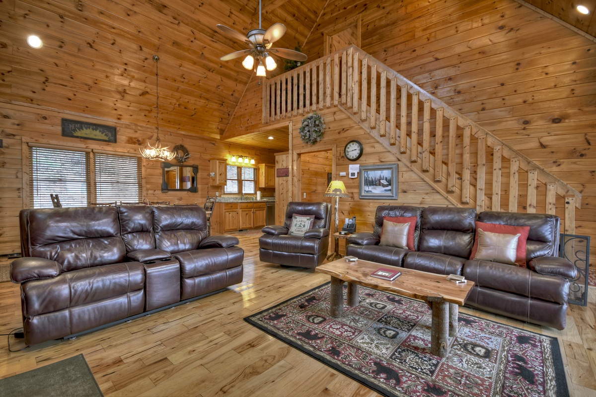 When walking into this lovely cabin, you truly get to feel what it is like to live in the mountains. High ceilings and leather furnishings certainly set this cabin apart from the rest. This home has a fully equipped kitchen with stainless steel appliances for all your cooking needs, and where else to eat your meal than a dining area seated for 8 so the whole family can feast together.