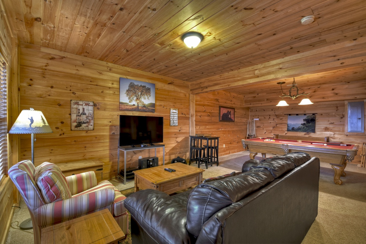 - Carpeted living room with 48" TV, arm chair, leather sofa seating 3-4