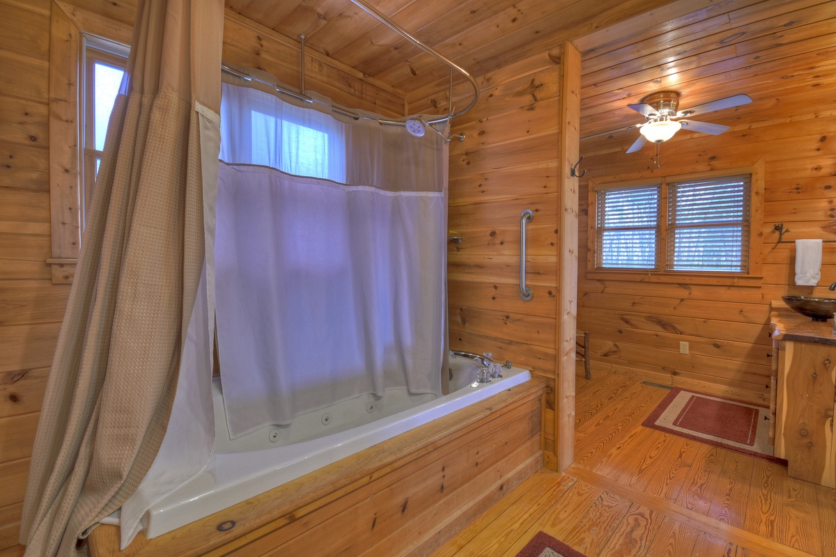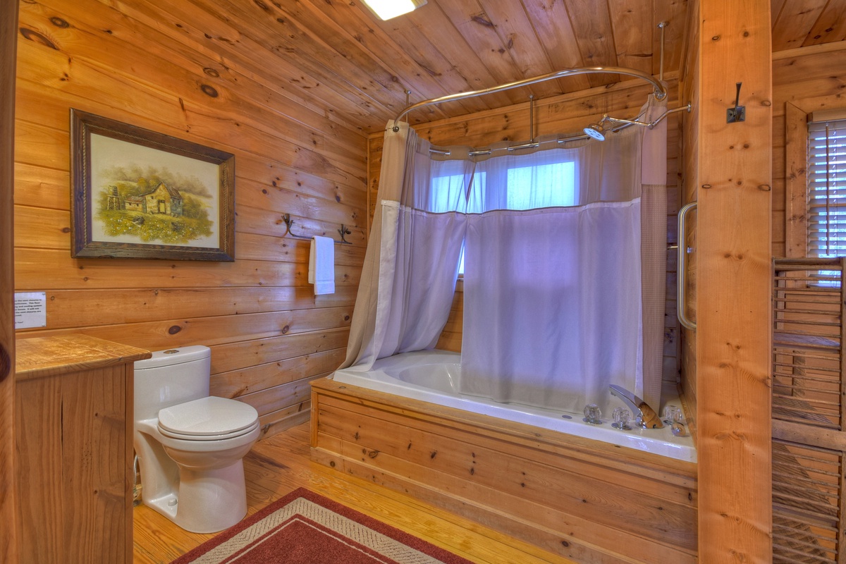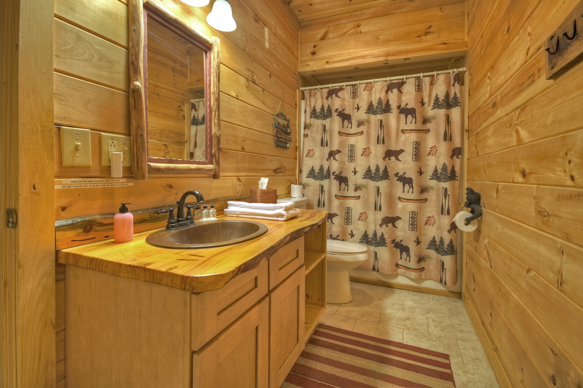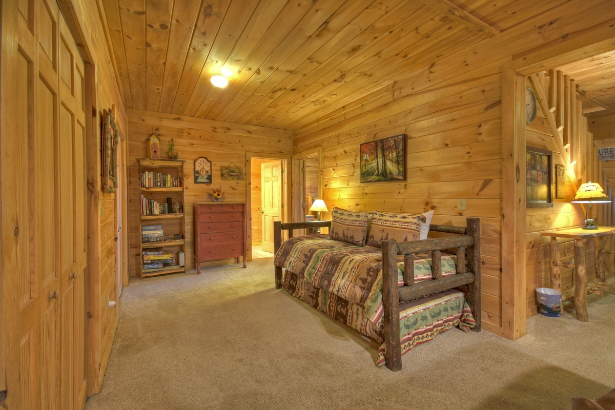 While this home has common spaces for your family to enjoy one another, it also offers much privacy in that each floor has its own bedroom and bathroom. Bedroom 1 is on the entry level and has a king size bed and full closet. The master suite can be found on the upper level of this mountain home and offers a king size bed, 42" TV, and an attached full bathroom. The third bedroom is located in the basement level and offers a king size bed and a 48" TV with a DVD/ VCR player. In the event you want to have a mid-day snooze and find all the rooms are taken, no fear! This cabin also offers an extra twin size day bed in the basement den.