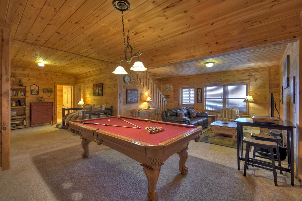 After some rest from a surely eventful day, it is time to let the fun begin. Start with watching your favorite shows, or the big game on the 50" TV in the entry level living room, or the 48" TV offered in the lower level den. While hanging out in the den, strike up a game of pool or another one of the board games offered! You can watch the sunset in one of the wooden outdoor rockers, or from the view facing hot tub on the lower deck. Finally, feel free to wander over to the spacious outdoor firepit and roast marshmallows, or snuggle up with the one you love while watching the stars over the Amazing View.