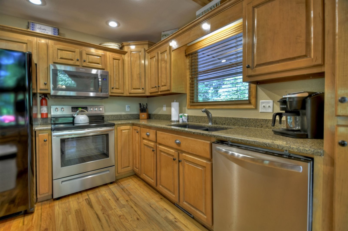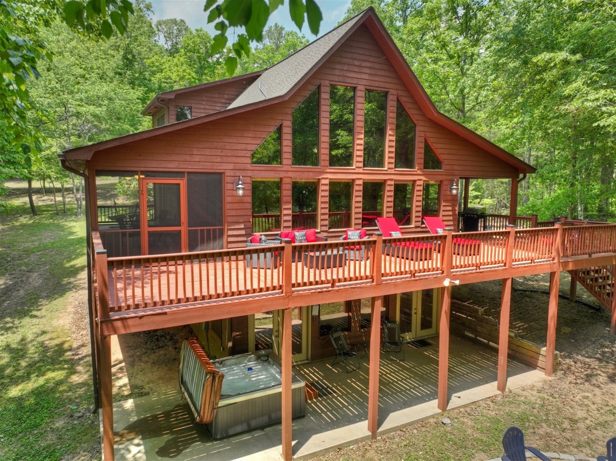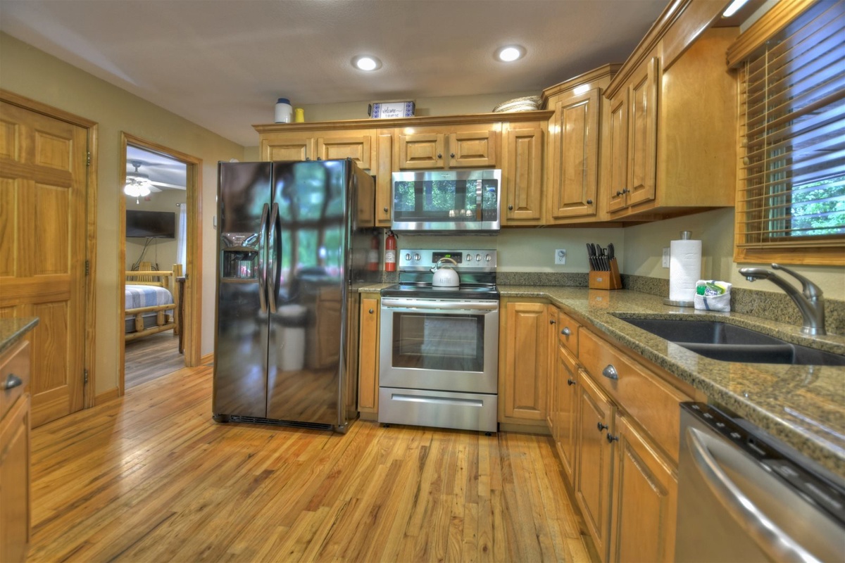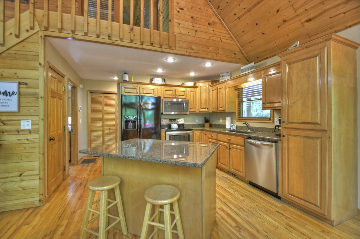 The heart of the cabin is its spacious, well-equipped kitchen featuring gleaming granite countertops. Whether you're a culinary enthusiast or just want to prepare a quick meal, you'll find everything you need here to whip up delicious dishes. Share meals with loved ones at the dining area, or take advantage of the screened-in deck to savor your meals with a refreshing breeze and stunning views of the lake.