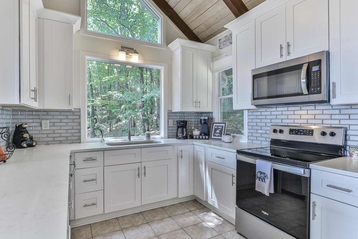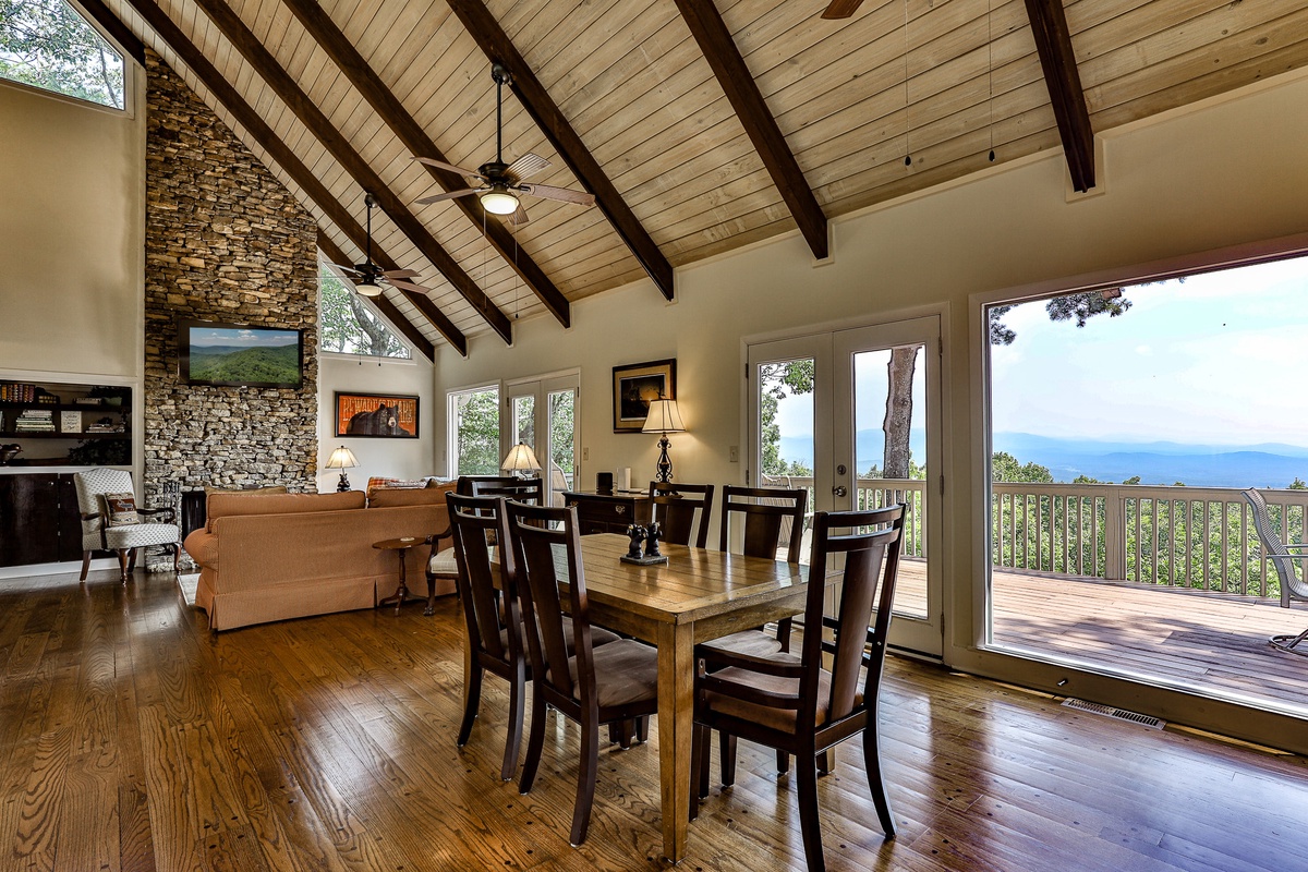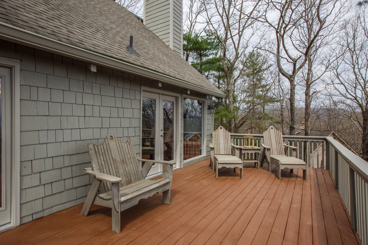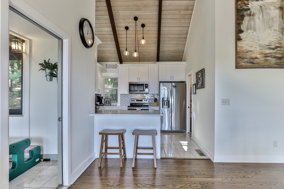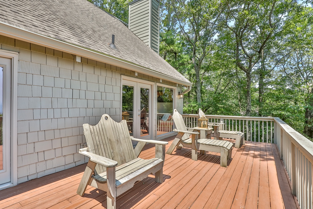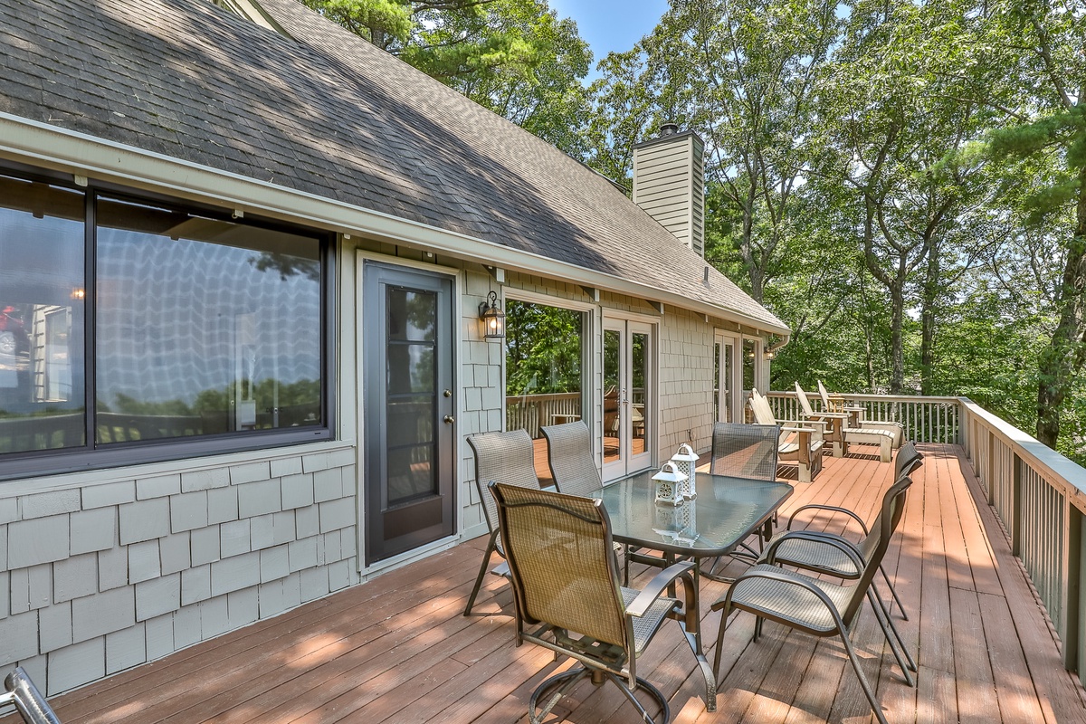The well-appointed open-plan kitchen allows chefs to create meal magic without missing any of the fun. The charming kitchen is well-stocked for cooking and has counter seating for three. Guests can also find a coffee and tea bar with Keurig and drip coffee makers and an electric kettle. The indoor dining room seats six and is adjacent to the kitchen. Outside on the deck, a second dining area offers fantastic views and beautifully appointed seating.