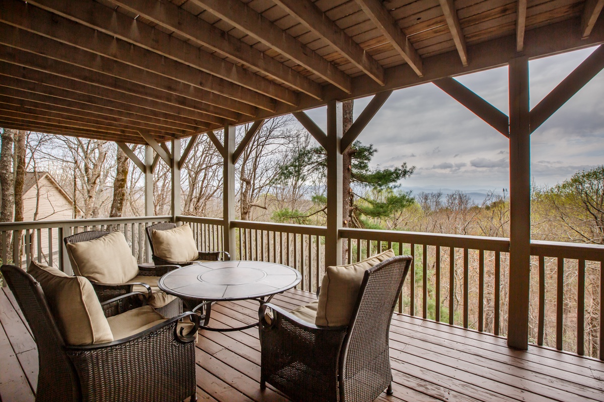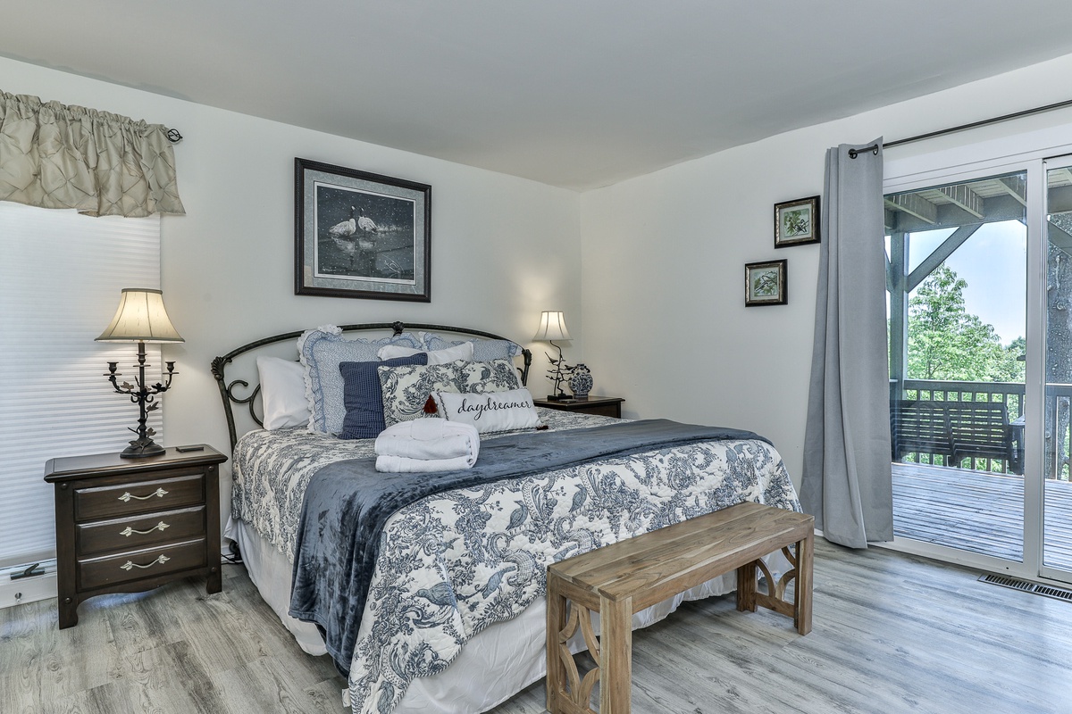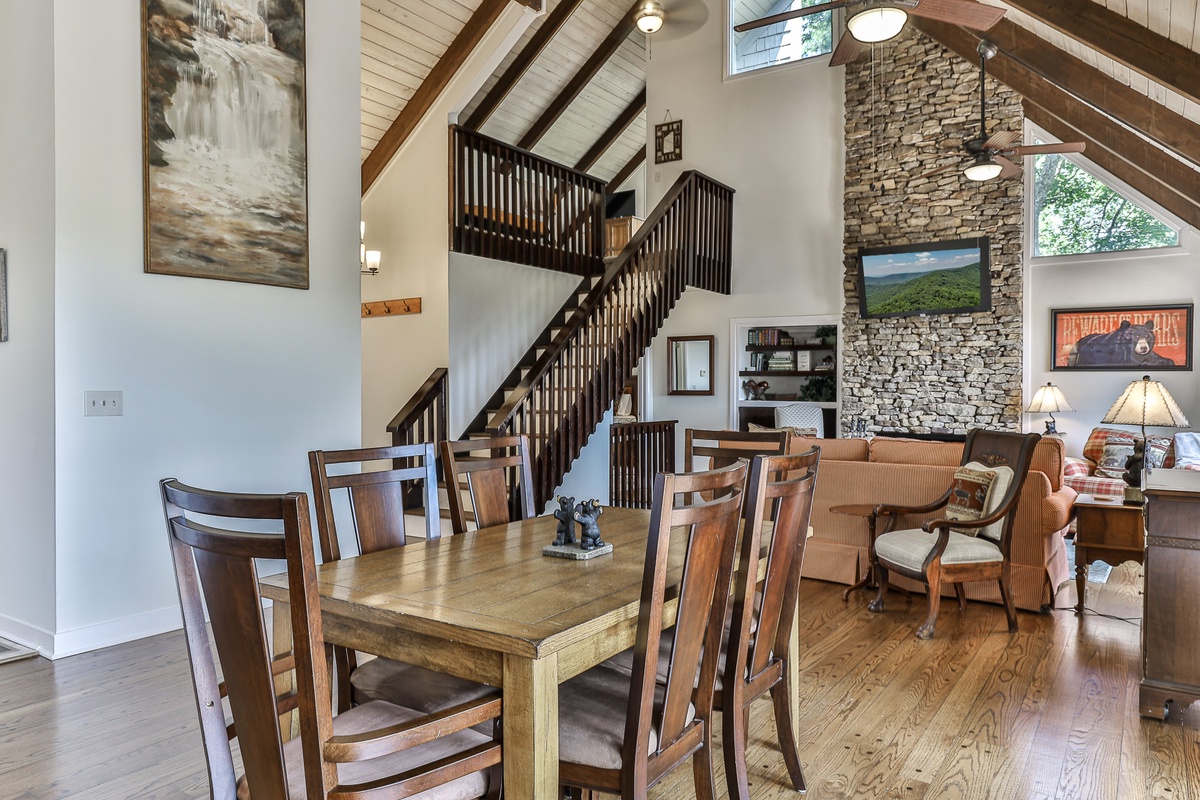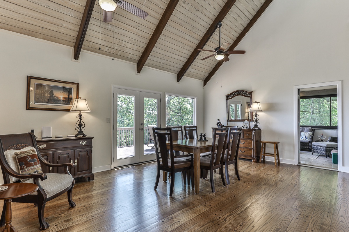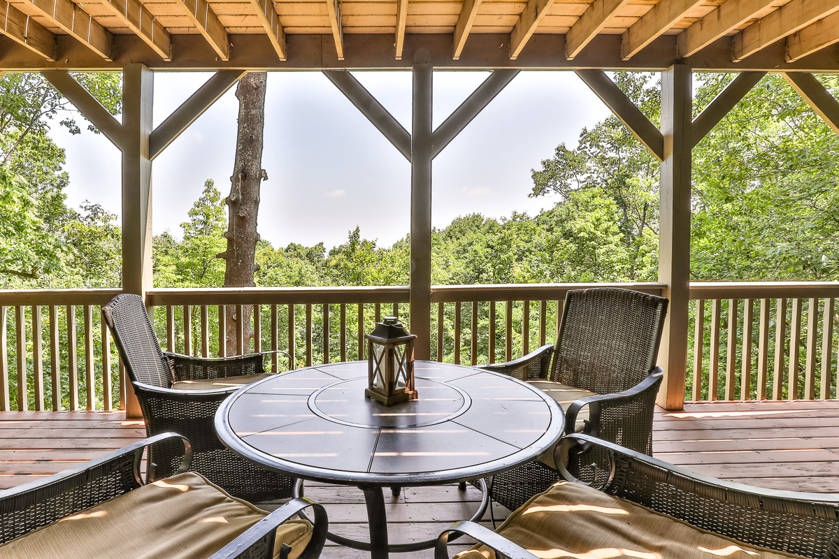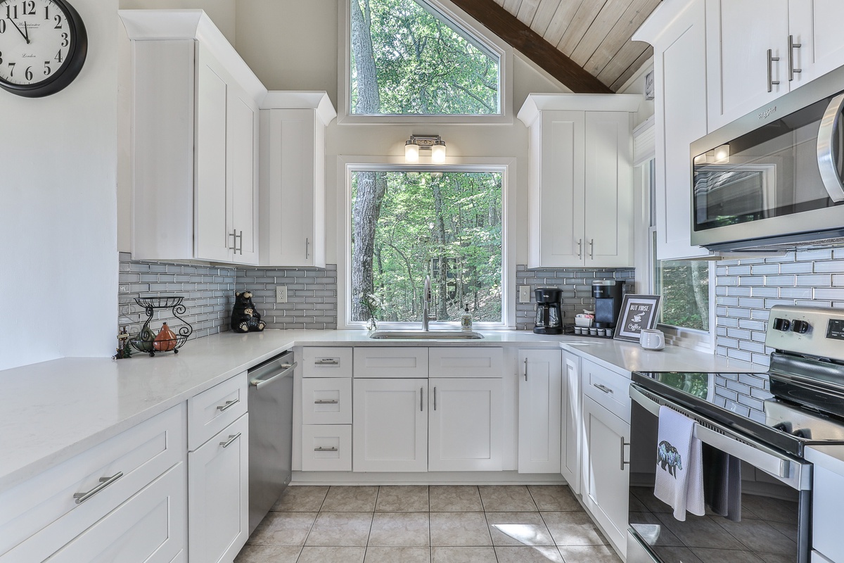 The well-appointed open-plan kitchen allows chefs to create meal magic without missing any of the fun. The charming kitchen is well-stocked for cooking and has counter seating for three. Guests can also find a coffee and tea bar with Keurig and drip coffee makers and an electric kettle. The indoor dining room seats six and is adjacent to the kitchen. Outside on the deck, a second dining area offers fantastic views and beautifully appointed seating.