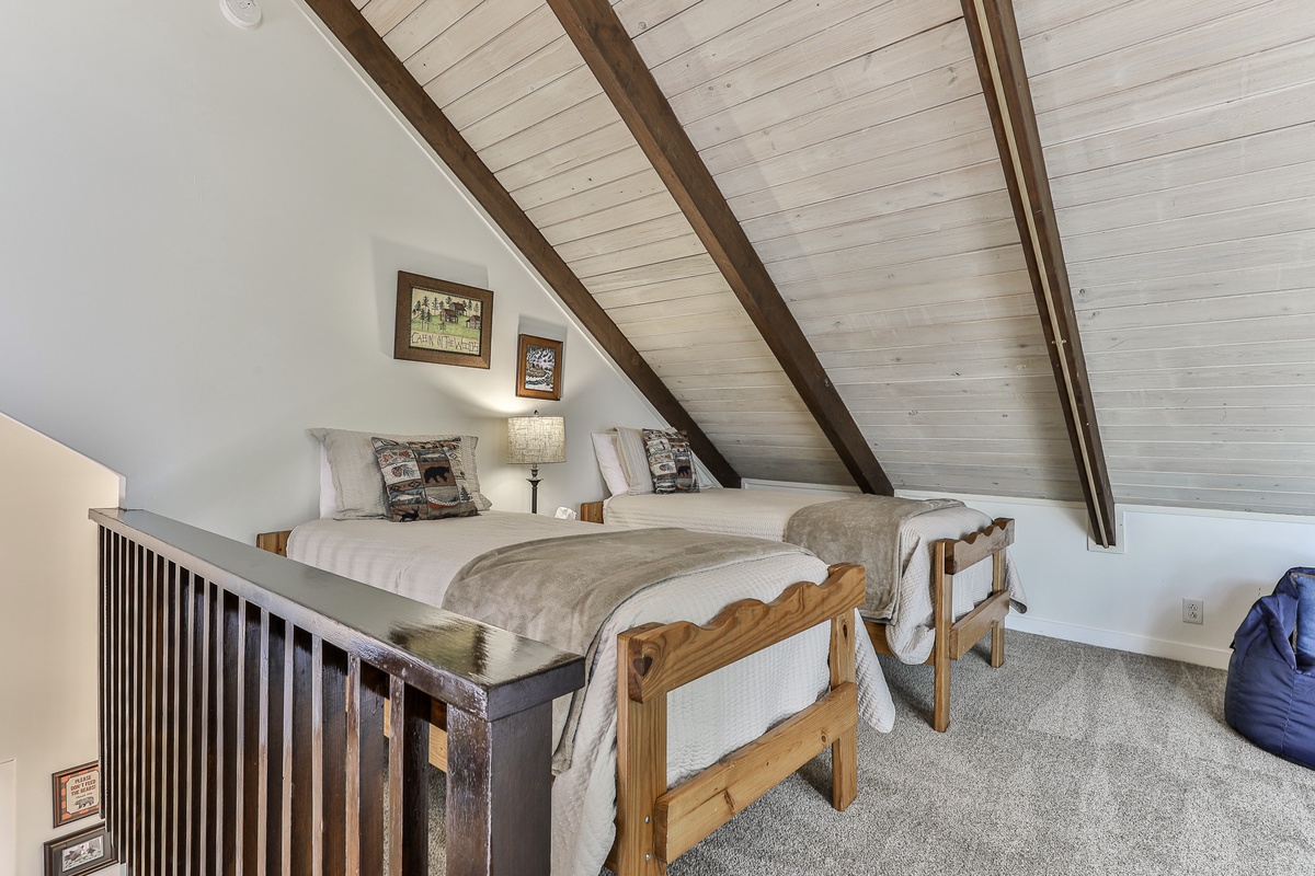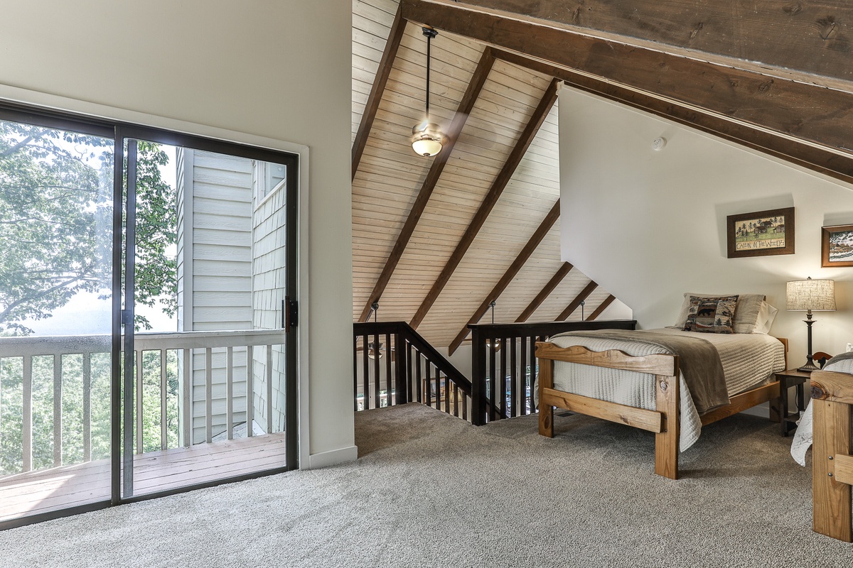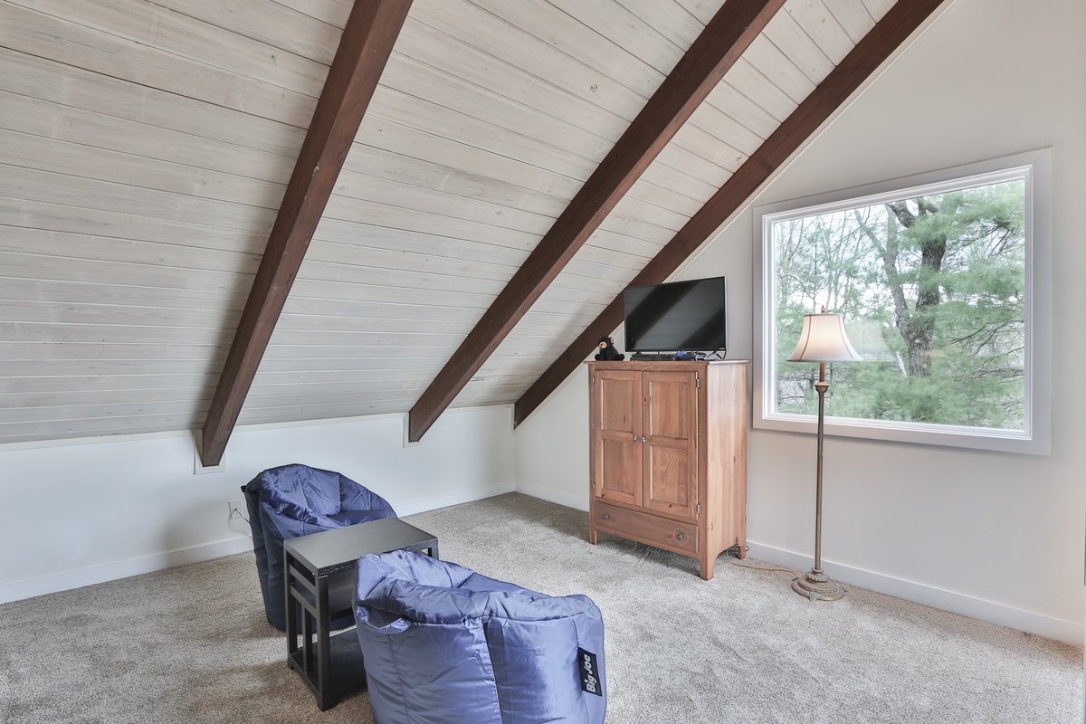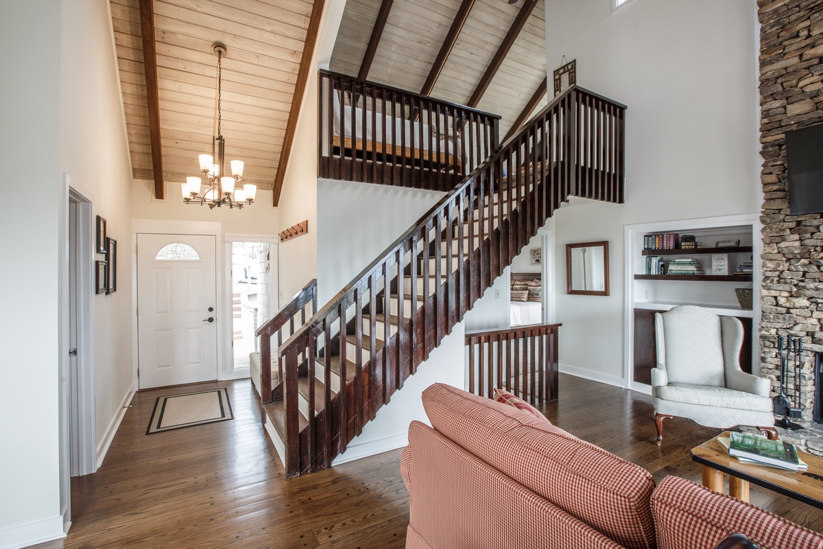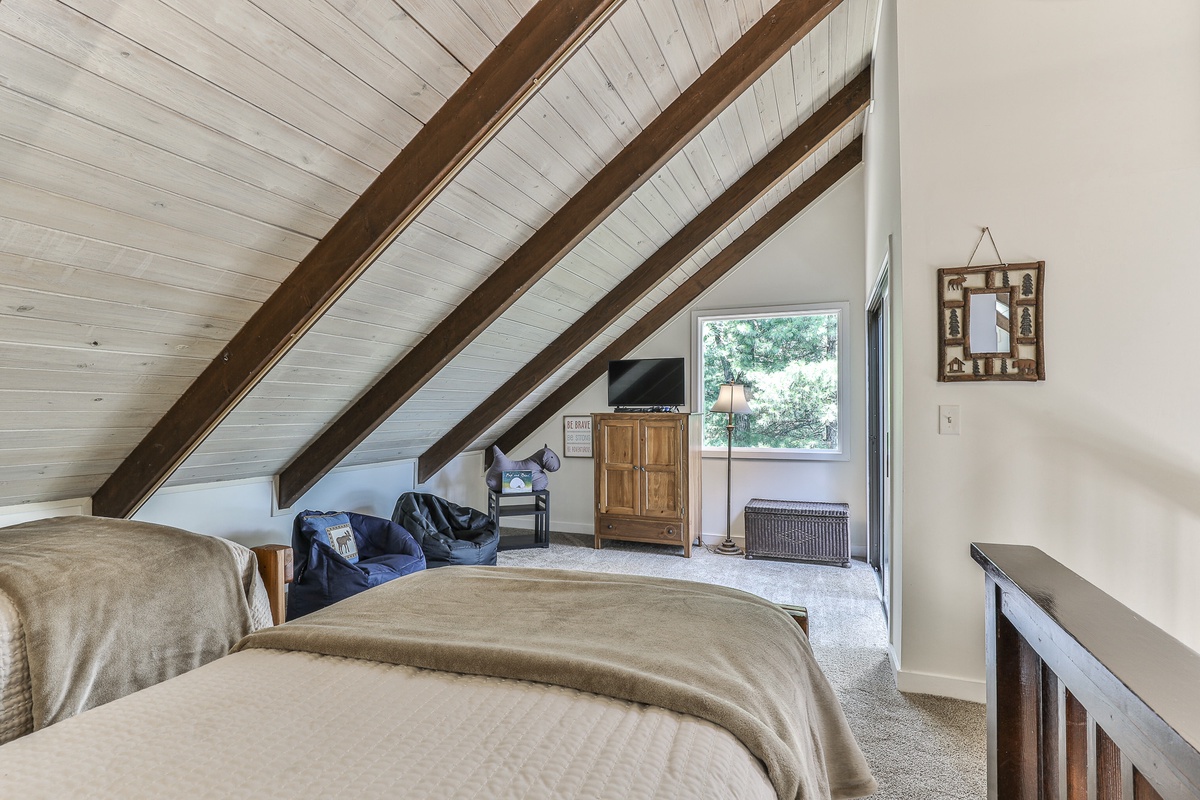 The primary bedroom is on the main floor (queen bed) and has an attached bathroom. Upstairs, nestled in the trees, is a cozy loft space with two twin beds and space for relaxing. On the terrace level are two additional bedrooms (king bed and queen bed) which share a beautifully updated Jack and Jill bathroom. There is an additional half bath in the entry area.