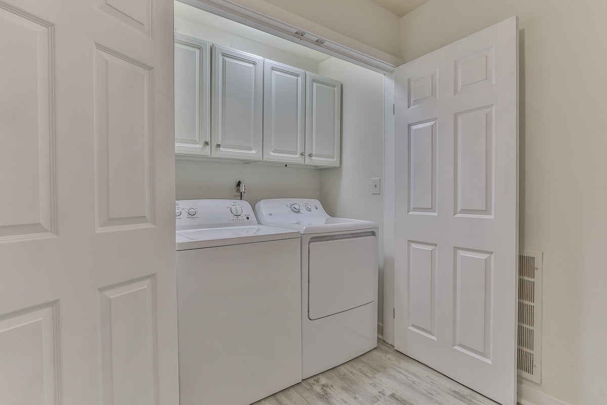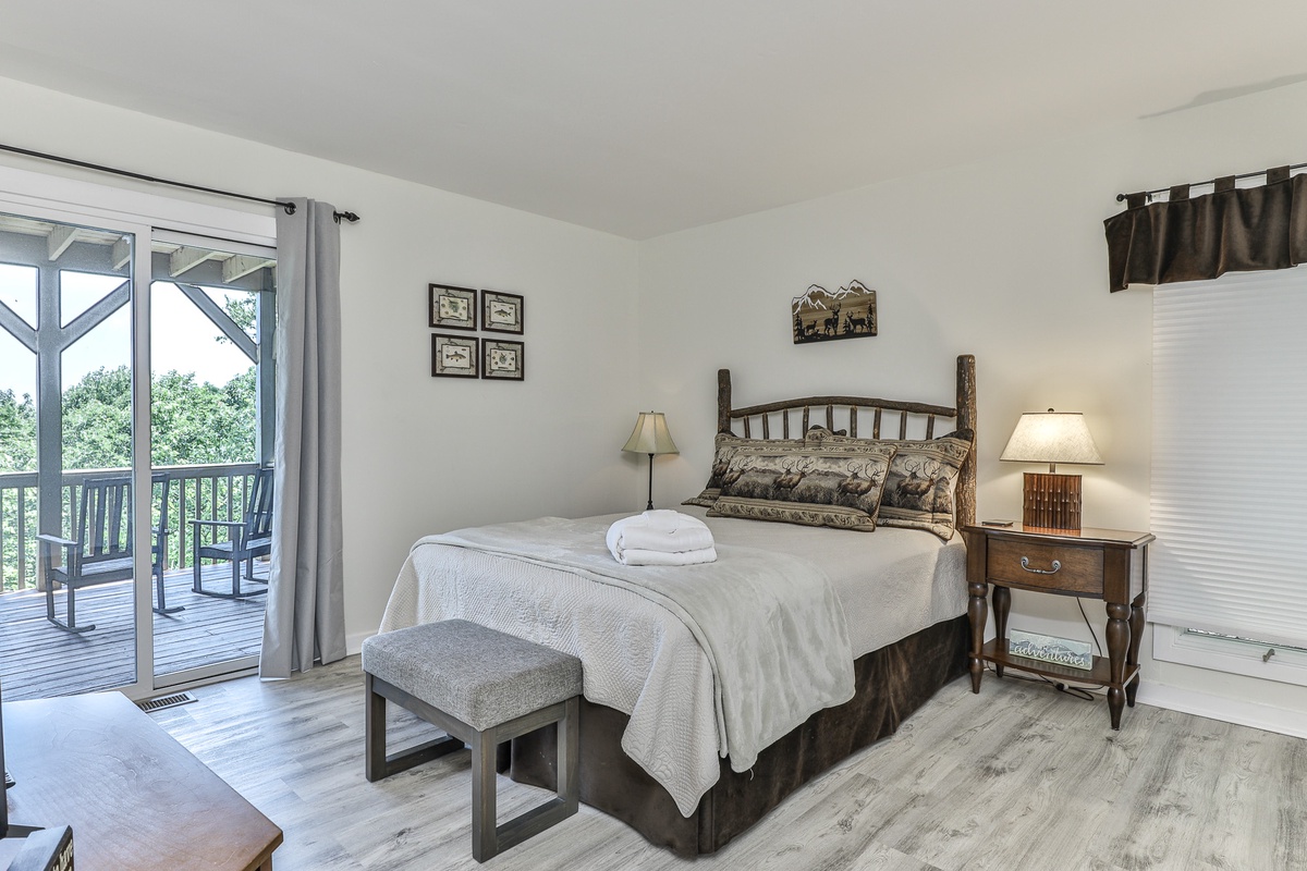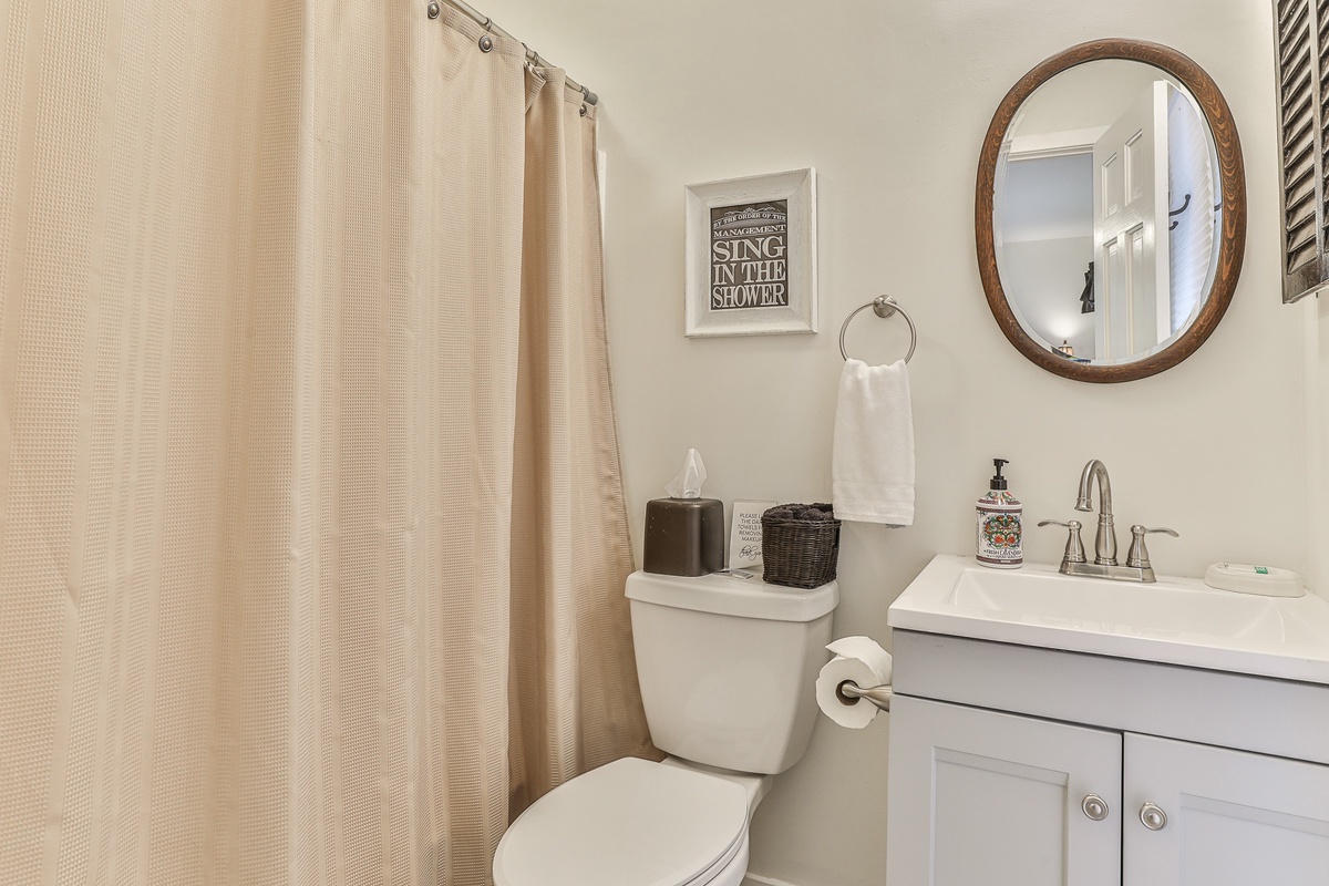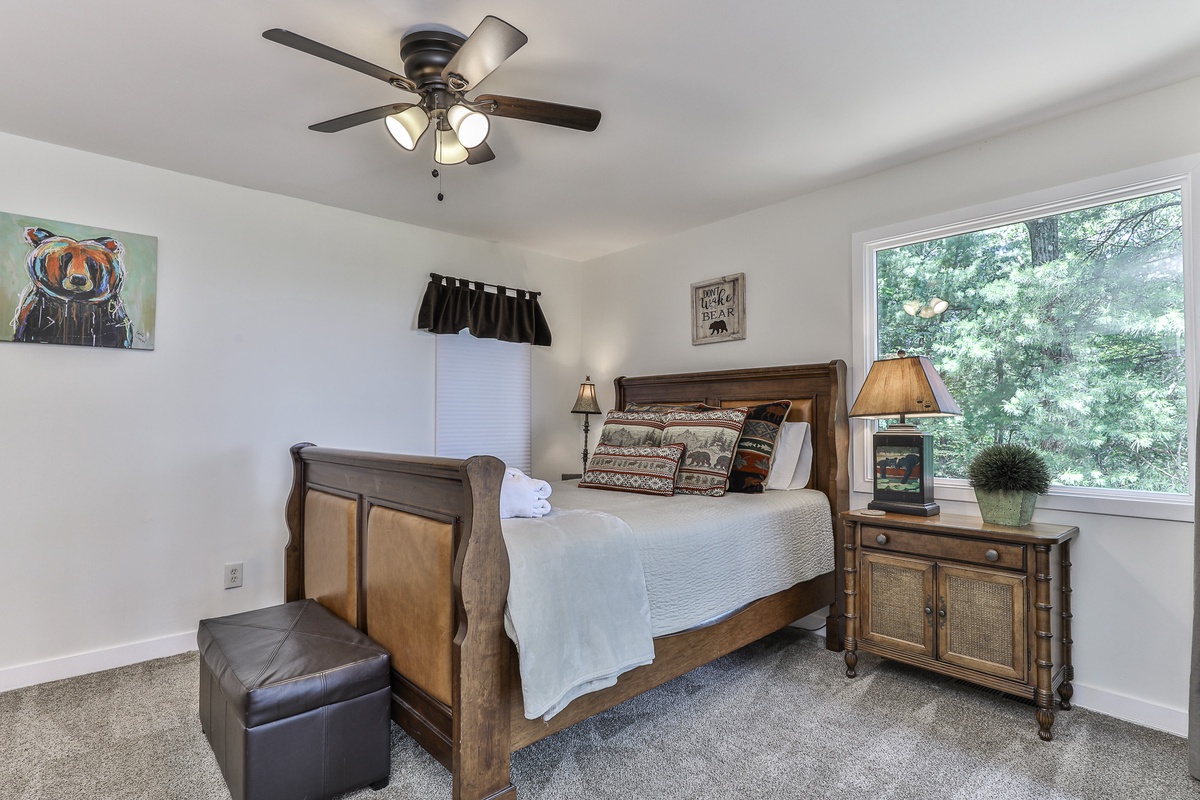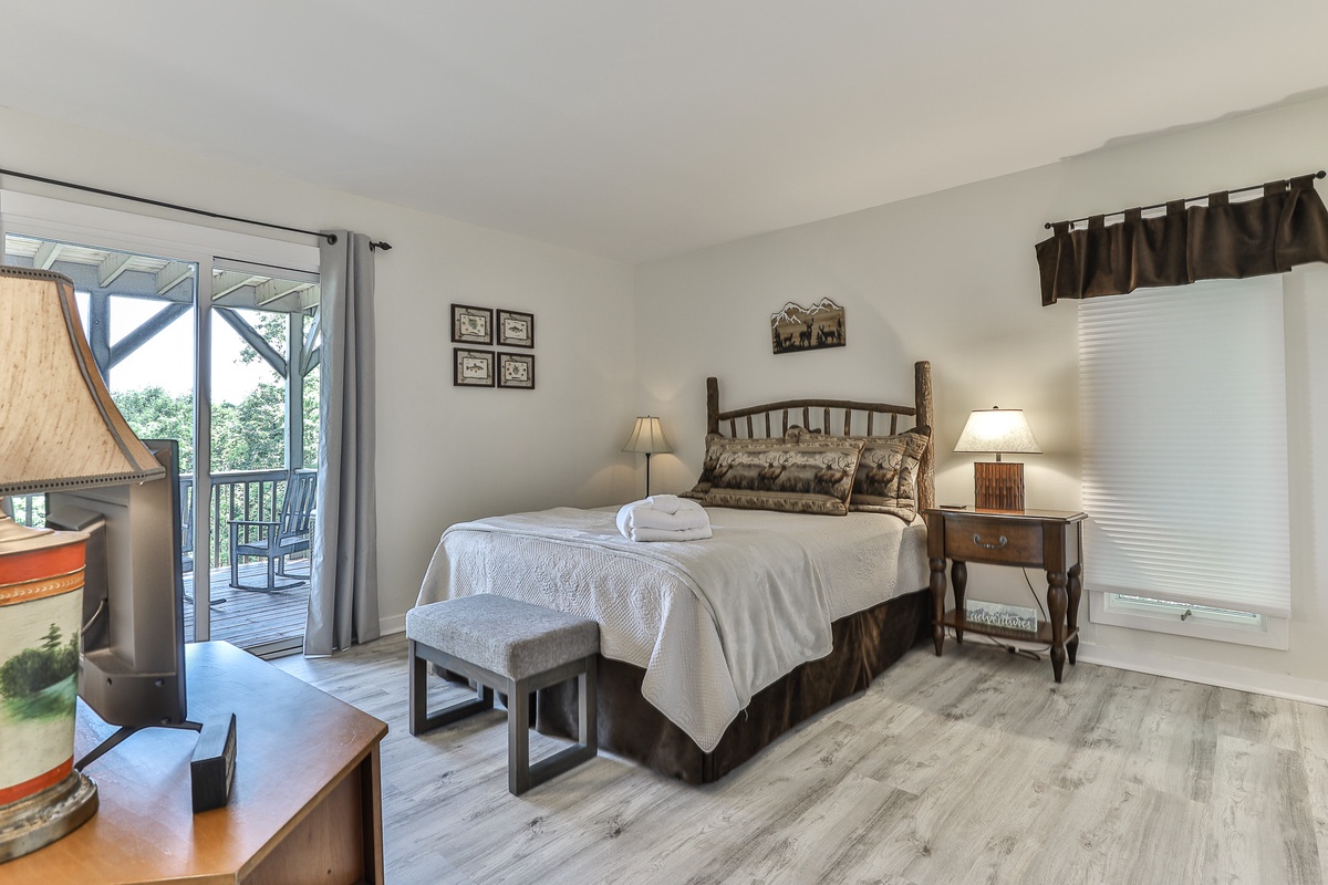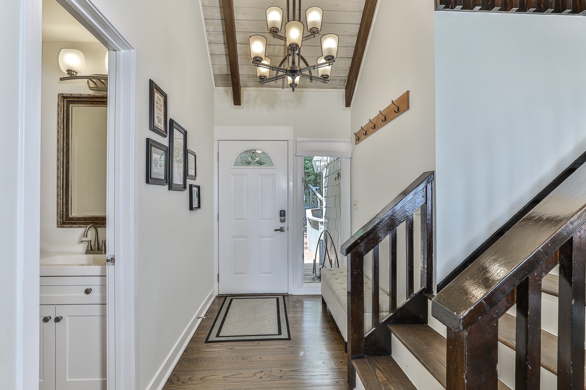 The primary bedroom is on the main floor (queen bed) and has an attached bathroom. Upstairs, nestled in the trees, is a cozy loft space with two twin beds and space for relaxing. On the terrace level are two additional bedrooms (king bed and queen bed) which share a beautifully updated Jack and Jill bathroom. There is an additional half bath in the entry area.