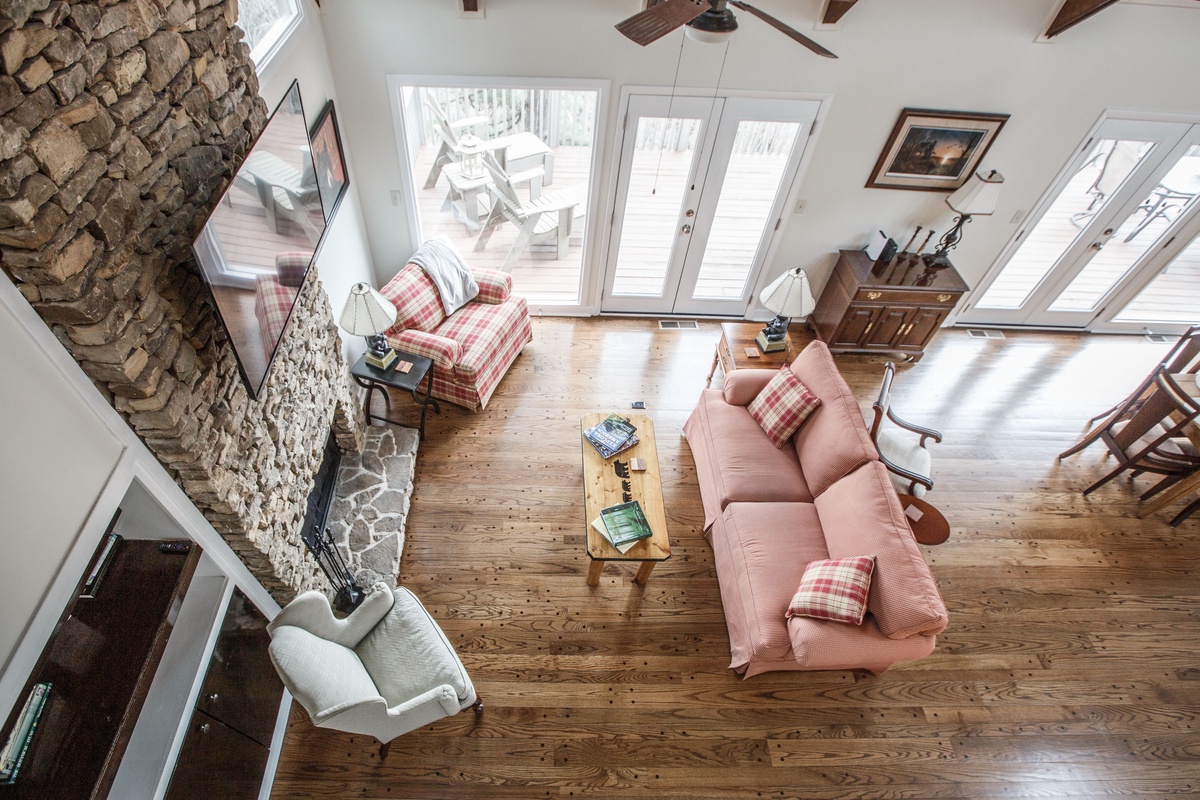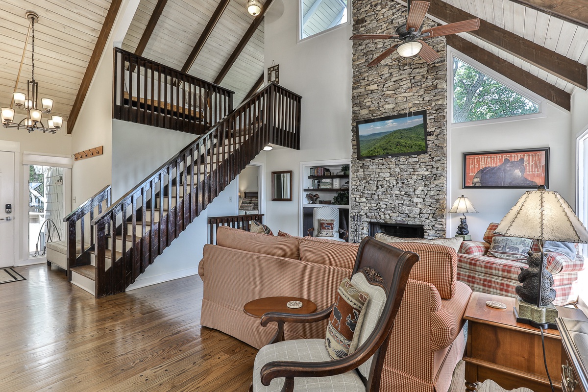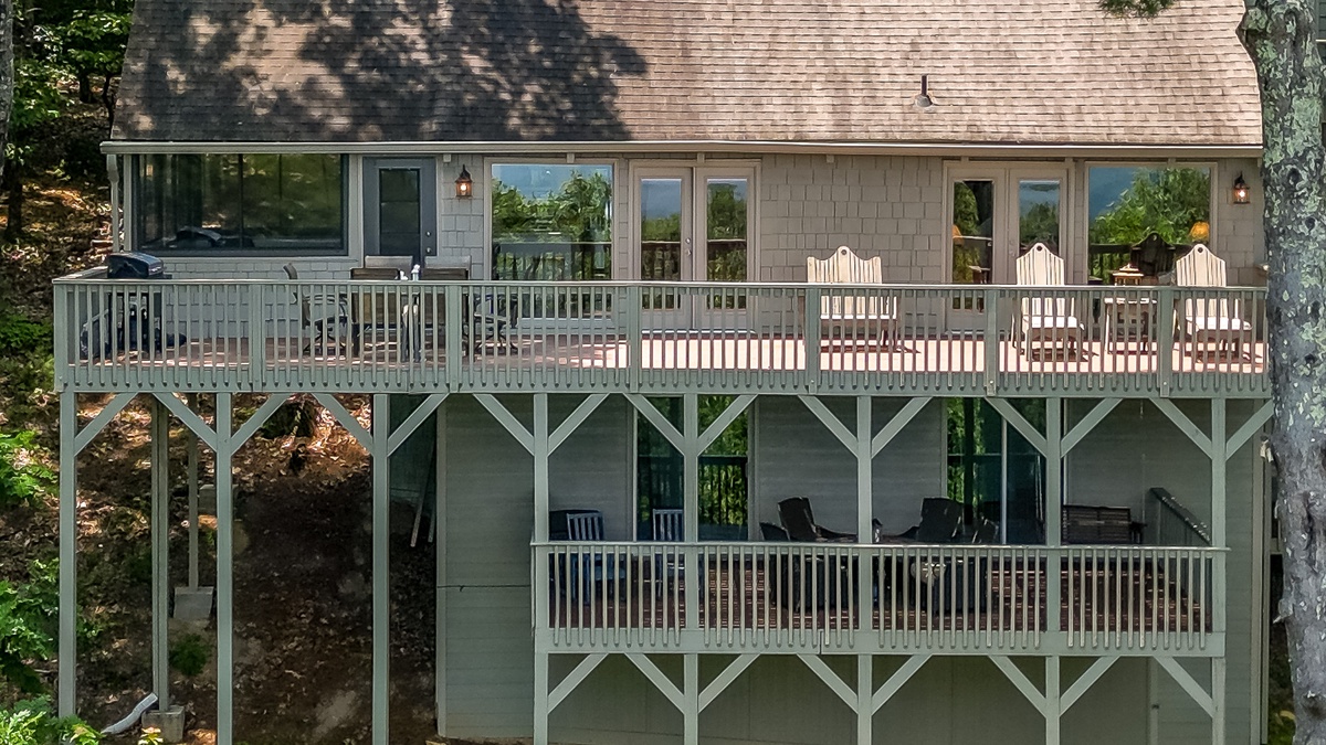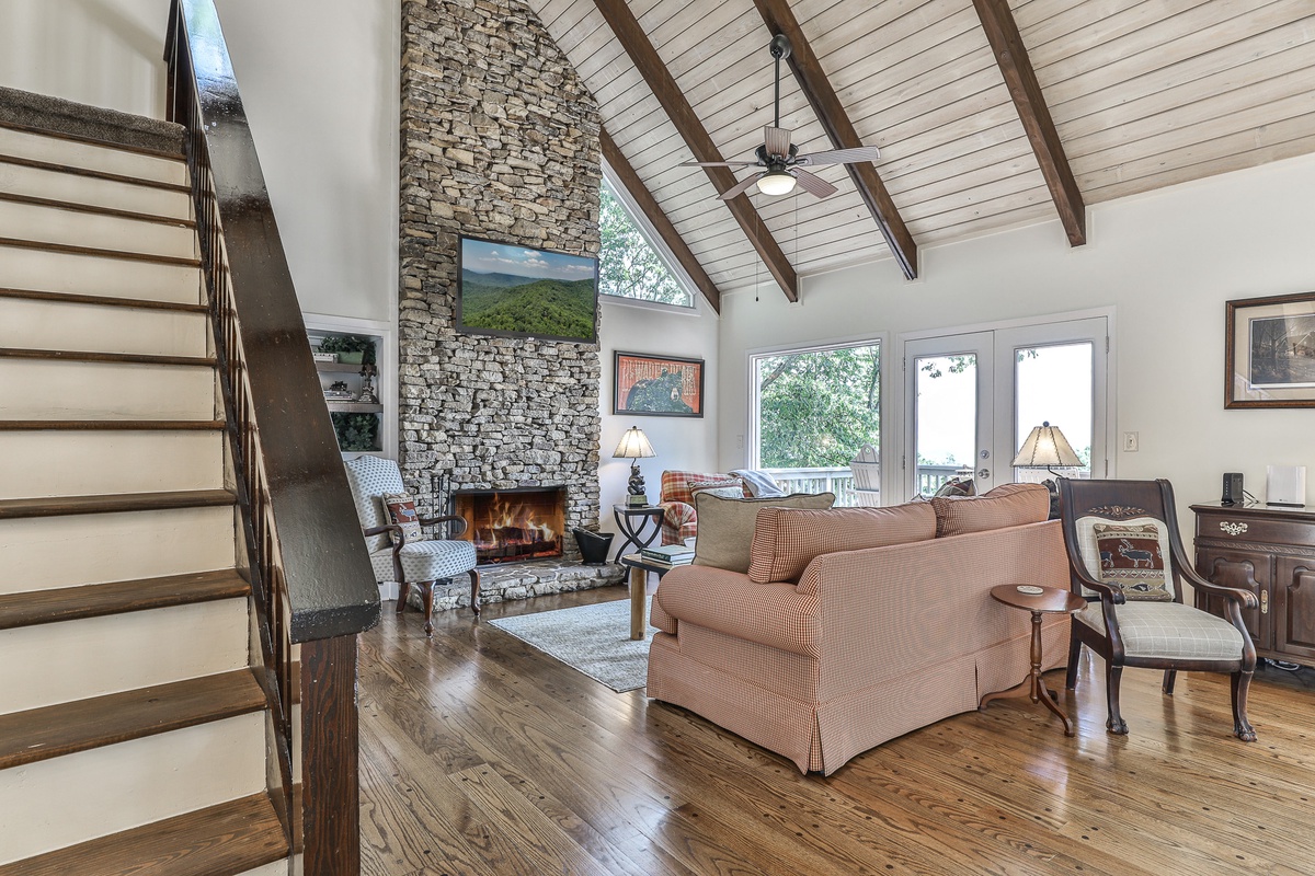 Enter the home easily from the flat driveway directly in front of the house, into a large open-plan living space featuring a wall of windows perfect for nature watching. Sip wine, relax, and enjoy the daily breathtaking nature show. The spacious open-plan living area boasts a beautiful vaulted, wood-beamed ceiling, a cozy wood-burning stacked stone fireplace, and large comfortable sofa seating perfect for watching the fire or game night. Outdoor decks provide space for relaxation, and a gas grill offers views that will wow any BBQ chef. At the back, a gorgeous sitting porch offers relaxed seating any time of day.