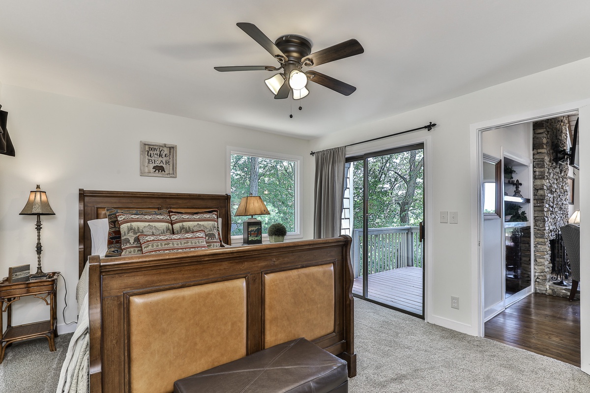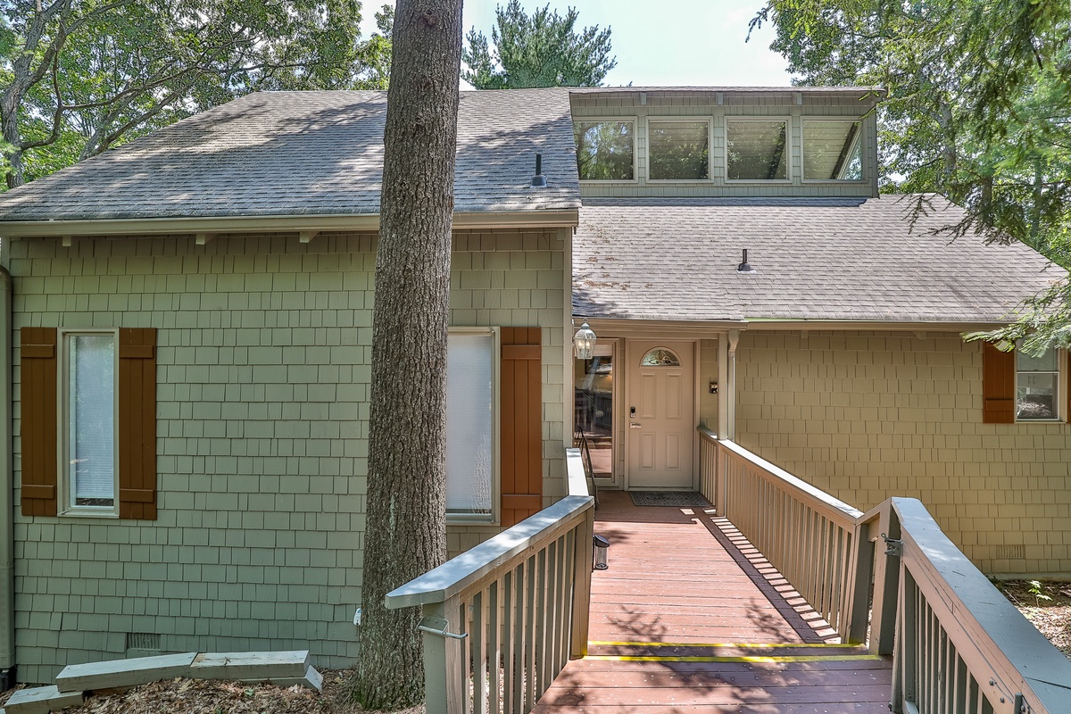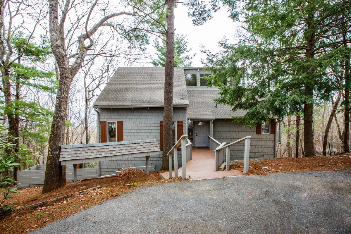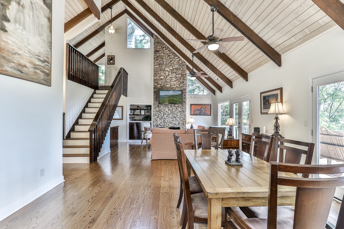 Enter the home easily from the flat driveway directly in front of the house, into a large open-plan living space featuring a wall of windows perfect for nature watching. Sip wine, relax, and enjoy the daily breathtaking nature show. The spacious open-plan living area boasts a beautiful vaulted, wood-beamed ceiling, a cozy wood-burning stacked stone fireplace, and large comfortable sofa seating perfect for watching the fire or game night. Outdoor decks provide space for relaxation, and a gas grill offers views that will wow any BBQ chef. At the back, a gorgeous sitting porch offers relaxed seating any time of day.